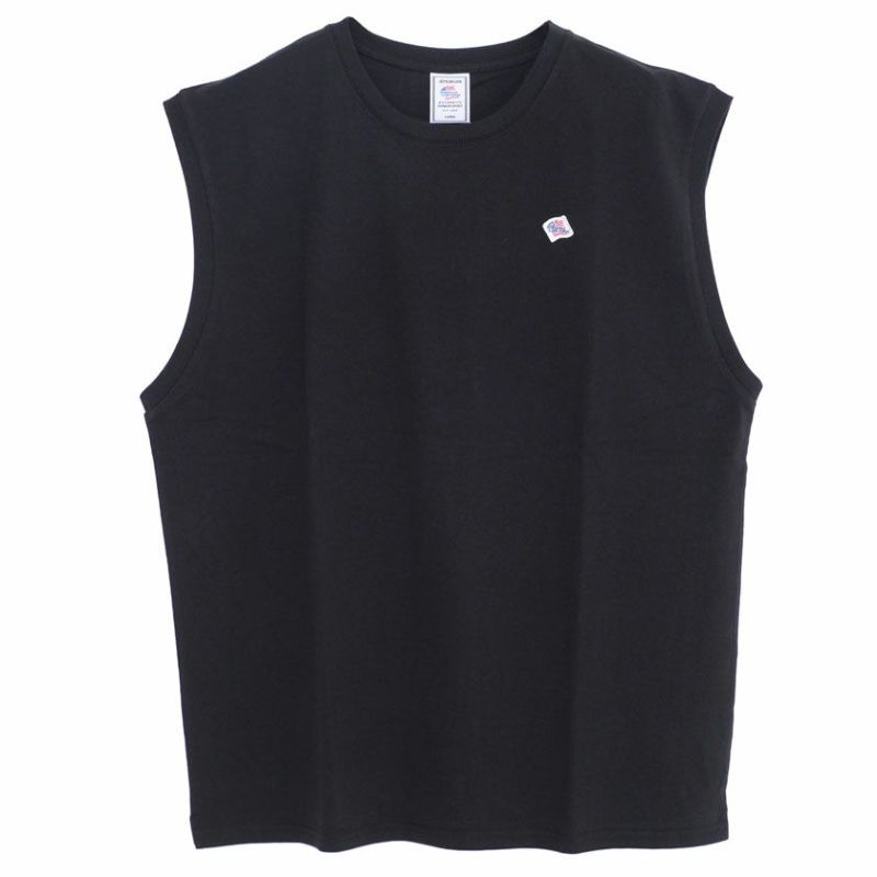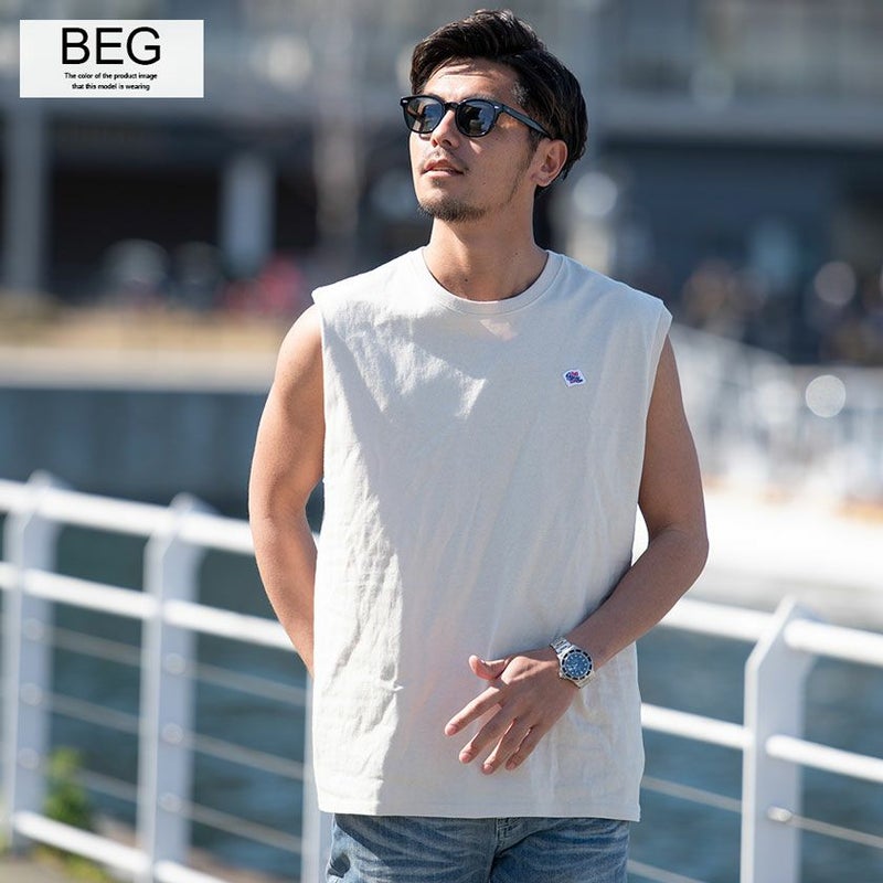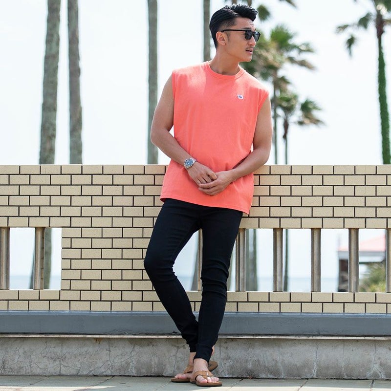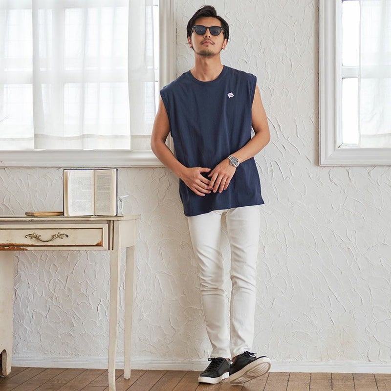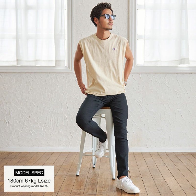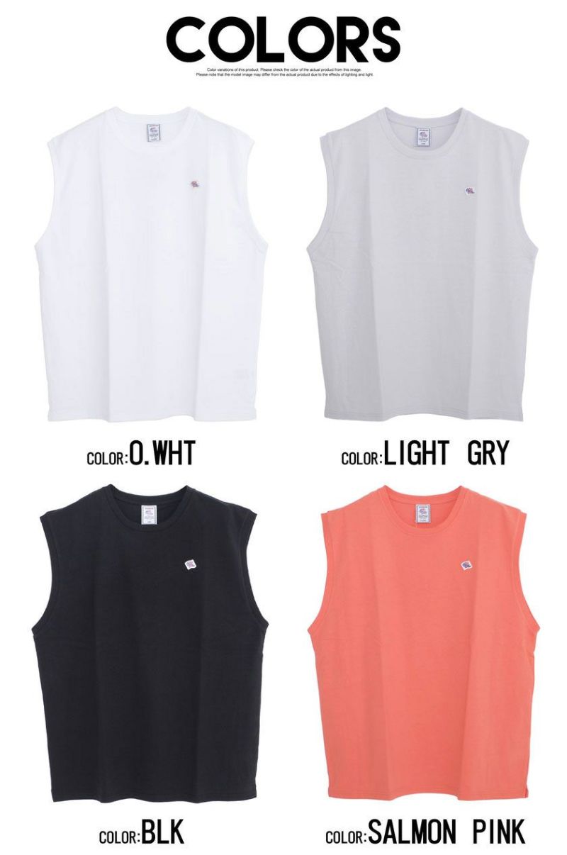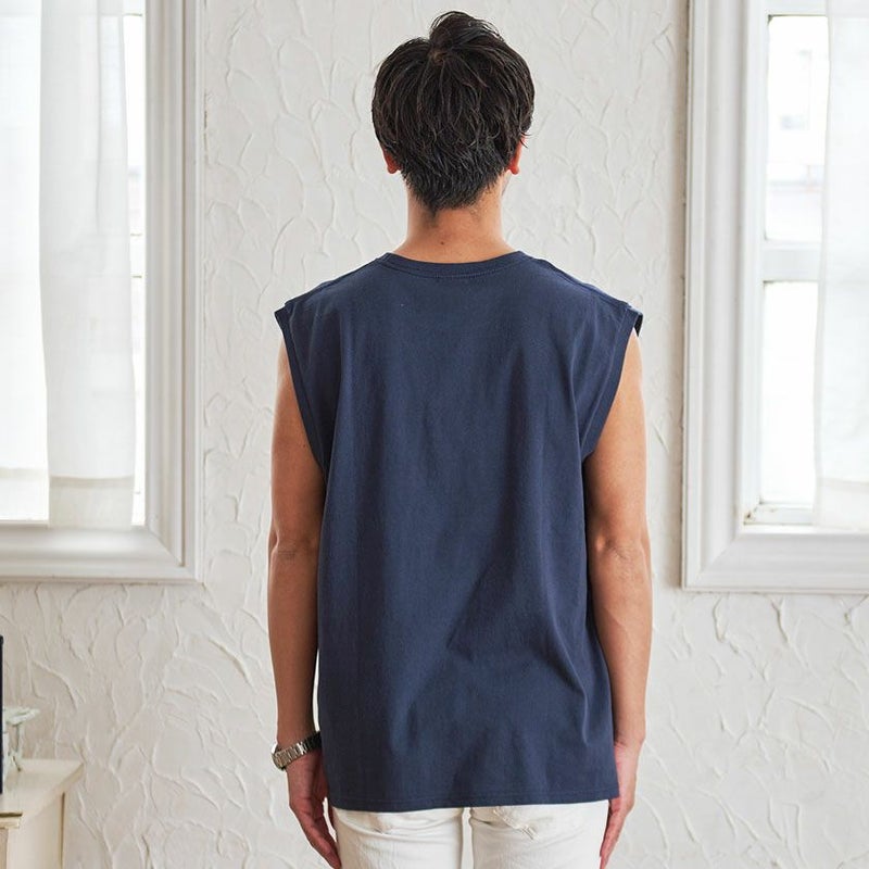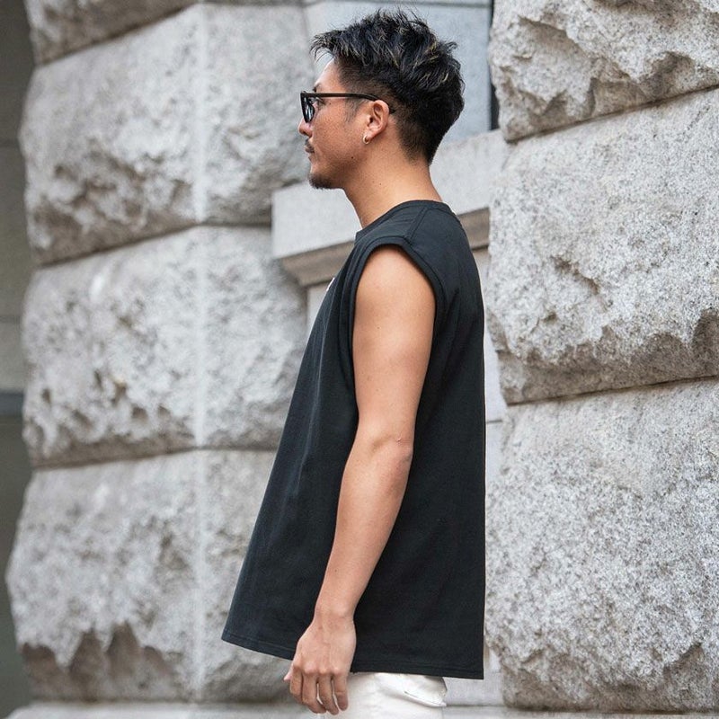左胸にブランドロゴのワッペンを施したシンプルなデザインのノースリーブTシャツ。