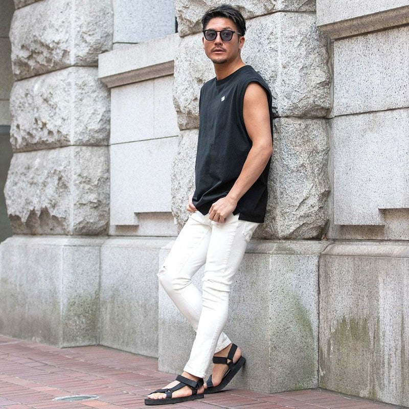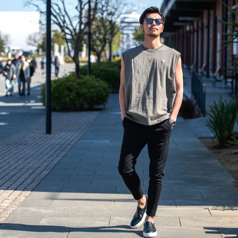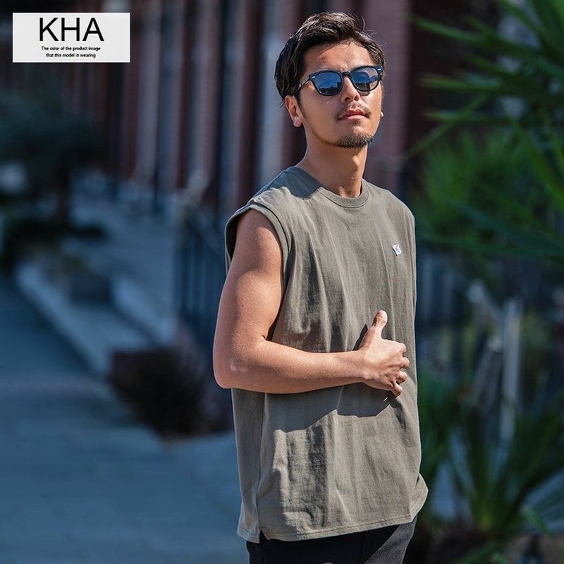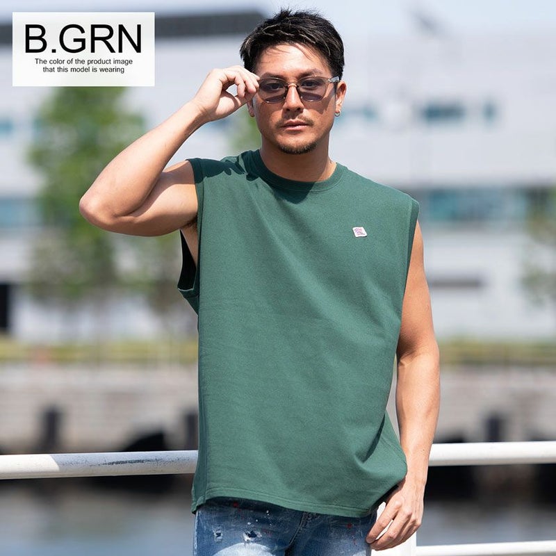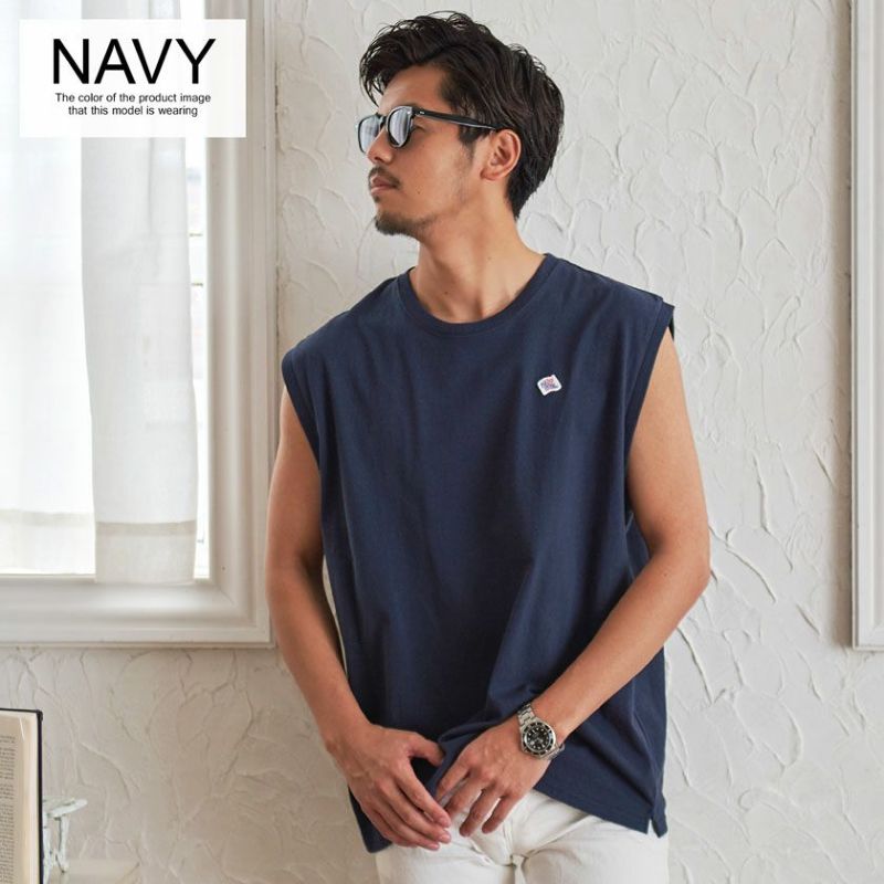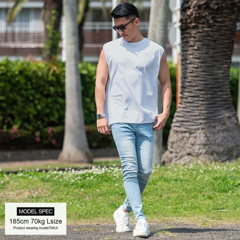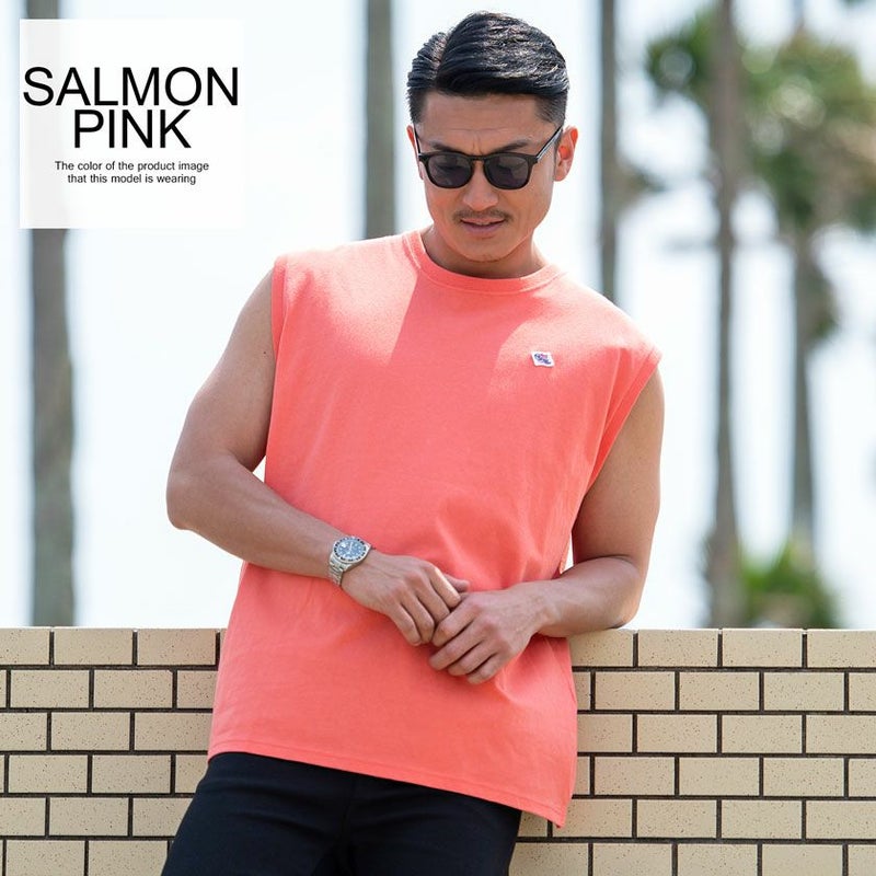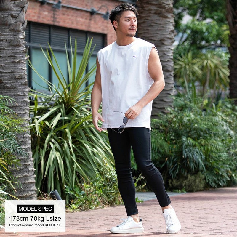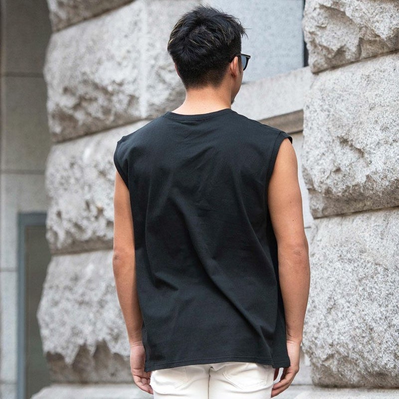 左胸にブランドロゴのワッペンを施したシンプルなデザインのノースリーブTシャツ。
