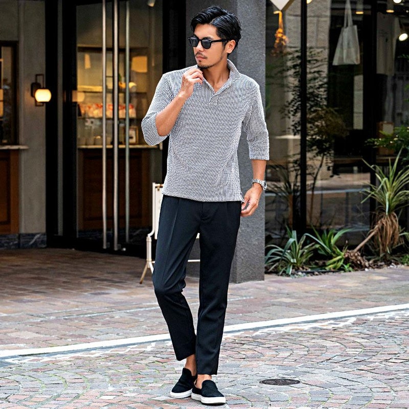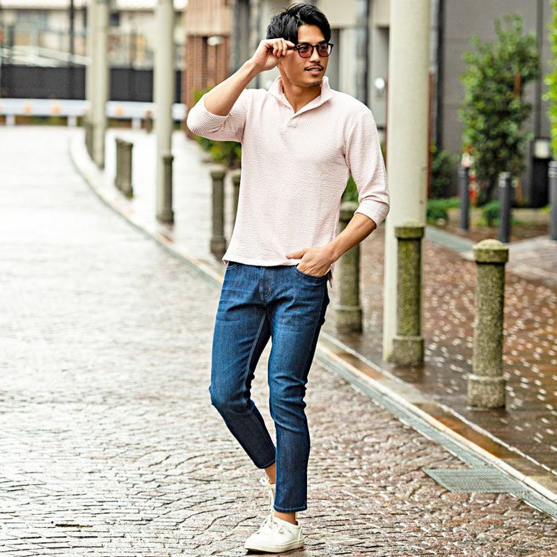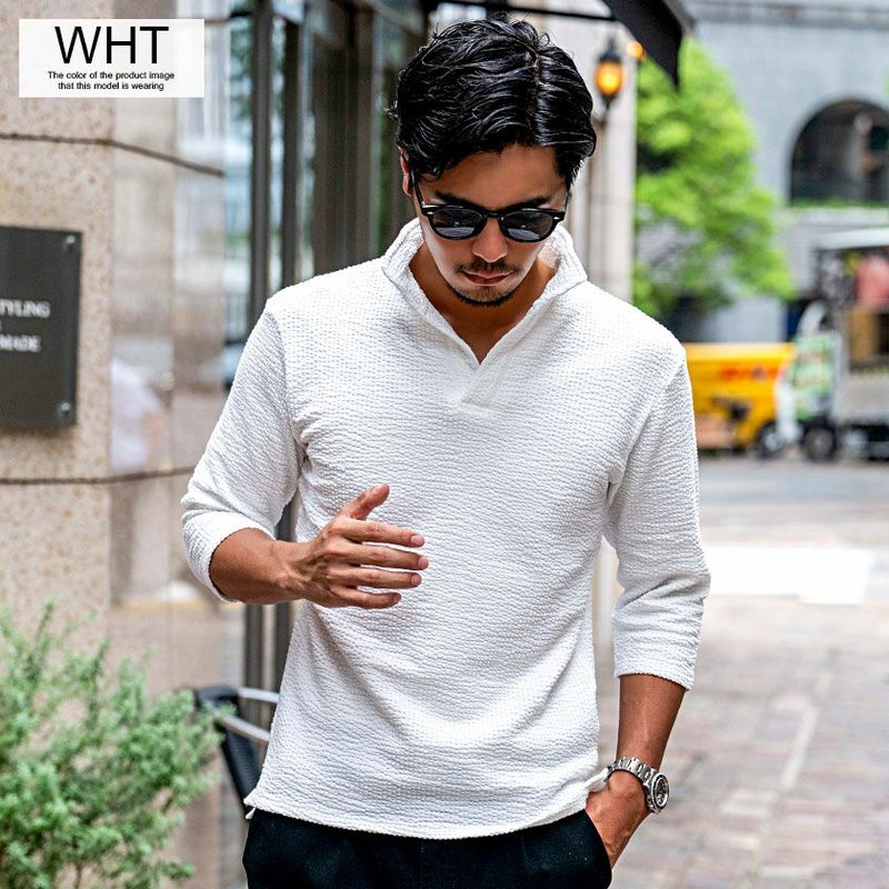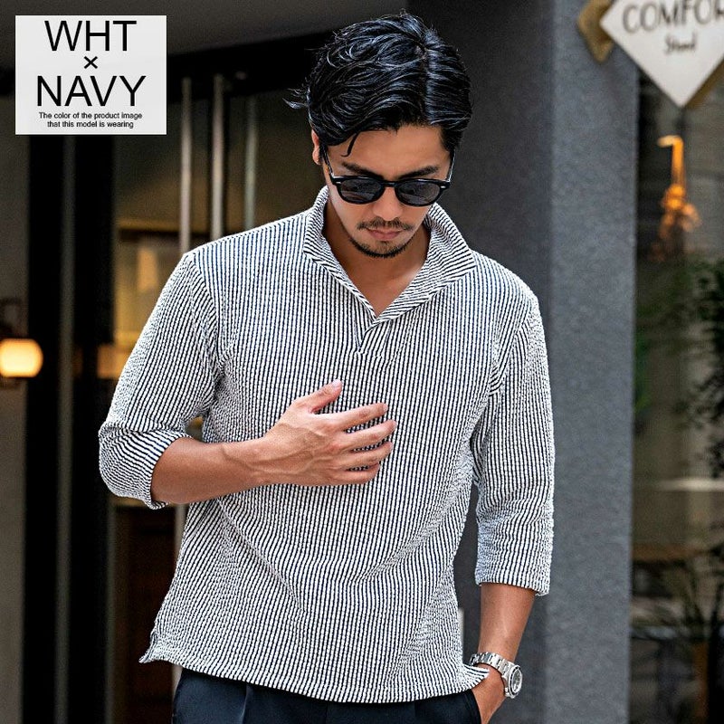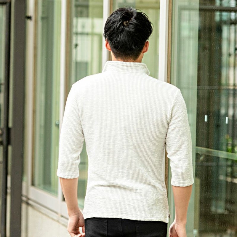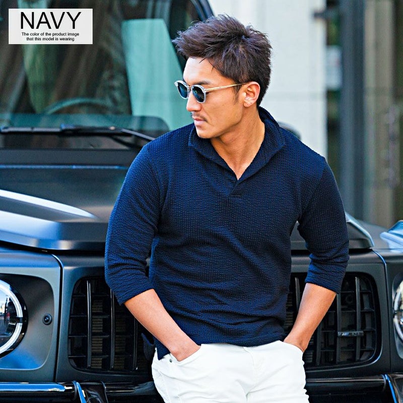 襟元が開いたスキッパータイプのポロシャツなので首元をスッキリと綺麗に見せてくれます。