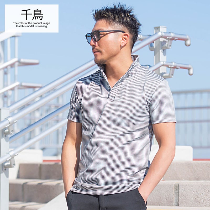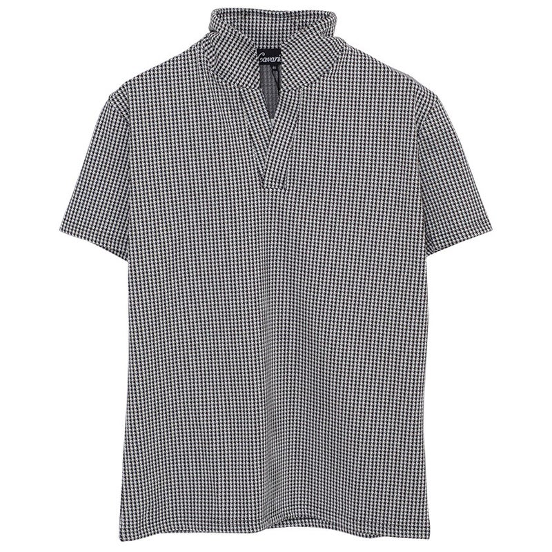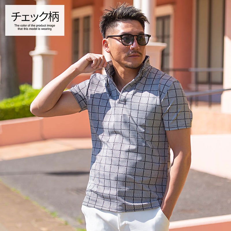 ポロシャツ メンズ おしゃれ 半袖 ポロ ストレッチ スキッパー 細身 チェック 総柄 カジュアル 大人 ブランド ゴルフ ゴルフウェア ゴルフウエア 立襟 父の日 メンズファッション 春 夏 CavariA(キャバリア)チェック柄イタリアンカラー半袖ポロシャツ/全3色