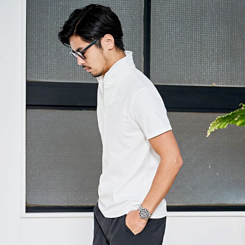 スキッパータイプの開いた襟元が、顔周りをすっきり爽やかに見せてくれます。