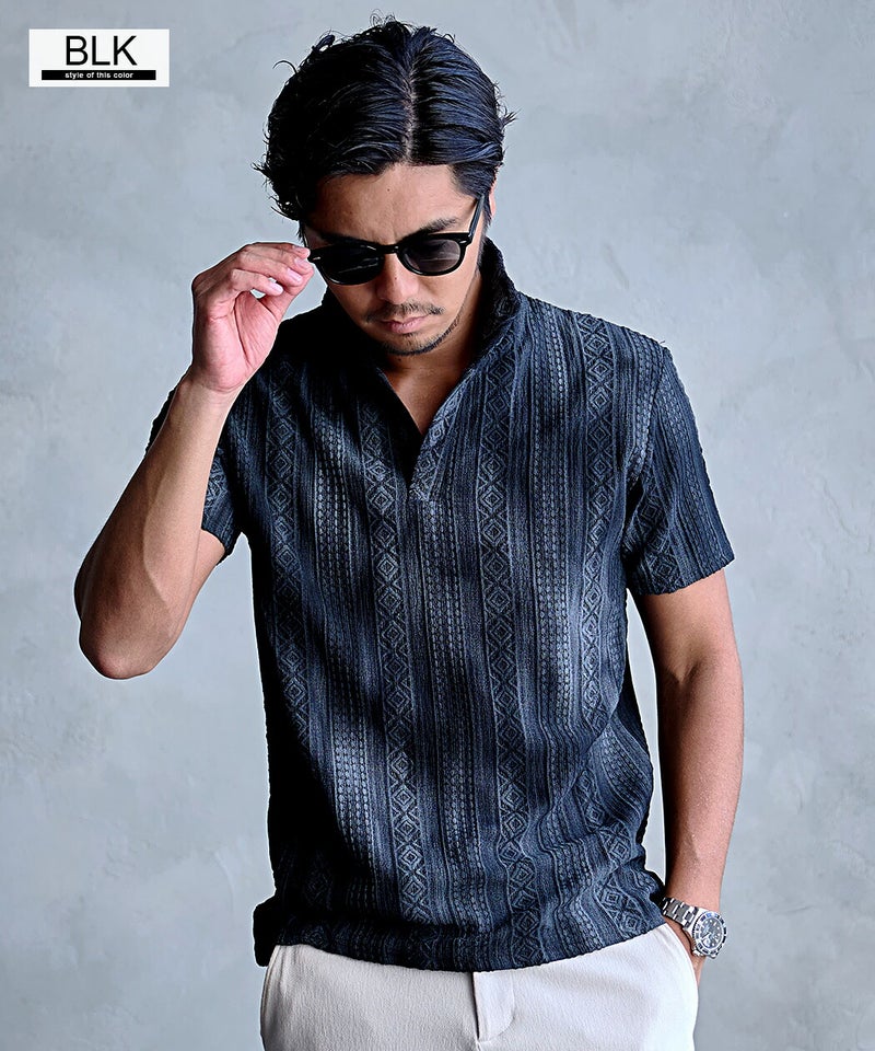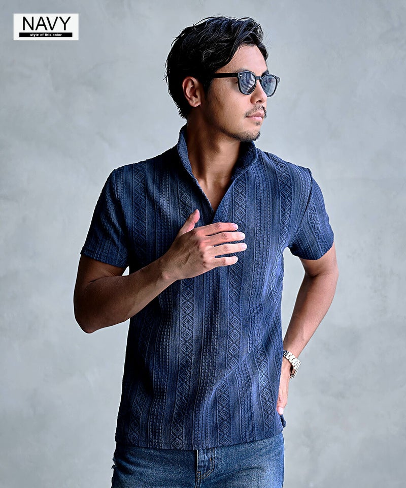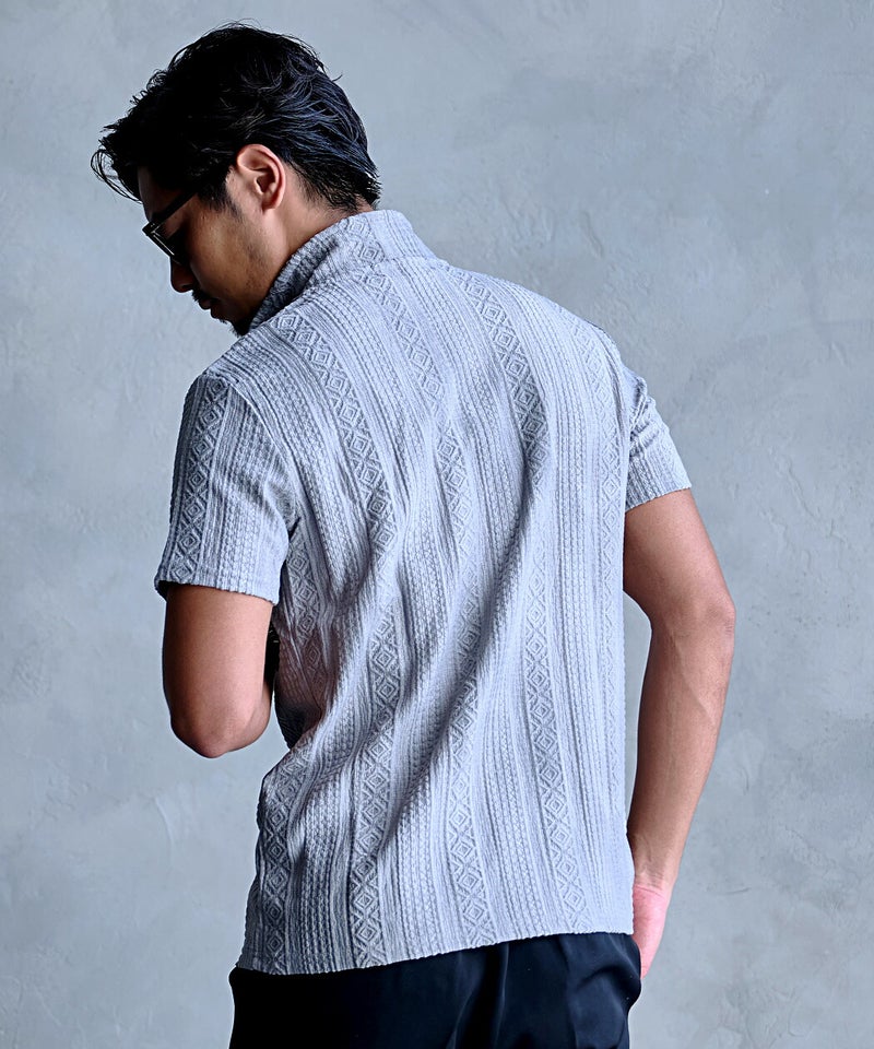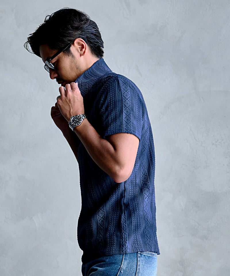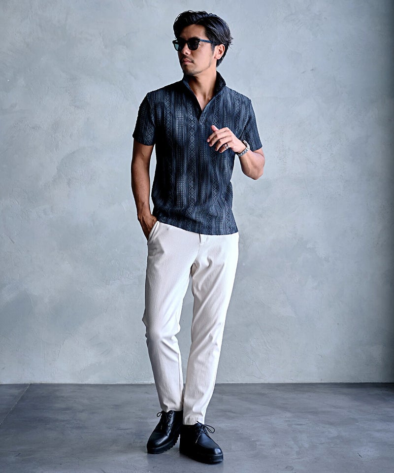 襟元は色気を演出するイタリアンカラー仕様。ボタンレスでラフに着られながらも、首元に抜け感と上品さをプラス。