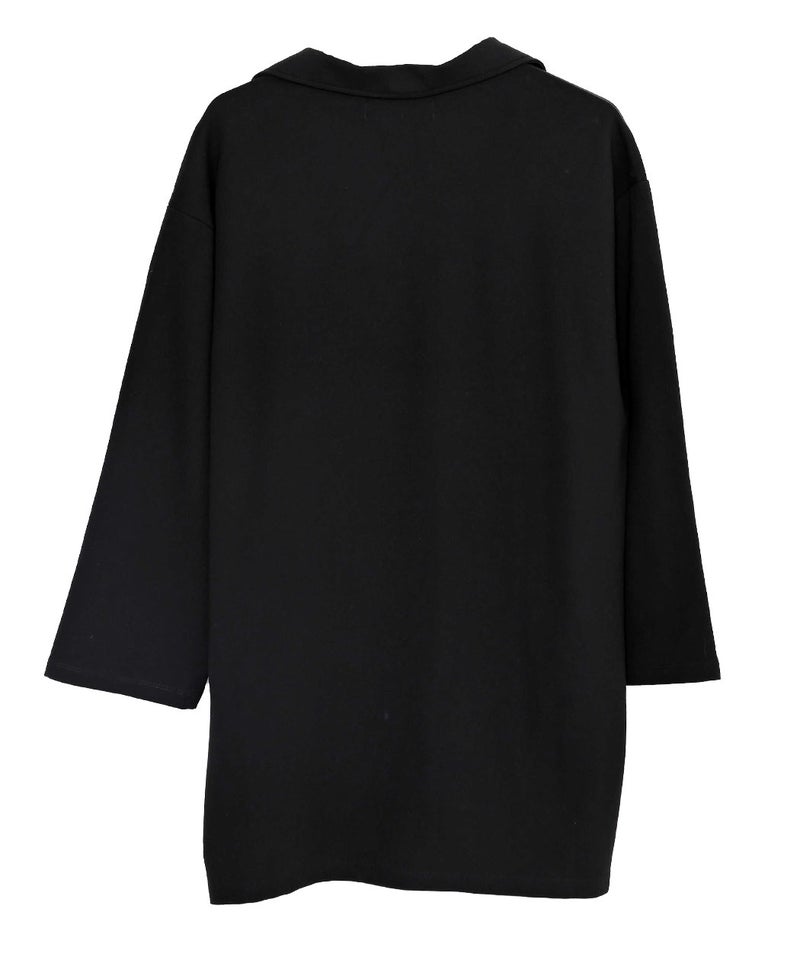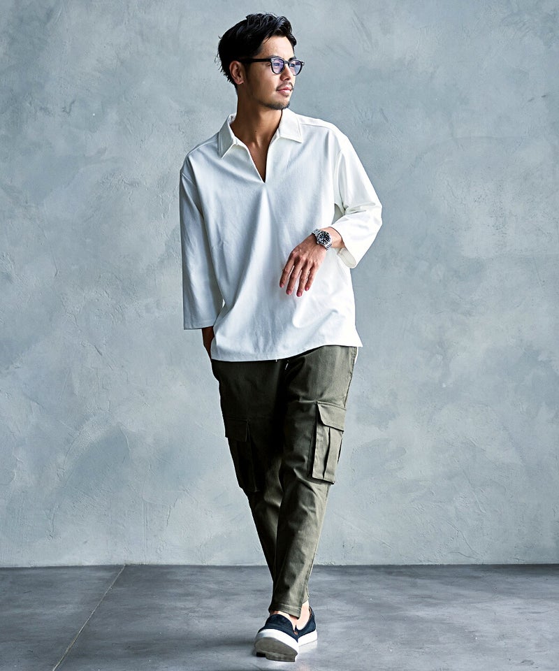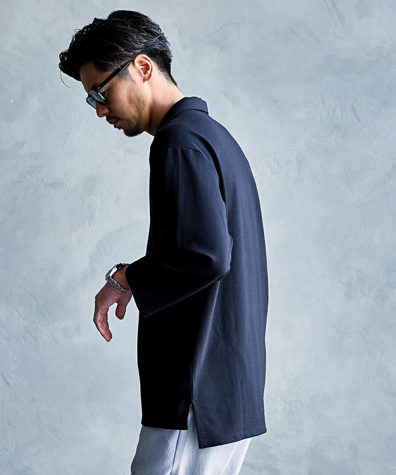身幅にゆとりを持たせ、ドロップショルダーと広めの袖周りで構成。