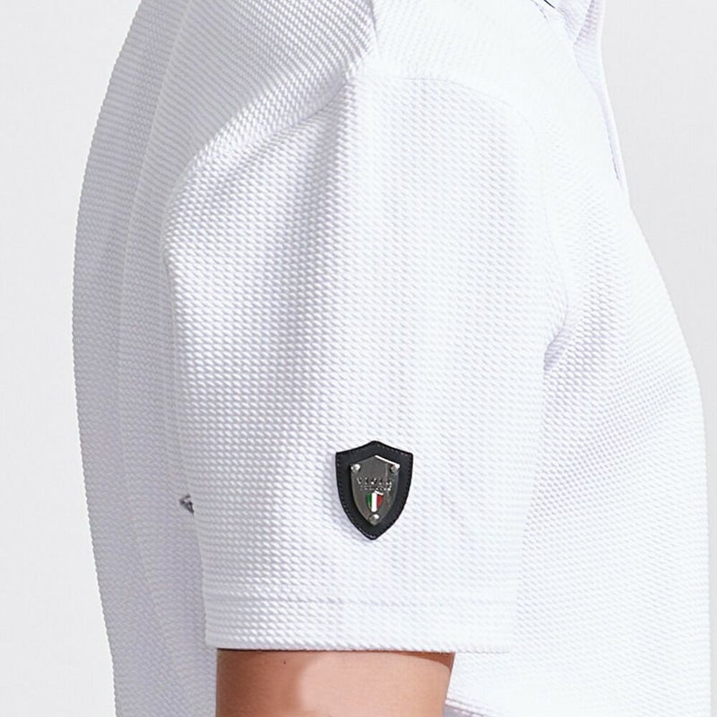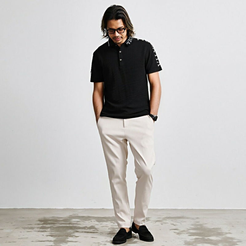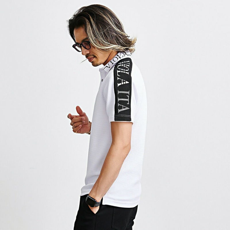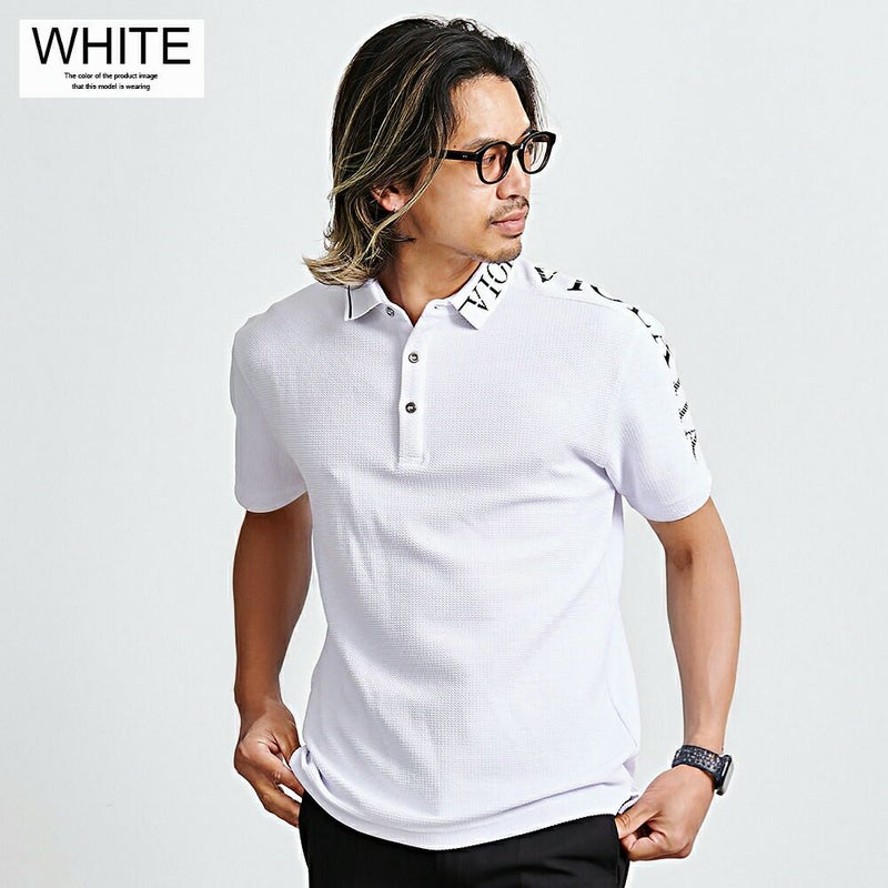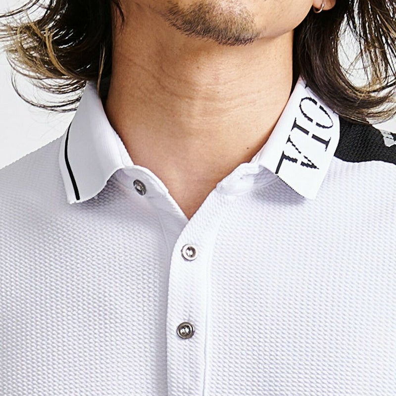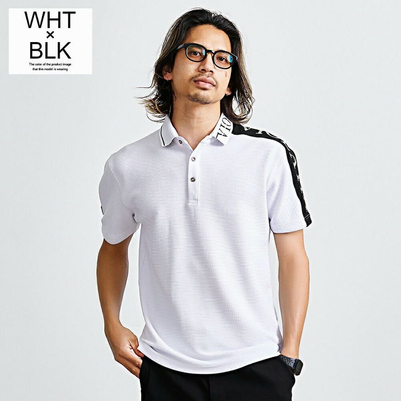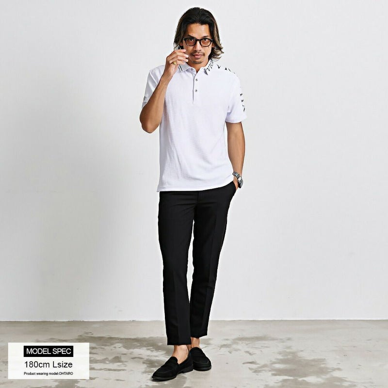 肩から左袖にかけて切り替えロゴをあしらったインパクト抜群の半袖ポロシャツ。