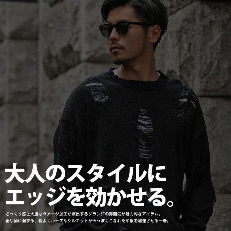 大胆なダメージ加工を施し古着のような風合いに仕上げたざっくりニット。