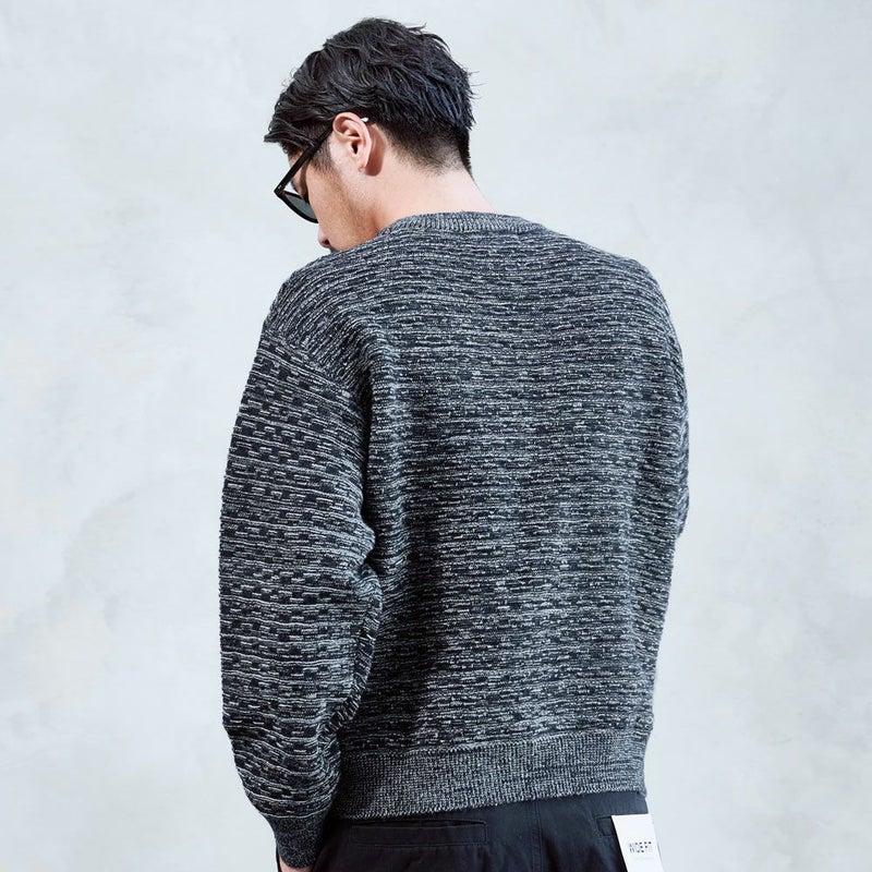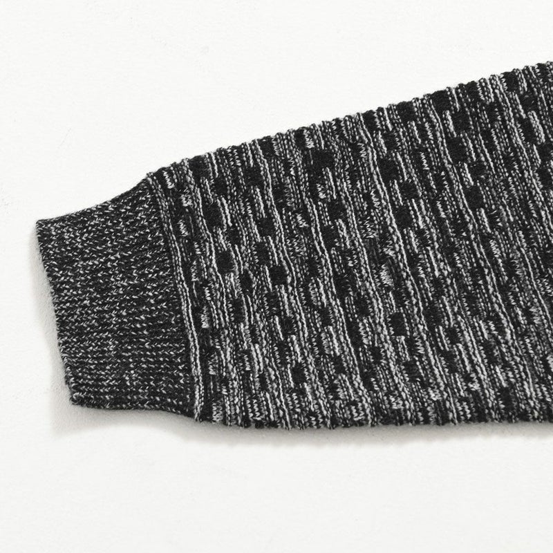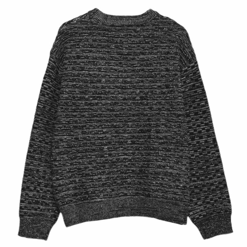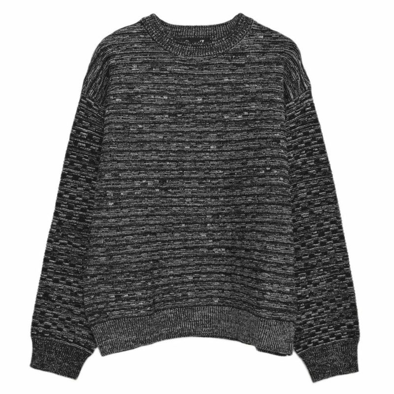 全体に施されたブロック調の編み柄が、無地ニットにはない立体感を演出。