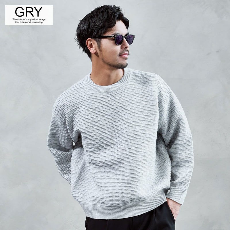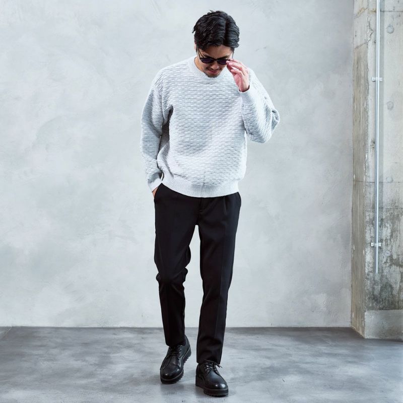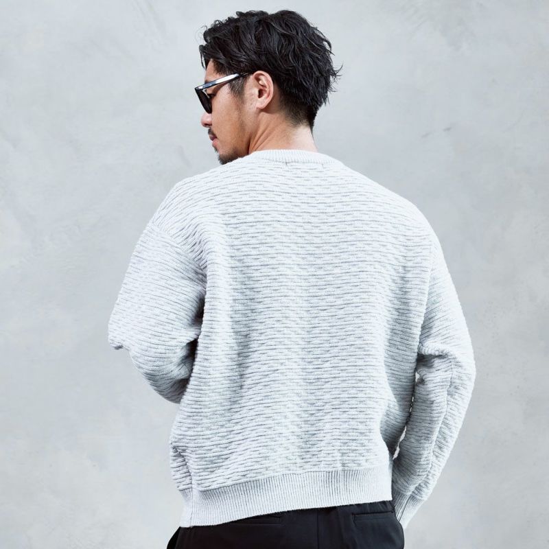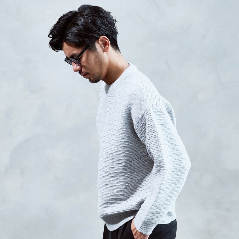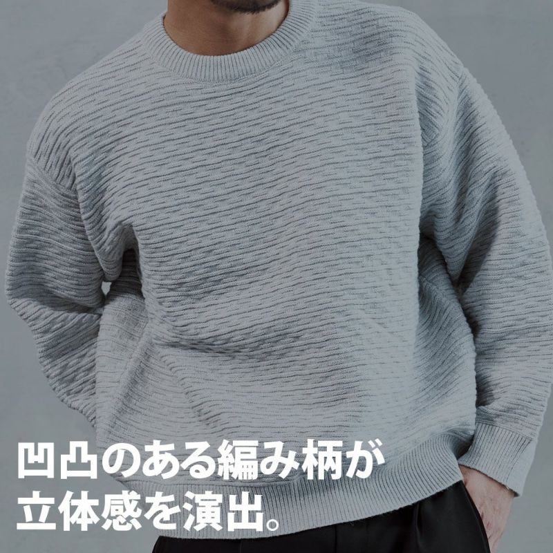 凹凸のある編地が視覚的なアクセントとなり、1枚で着ても存在感のある仕上がりです。