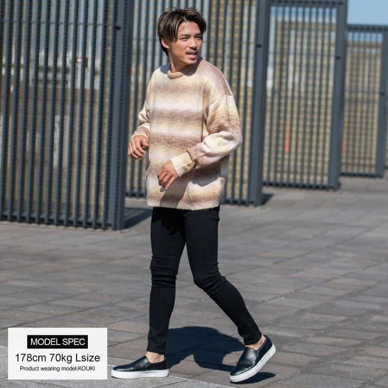 ふわっとした起毛のグラデーションのように段染めされたボーダー柄ルーズサイズニット。