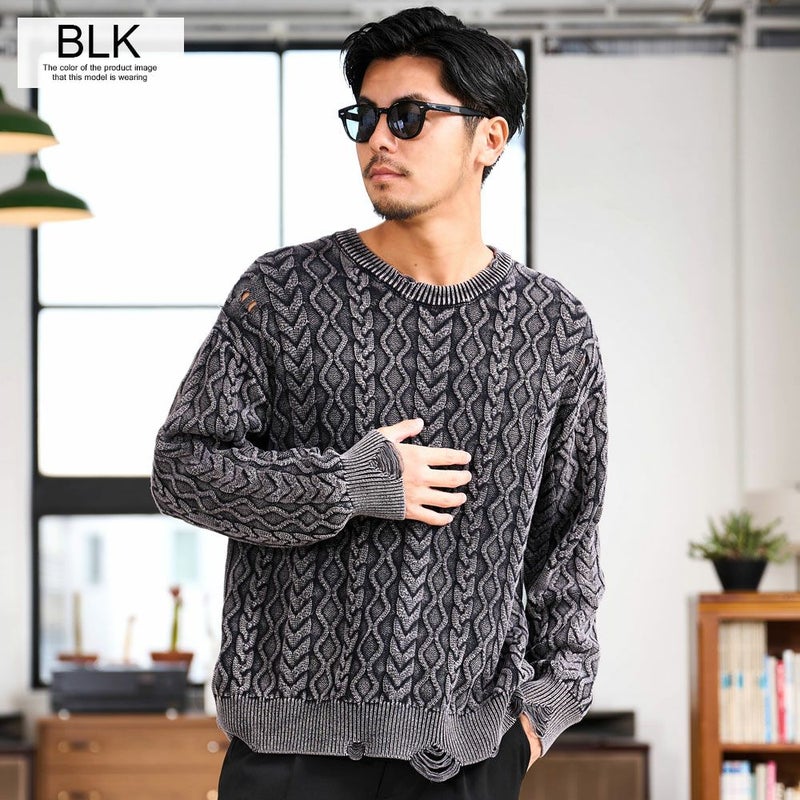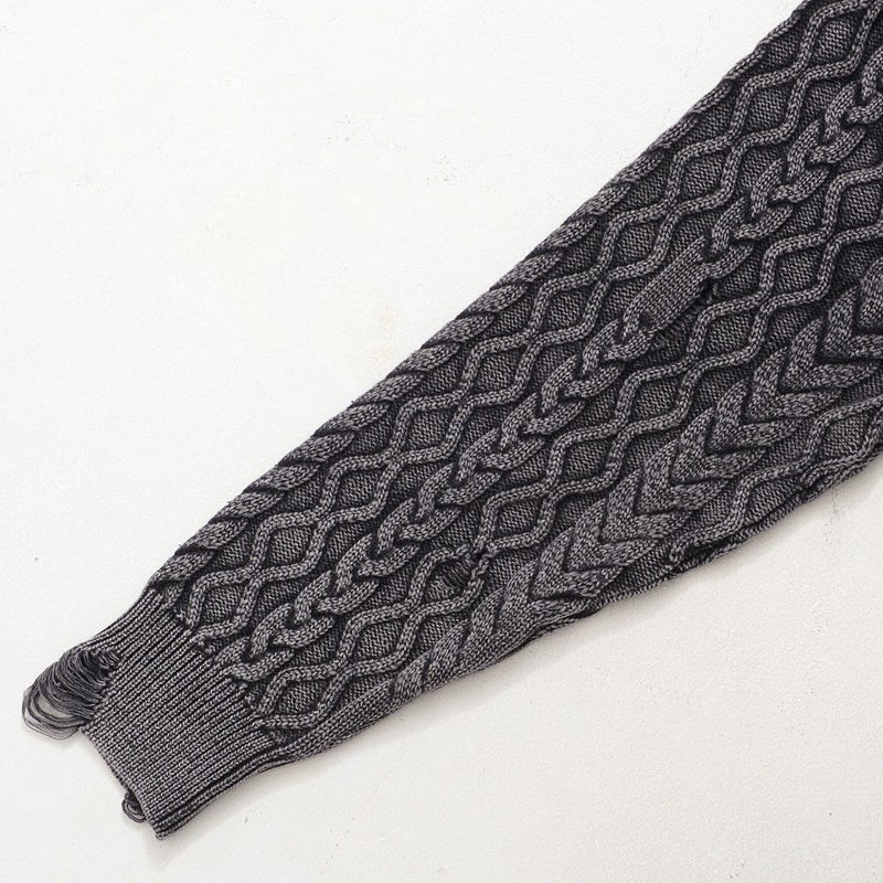 立体的なケーブル編みをベースに、ストーンウォッシュ加工で味わい深いフェード感をプラス。