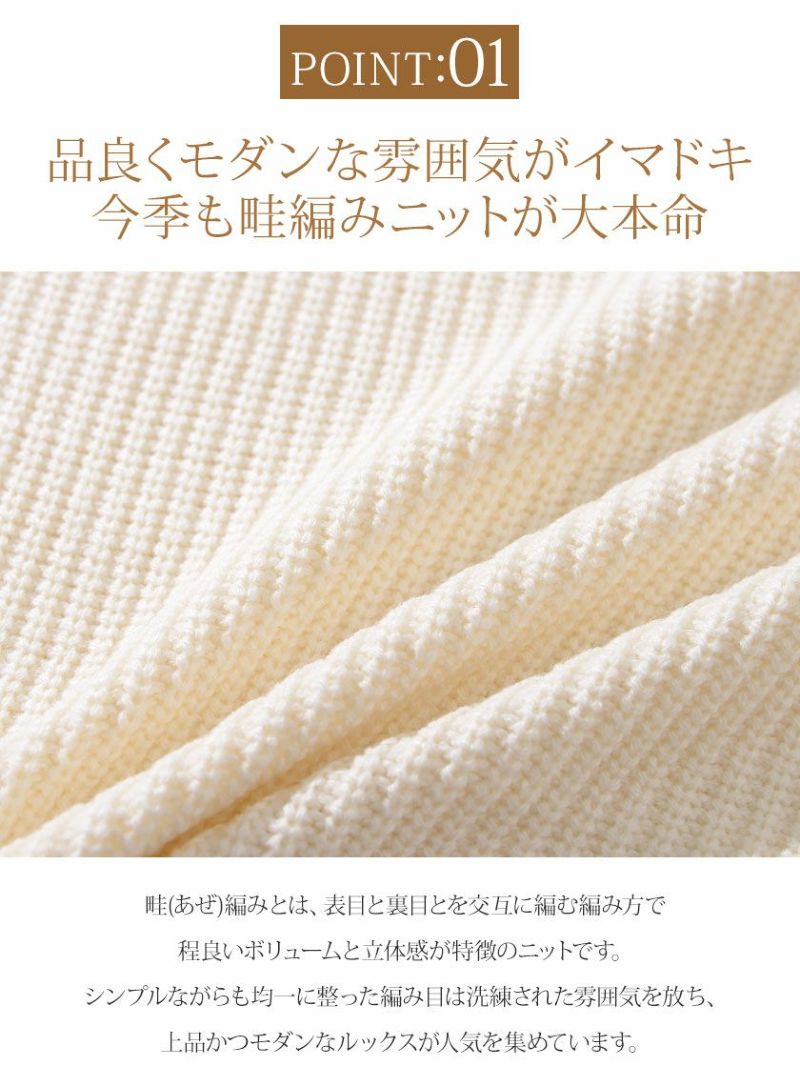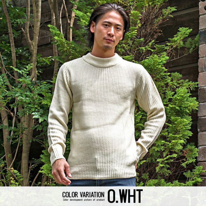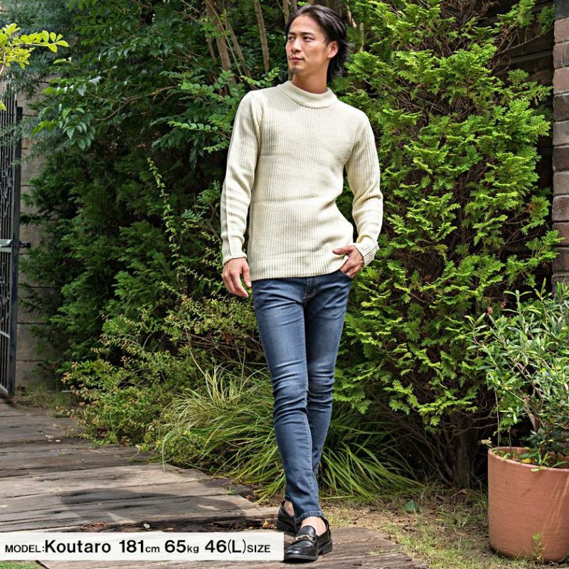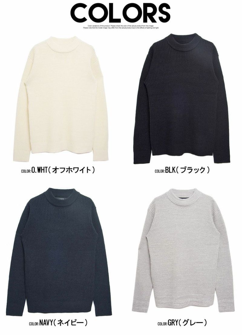 編み目の大きなローゲージニットに、程よく首元を包み込むモックネックデザインを採用。