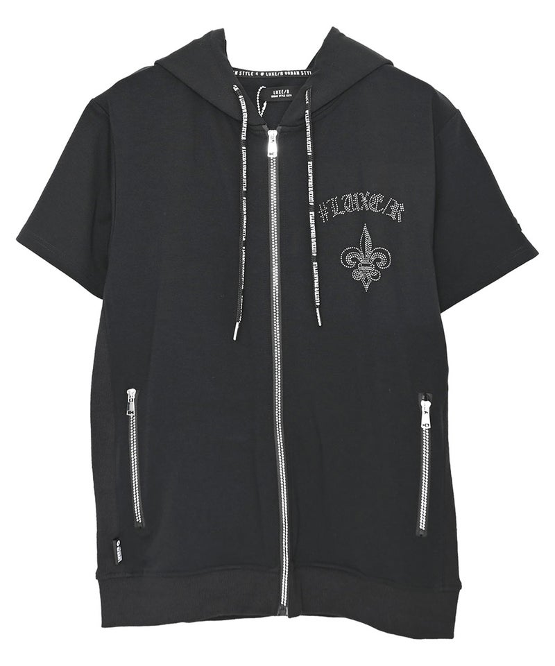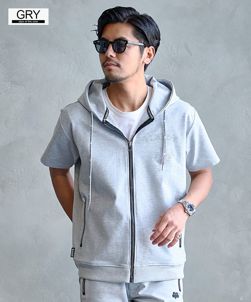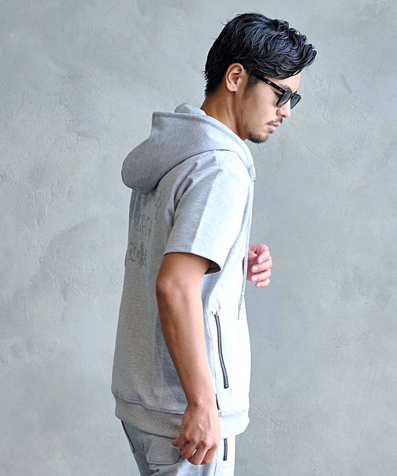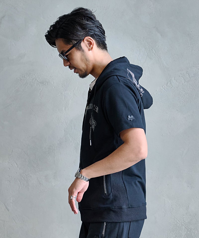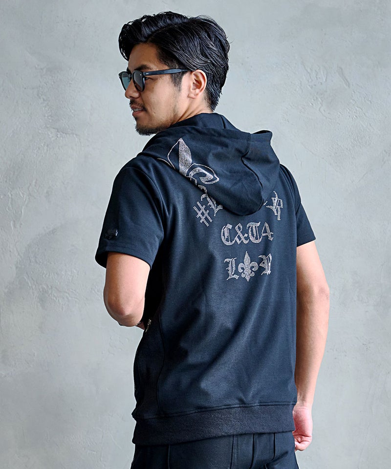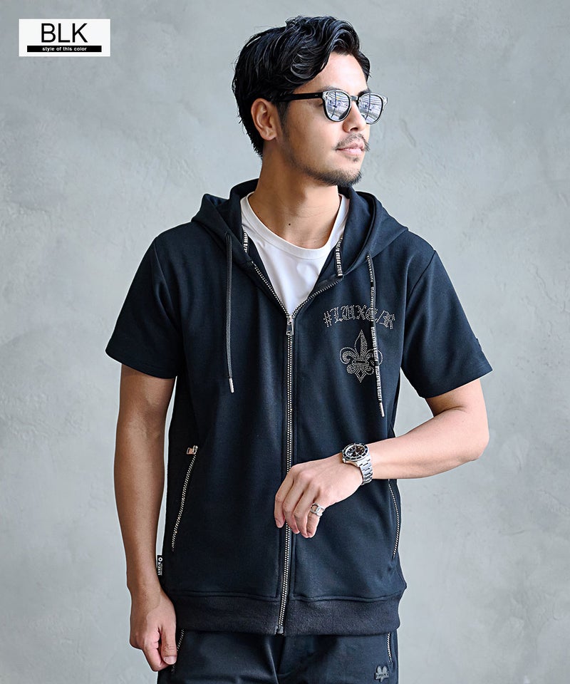 上品な輝きを放つラインストーンが目を引く、存在感のある半袖ジップパーカー。