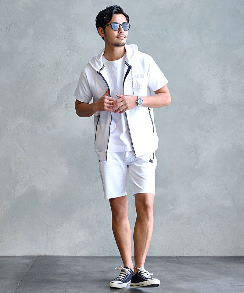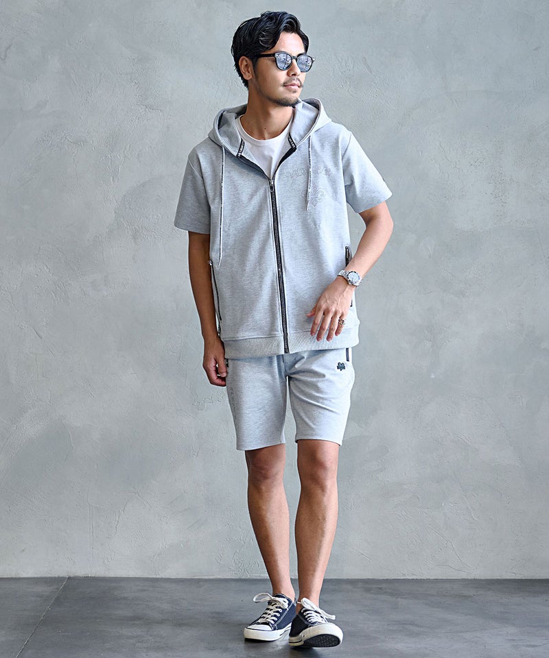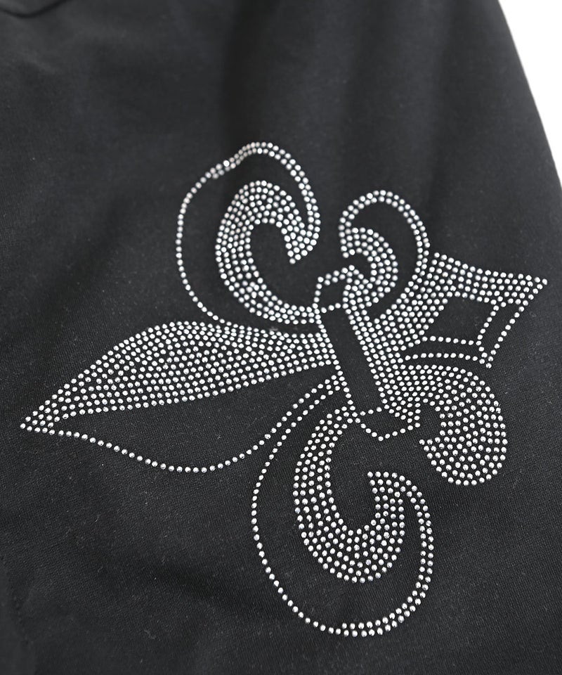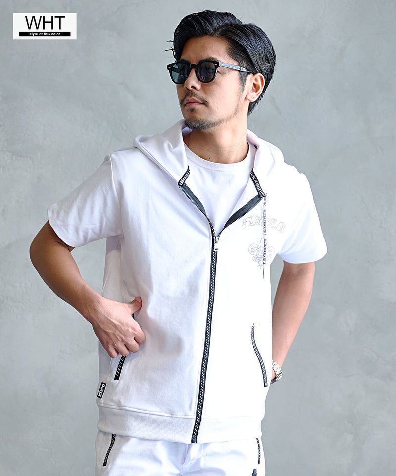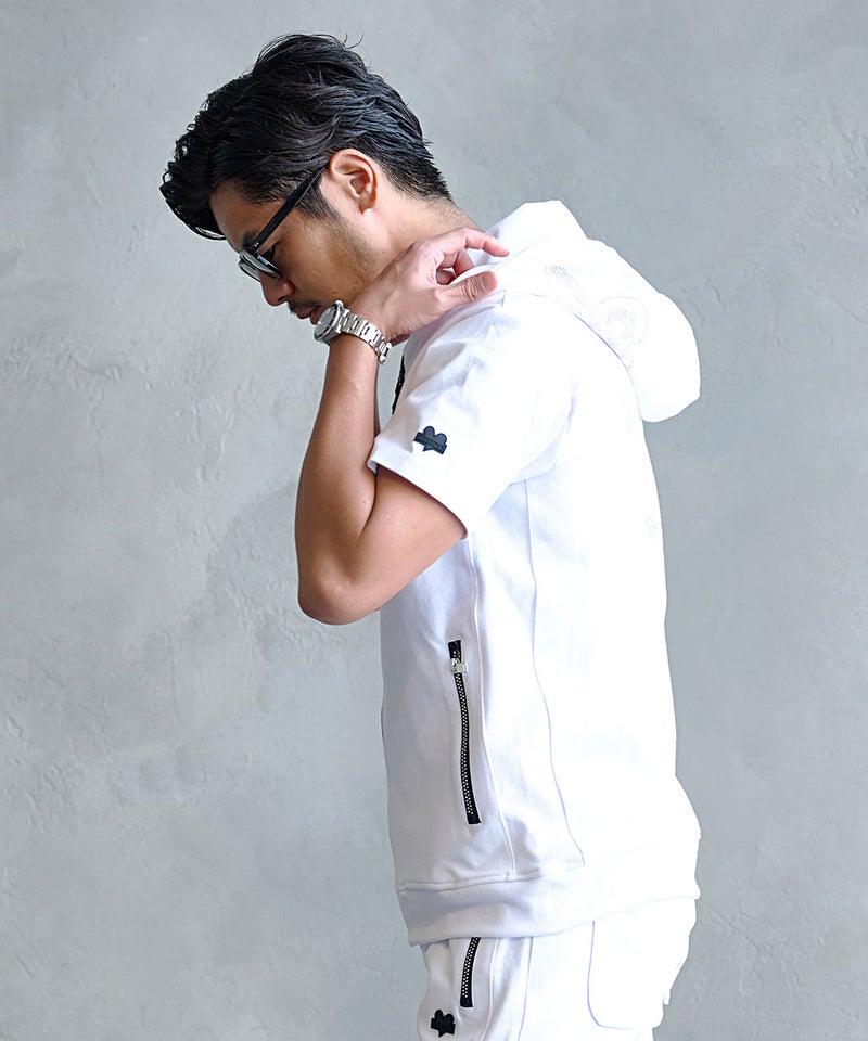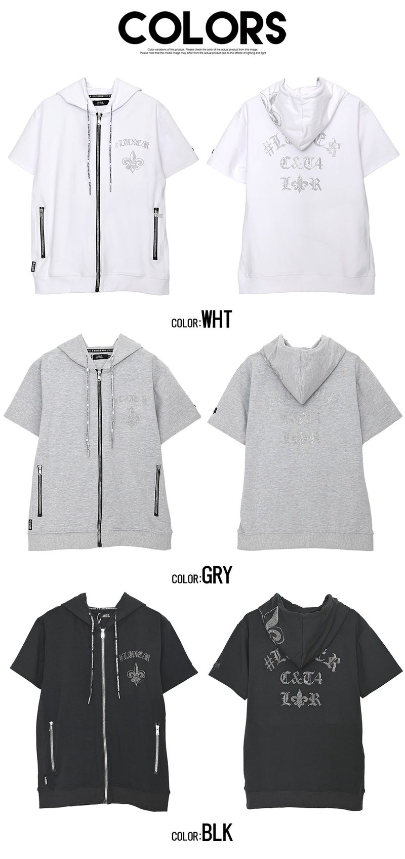 上品な輝きを放つラインストーンが目を引く、存在感のある半袖ジップパーカー。