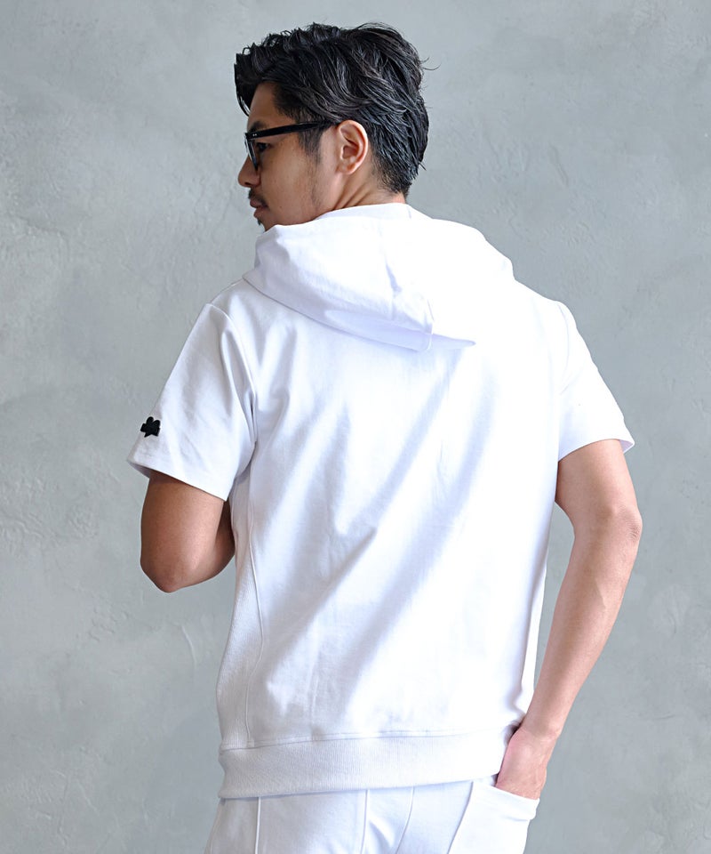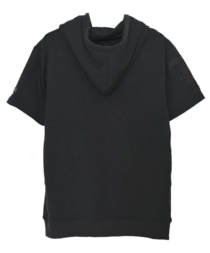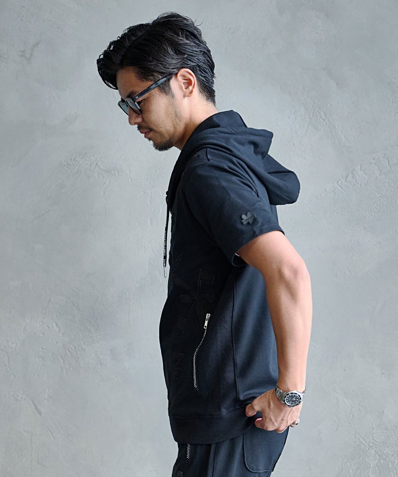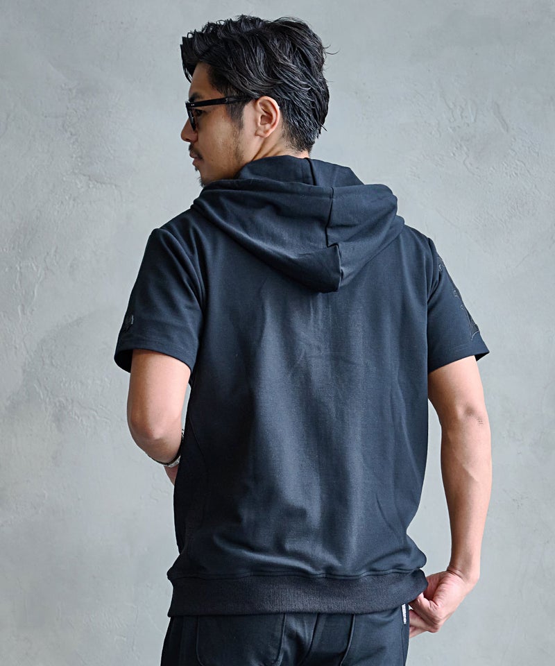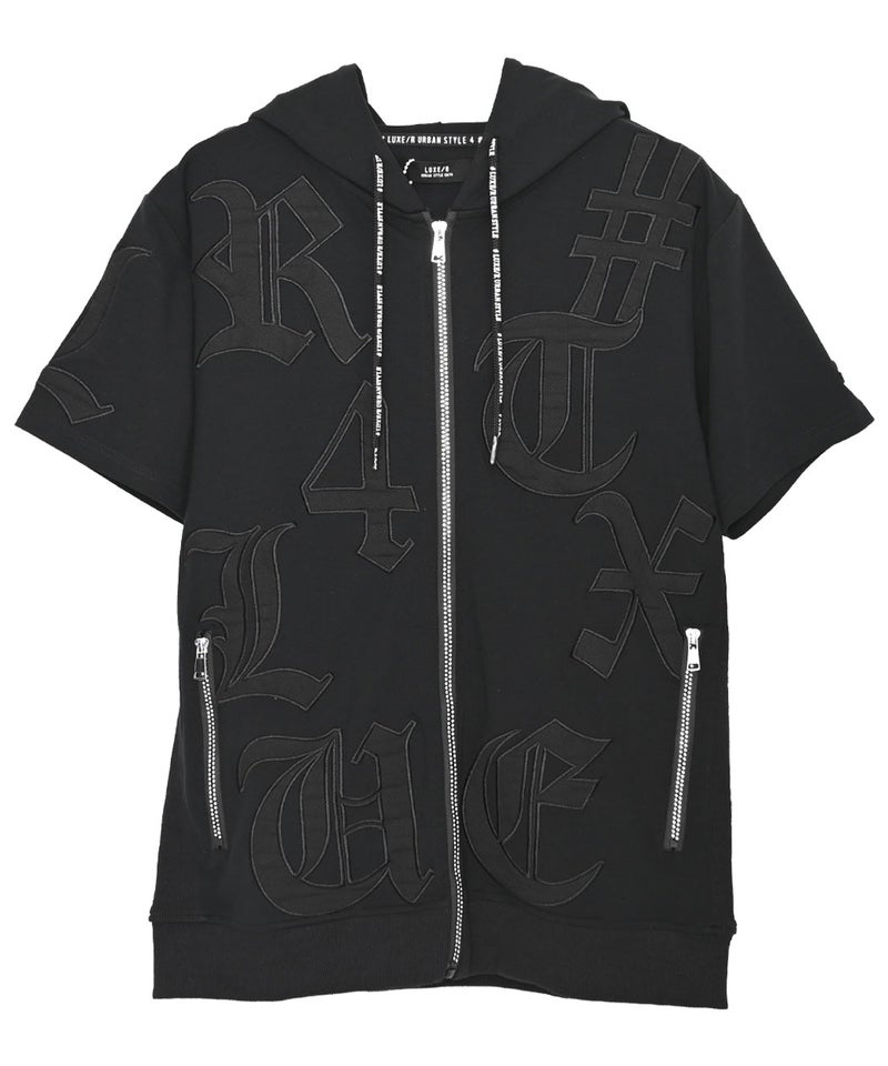 立体的なロゴワッペンが目を引く、存在感のある半袖ジップパーカー。
