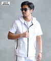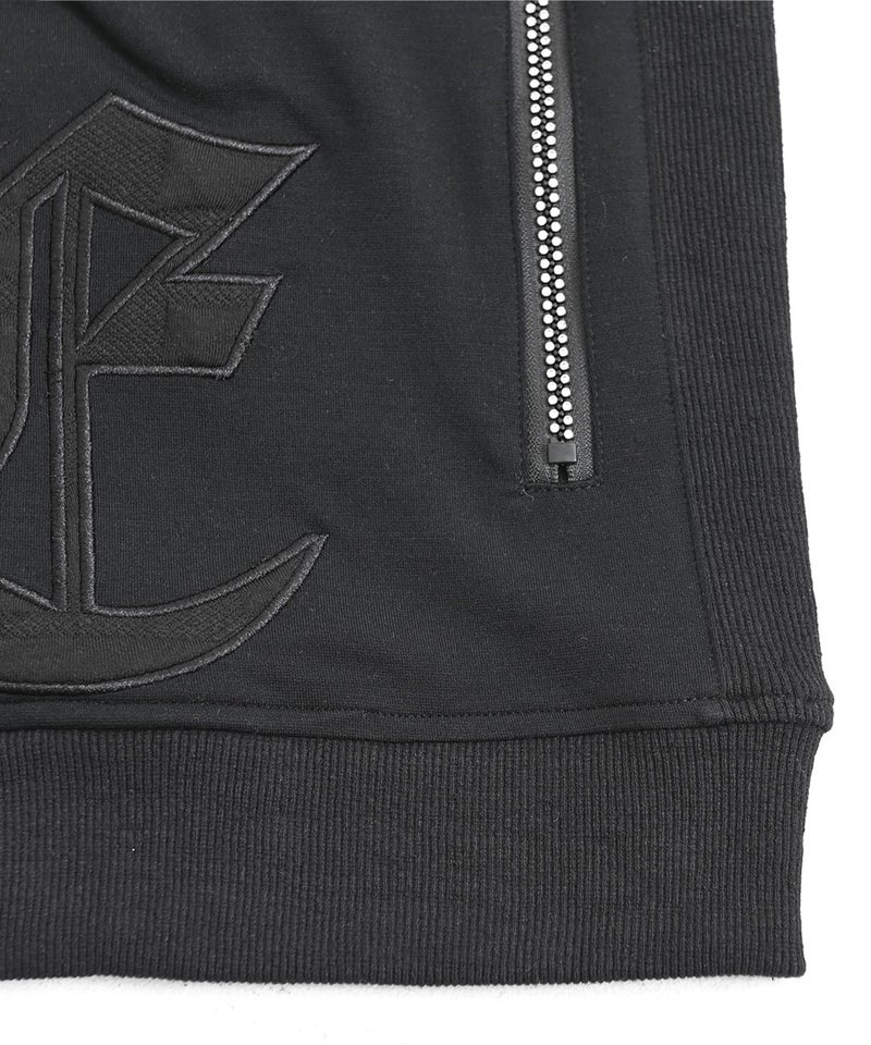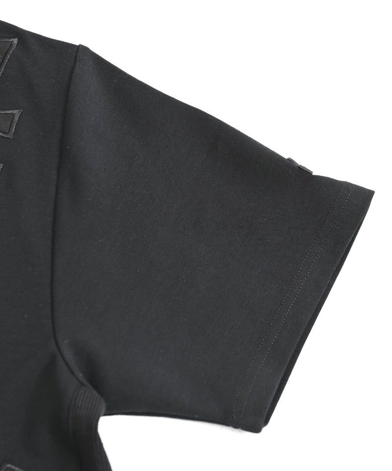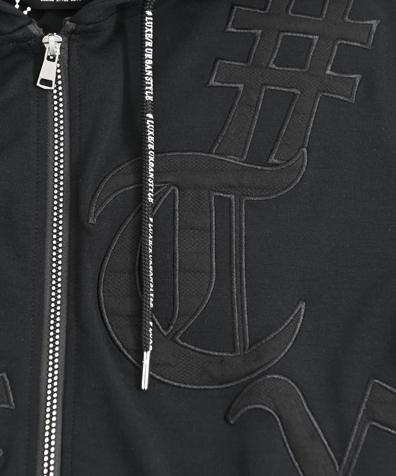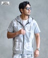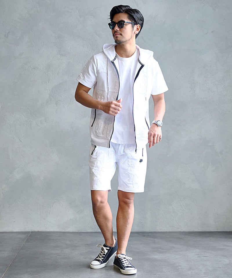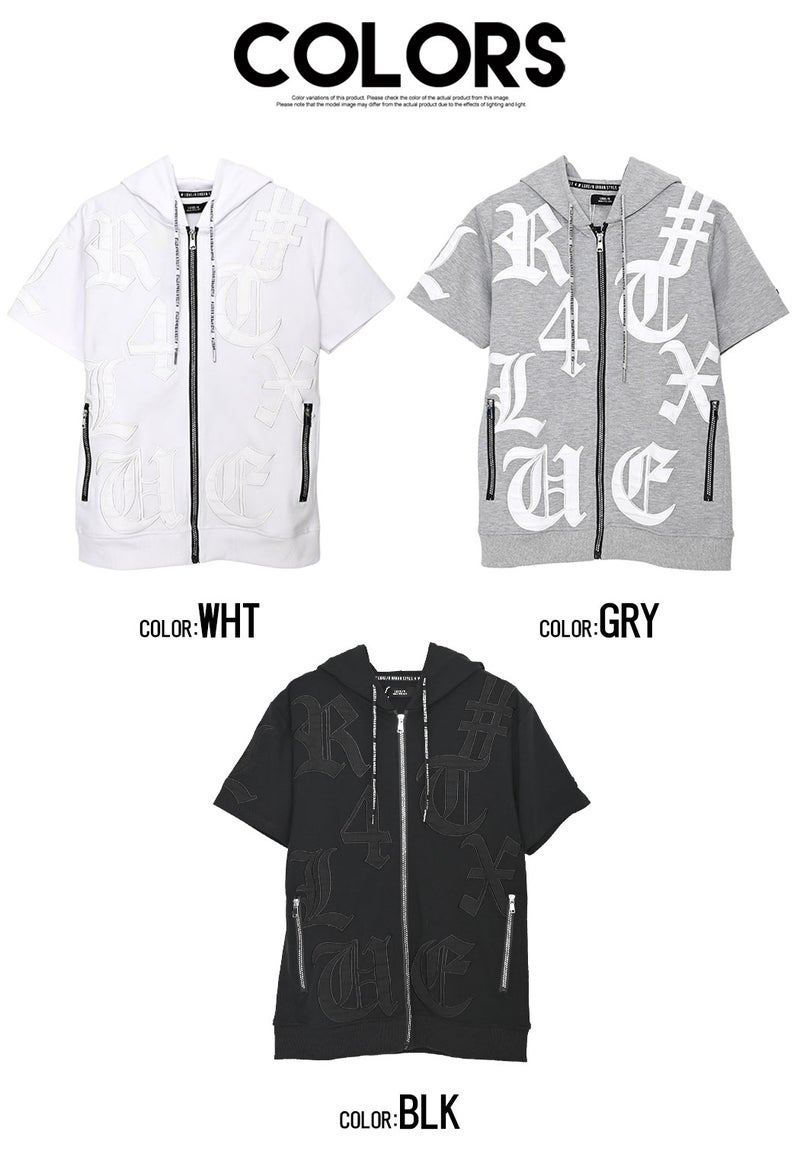 立体的なロゴワッペンが目を引く、存在感のある半袖ジップパーカー。