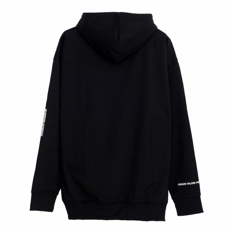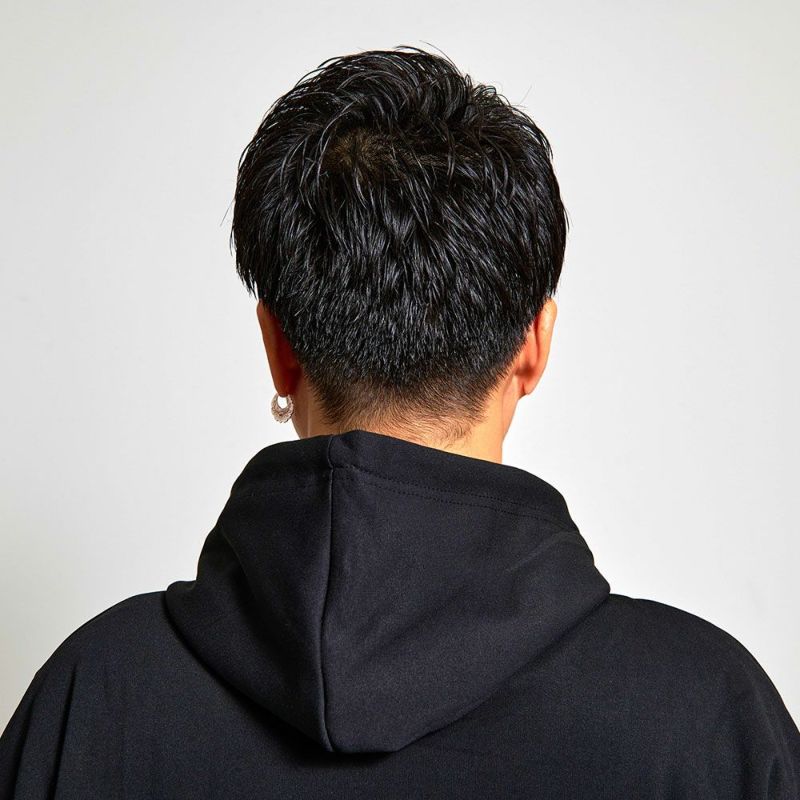 クッション性がありシワになりにくい特徴を持つダンボールニットを使用したプルオーバーパーカー。