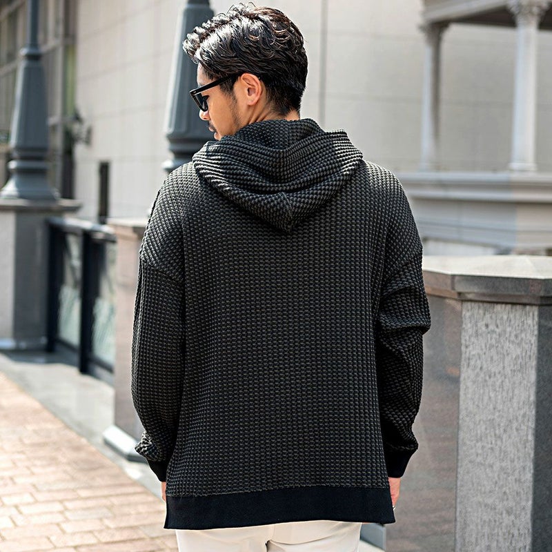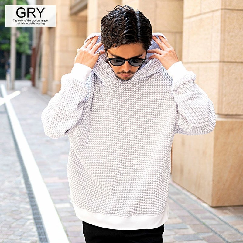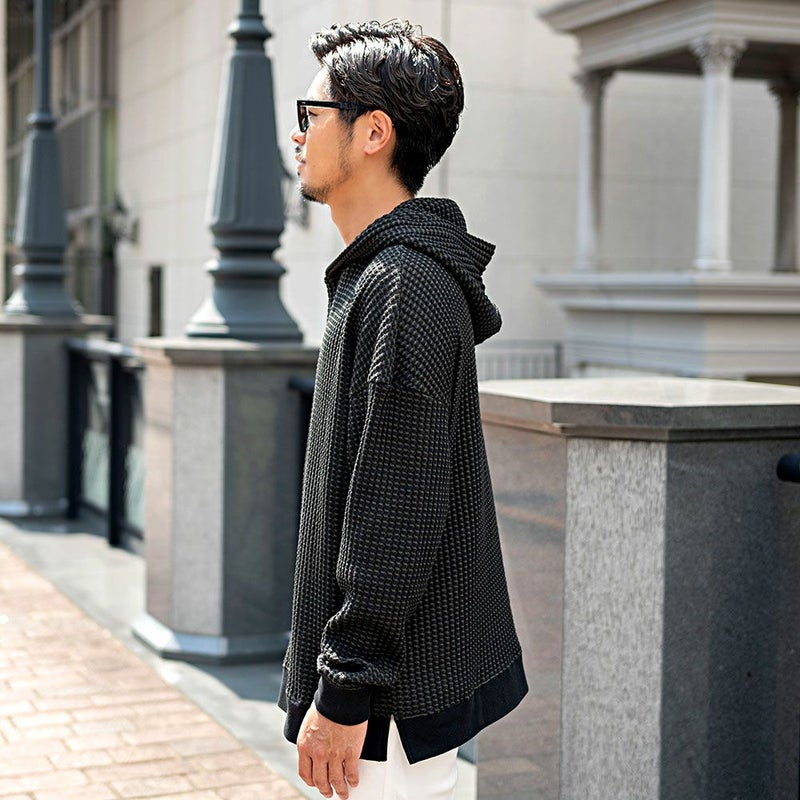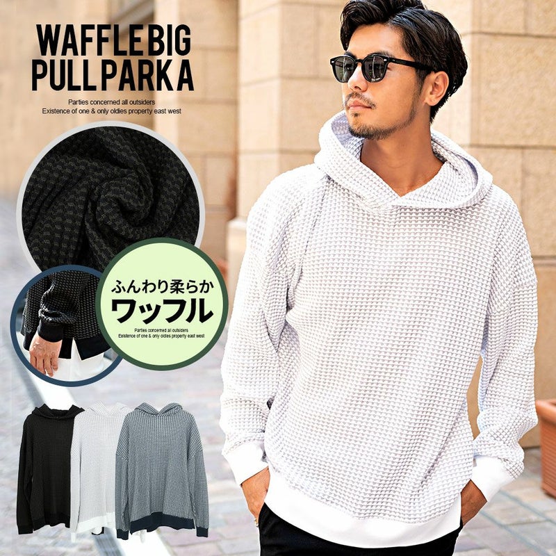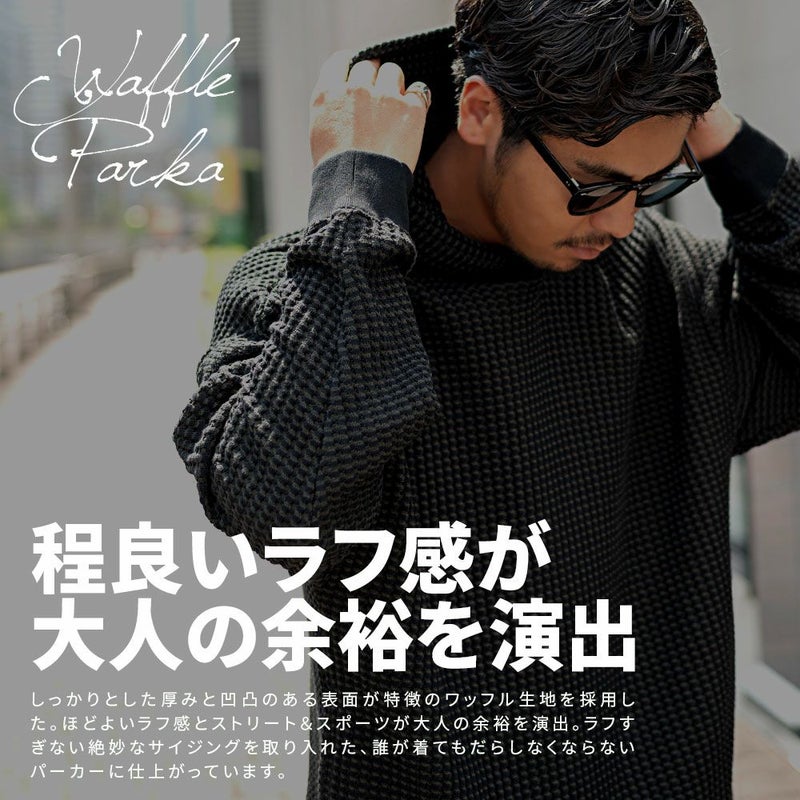 しっかりとした厚みと凹凸のある表面が特徴のワッフル生地を採用したプルオーバーパーカー。