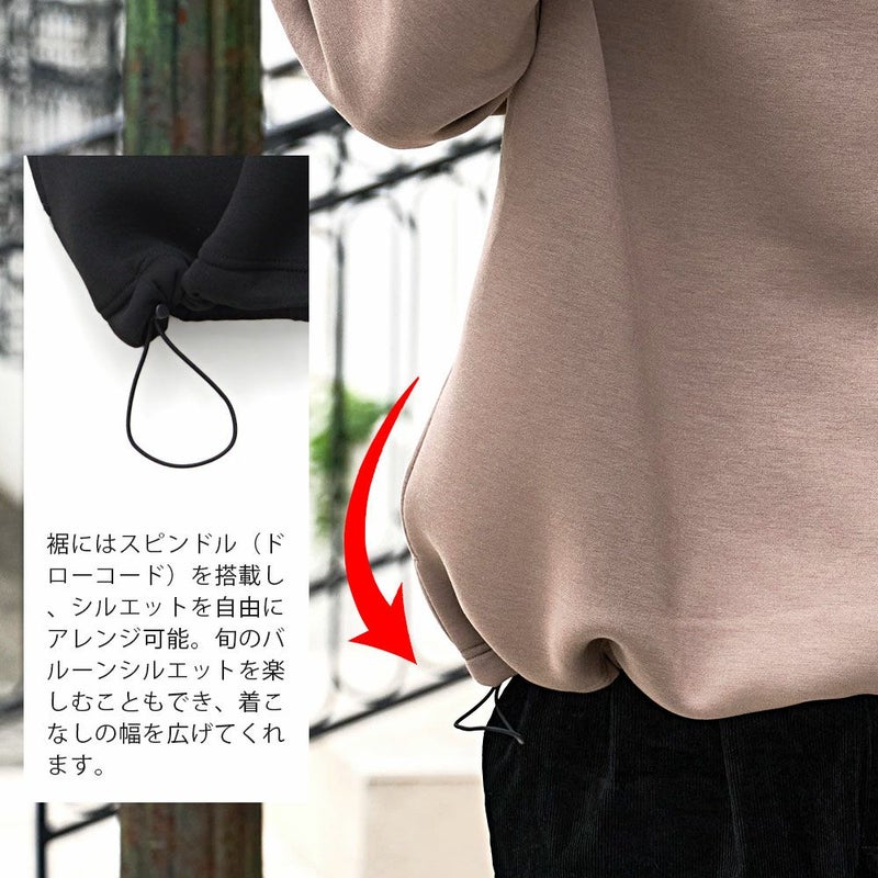 裾にはスピンドル(ドローコード)を搭載し、シルエットを自由にアレンジ可能。旬のバルーンシルエットを楽しむこともでき、着こなしの幅を広げてくれます。