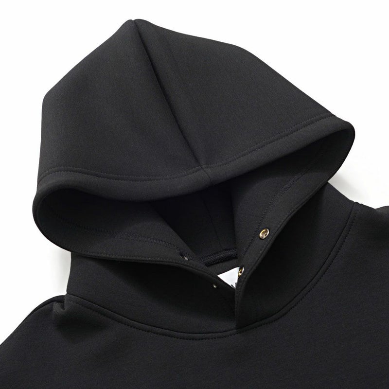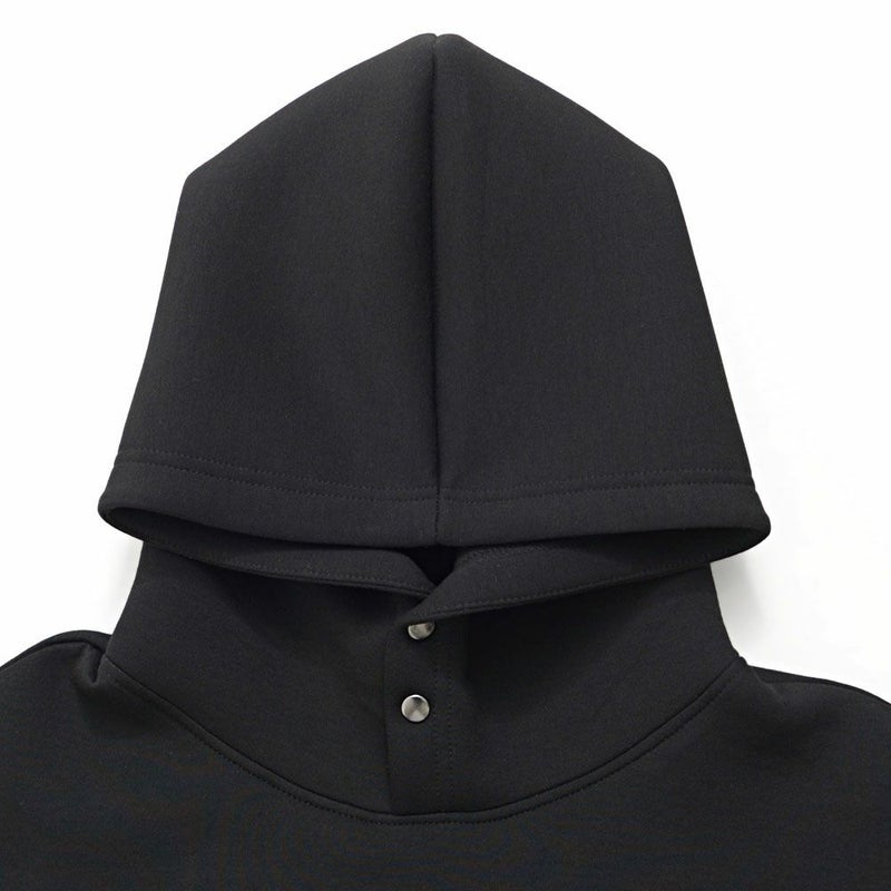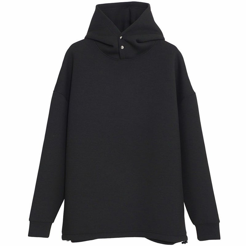 立体的に立ち上がるハイネックフードがスタイリッシュな印象を演出し、顔まわりをすっきり見せる効果も。