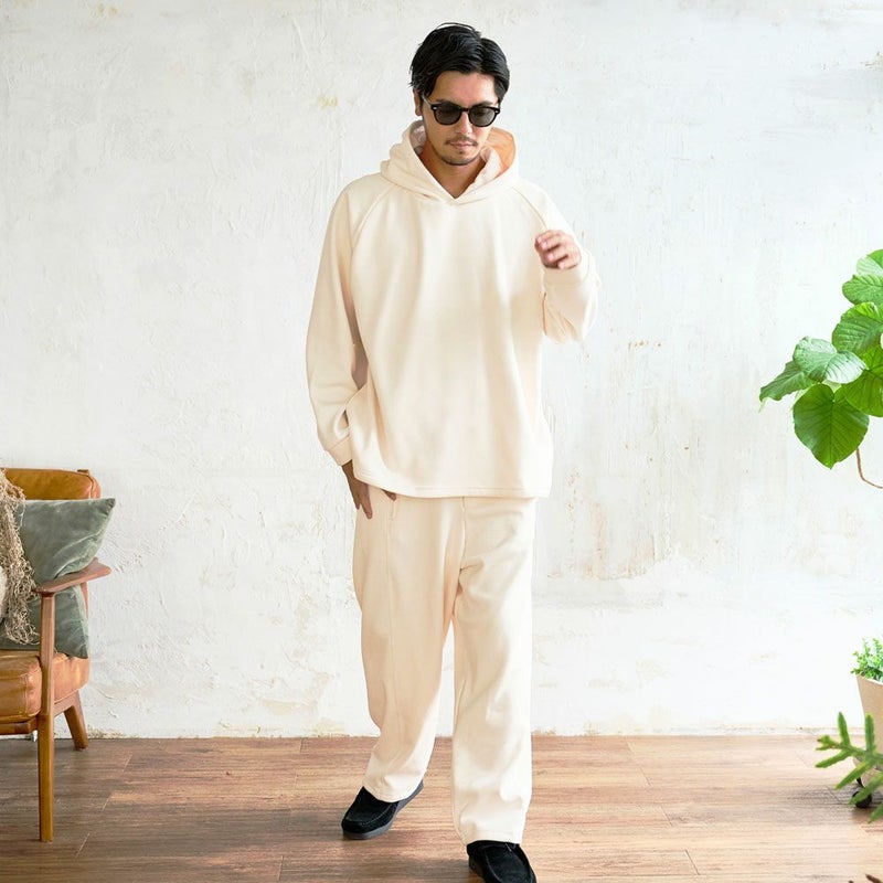 同素材のドビー裏起毛ワイドパンツとのセットアップも可能。