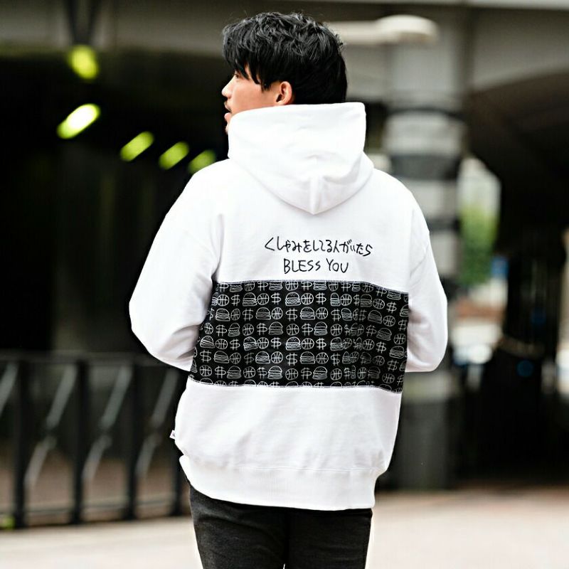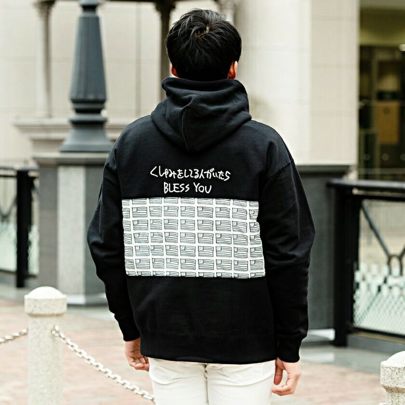 バック部分には「くしゃみをしている人がいたらBRESS YOU」と、アメリカに因んだ国旗のプリントを異素材で貼り付け、インパクト抜群なデザイン!