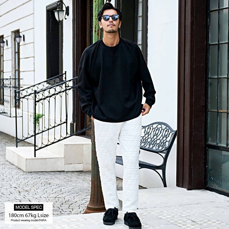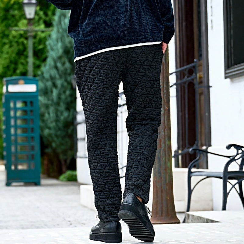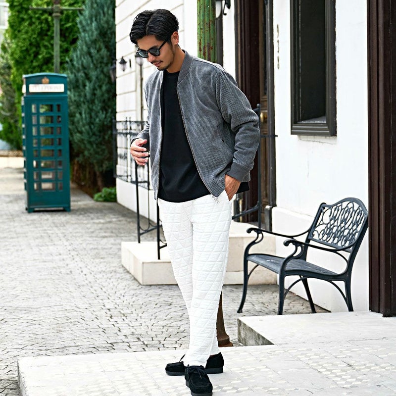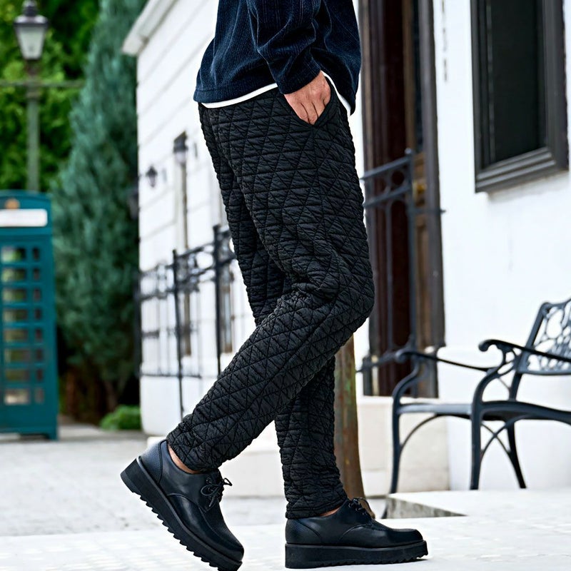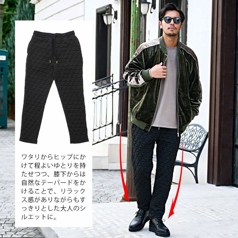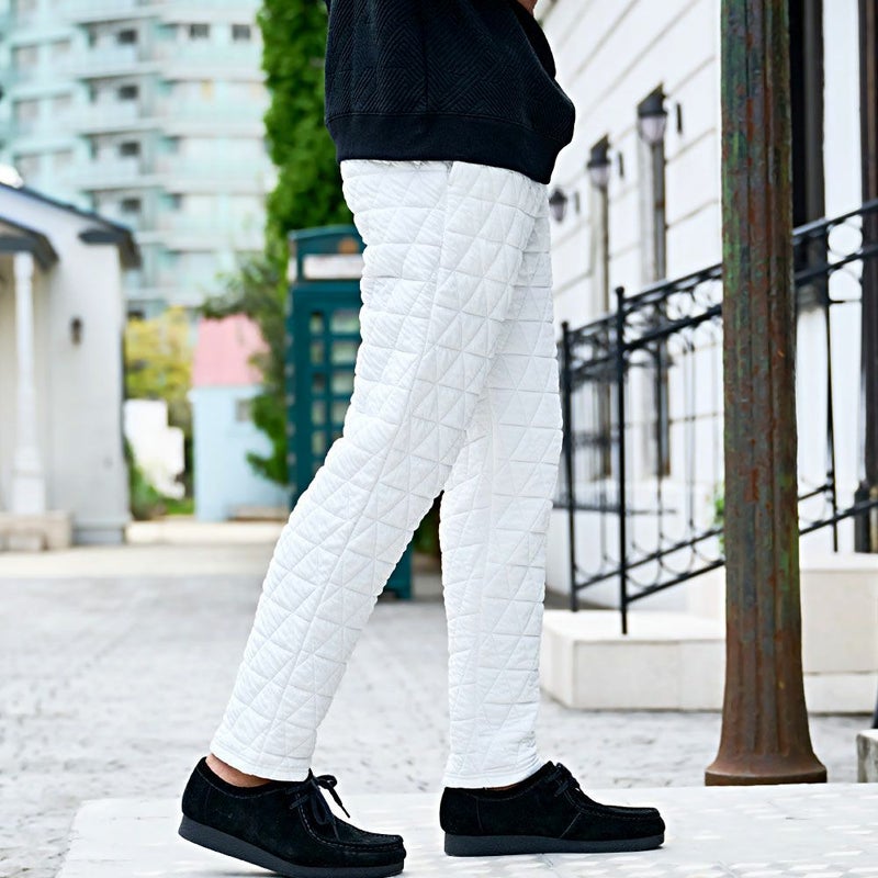 自宅でのリラックスタイムから休日のお出かけまで幅広く活躍する、まさに“大人のための万能キルティングパンツ”です。