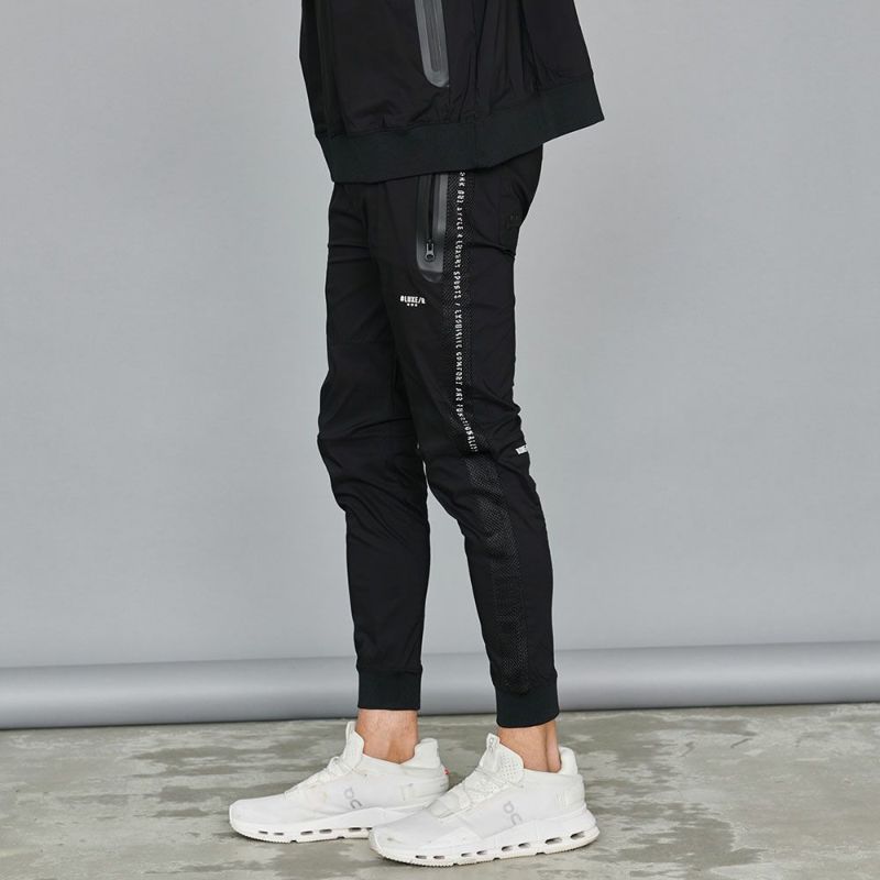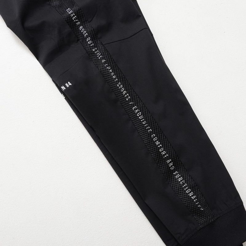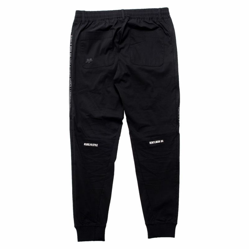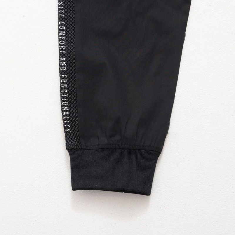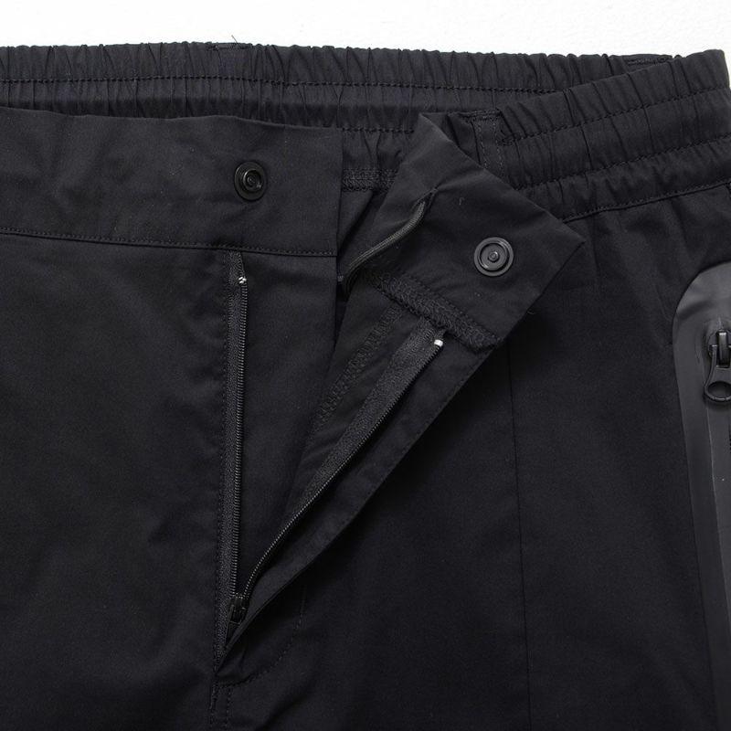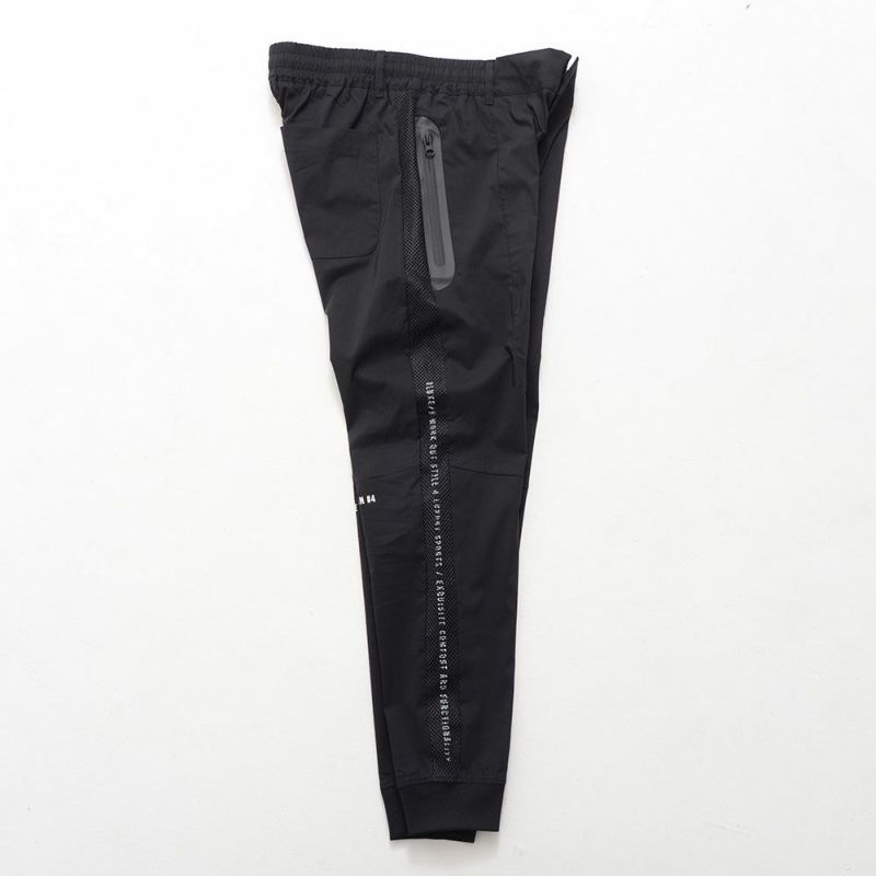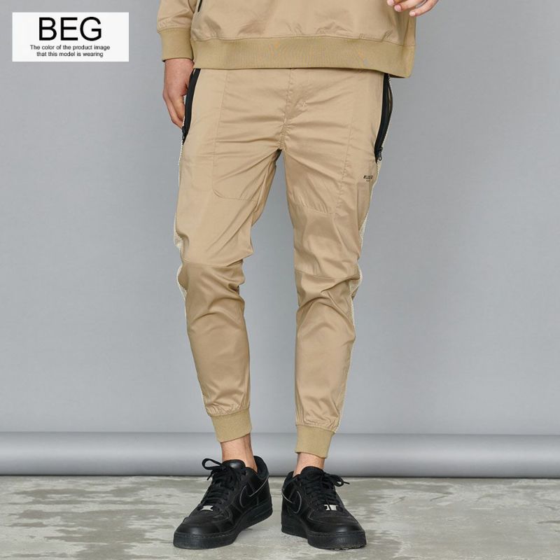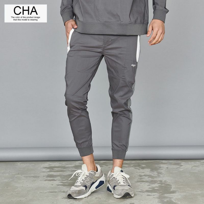 布帛素材を使用したテーパードシルエットのジョガーパンツ。