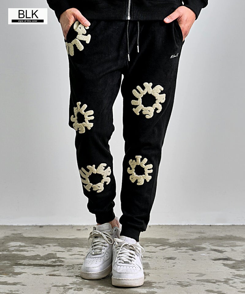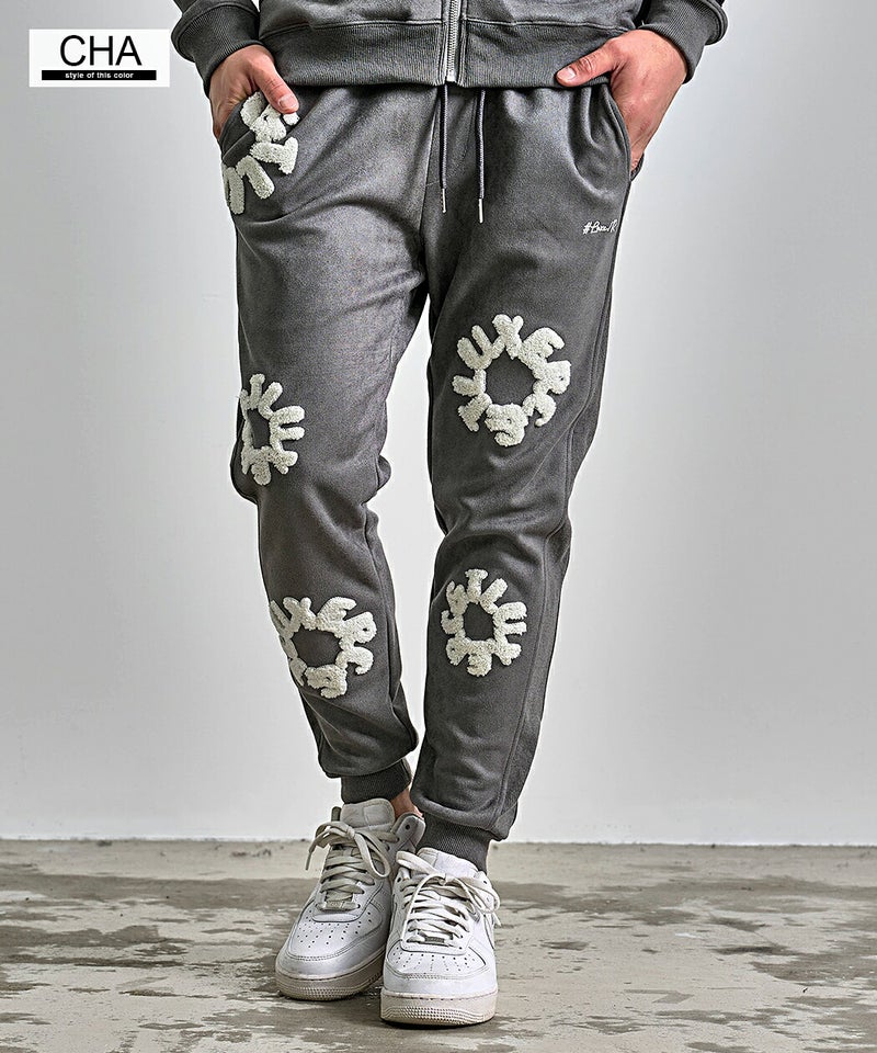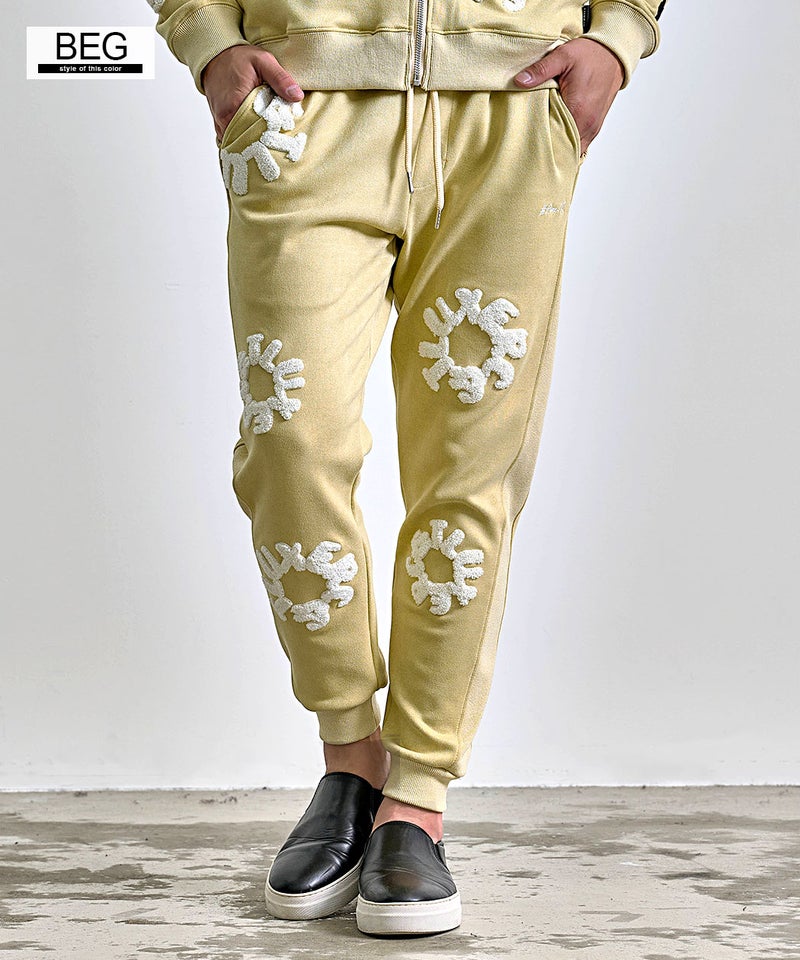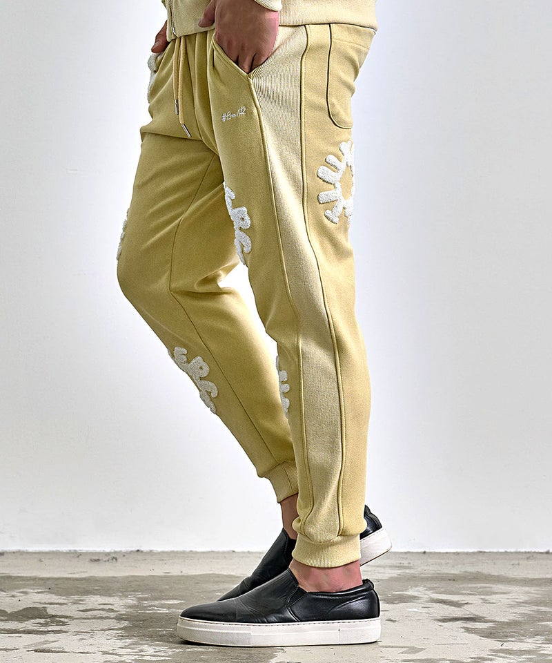 フロントとバックに施されたサガラ刺繍ワッペンが目を引く、存在感と高級感を兼ね備えたスウェットパンツです。