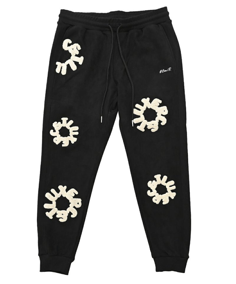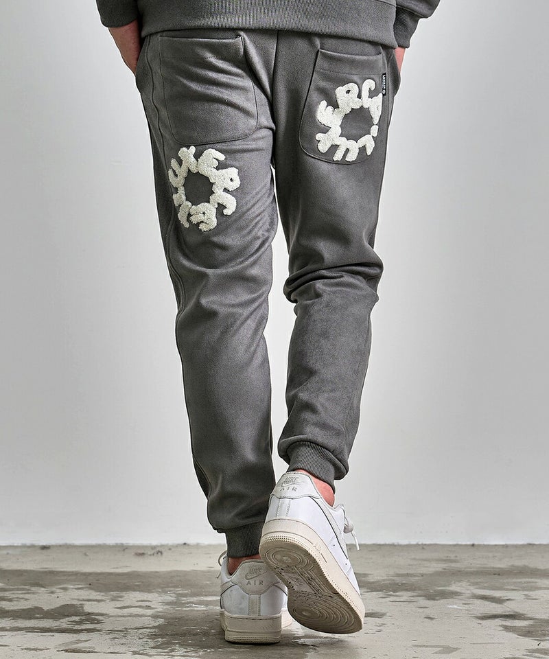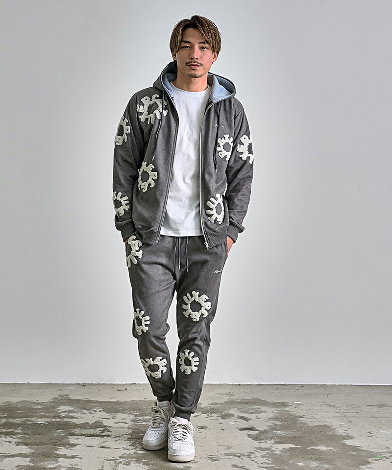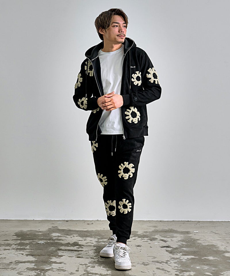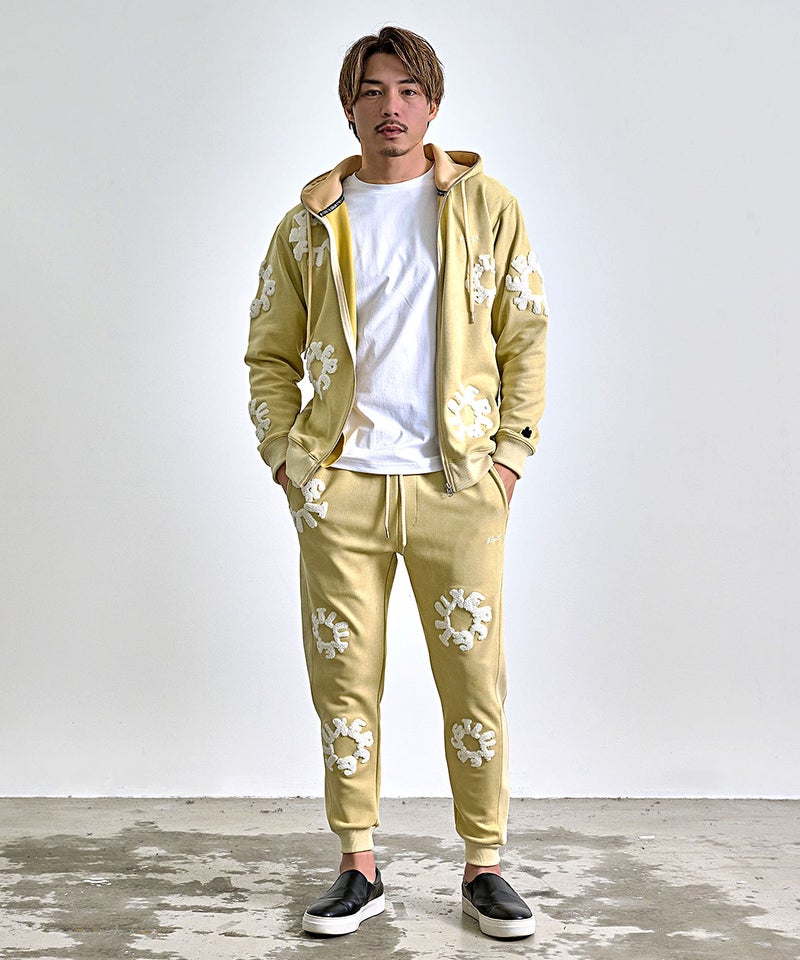 フロントとバックに施されたサガラ刺繍ワッペンが目を引く、存在感と高級感を兼ね備えたスウェットパンツです。