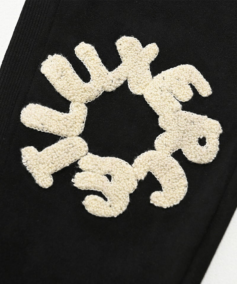 サガラ刺繍特有の立体感ある表情がシンプルなデザインに奥行きを与え、コーディネートのさりげないアクセントとして活躍。遊び心と高級感を兼ね備えた一本。 LUXE/R(ラグジュ)変形サークルロゴパンツ/全3色