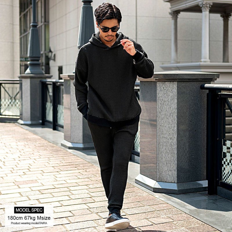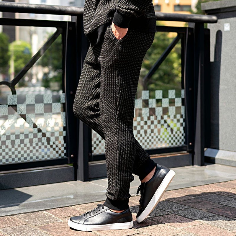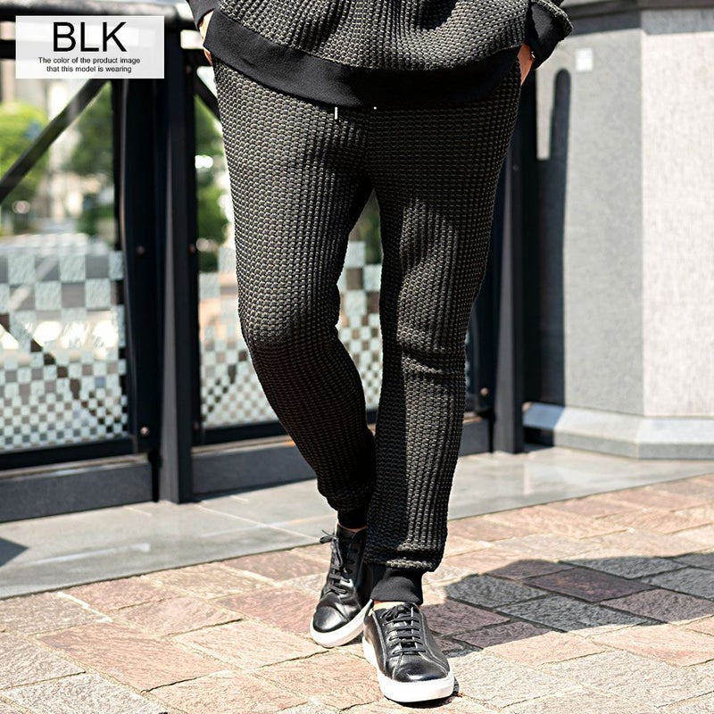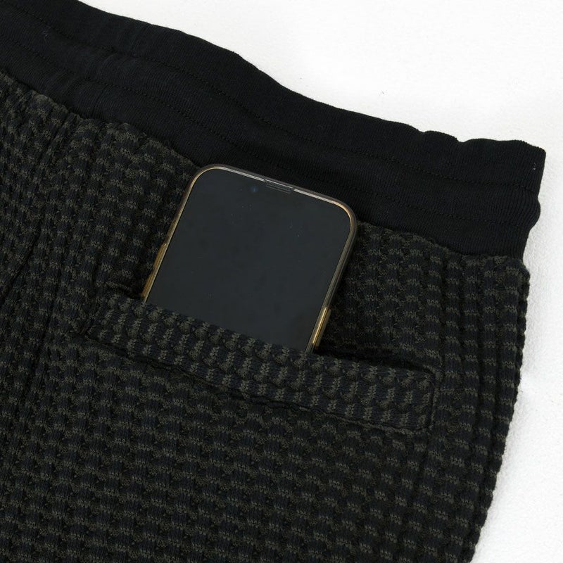 しっかりとした厚みと凹凸のある表面が特徴のワッフル生地を採用したイージーパンツ。