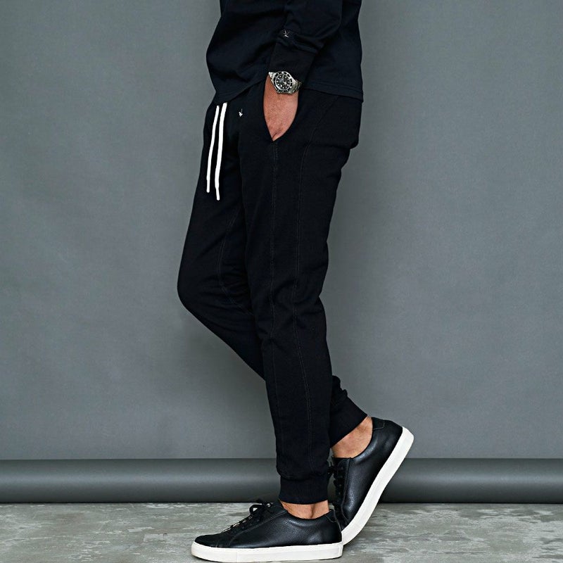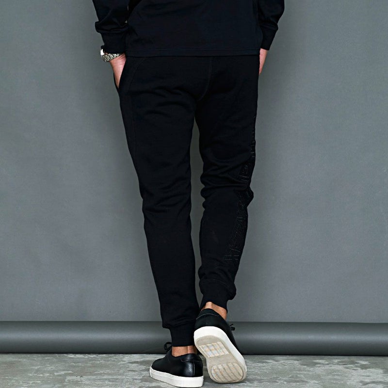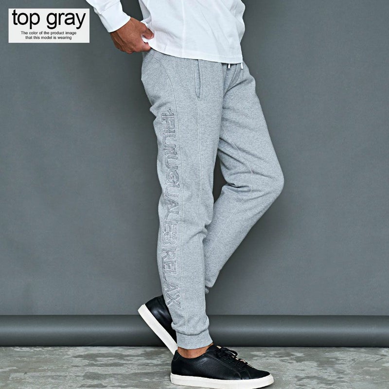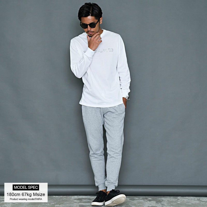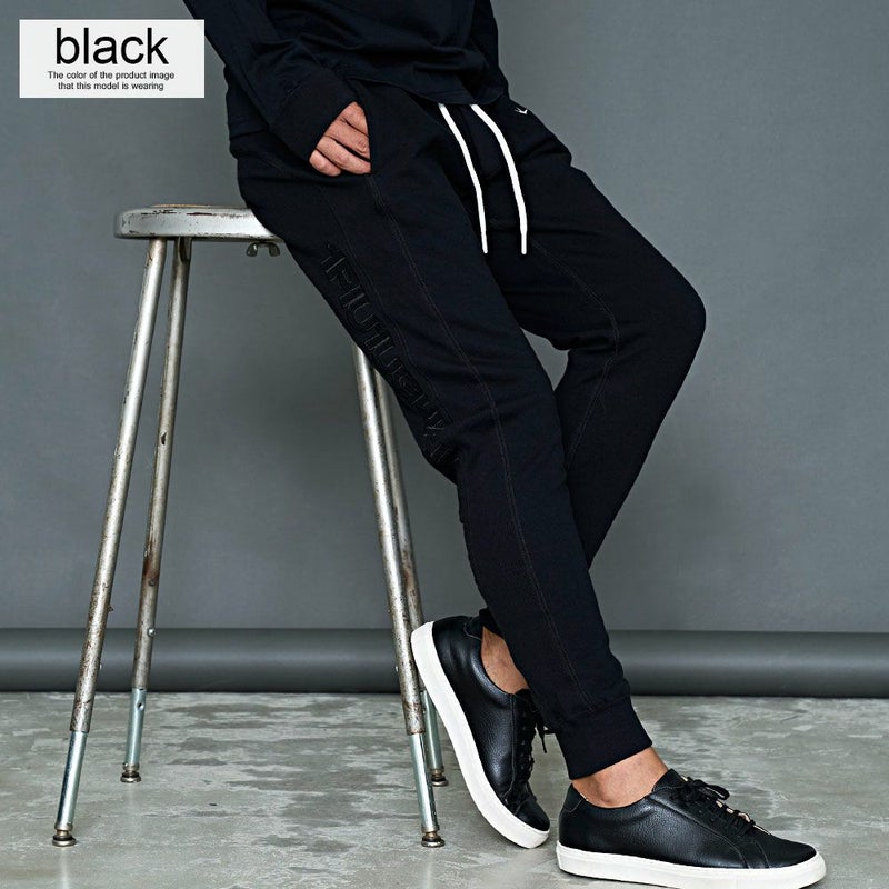 サイドに大胆にブランドロゴを配置したロングパンツ。