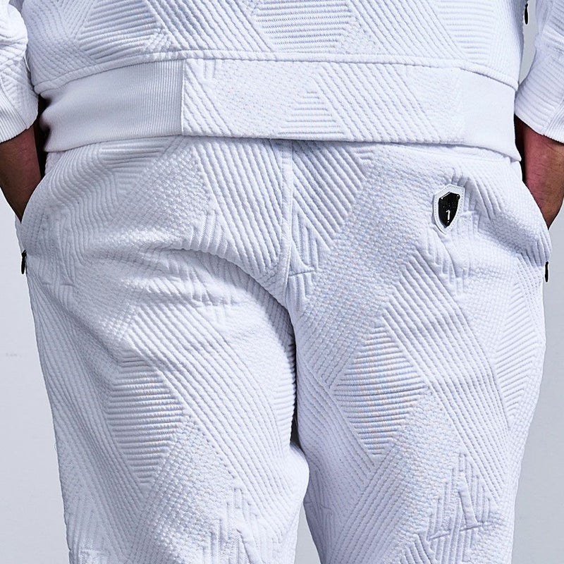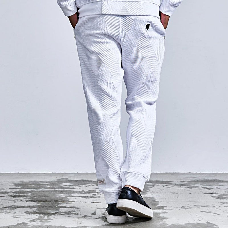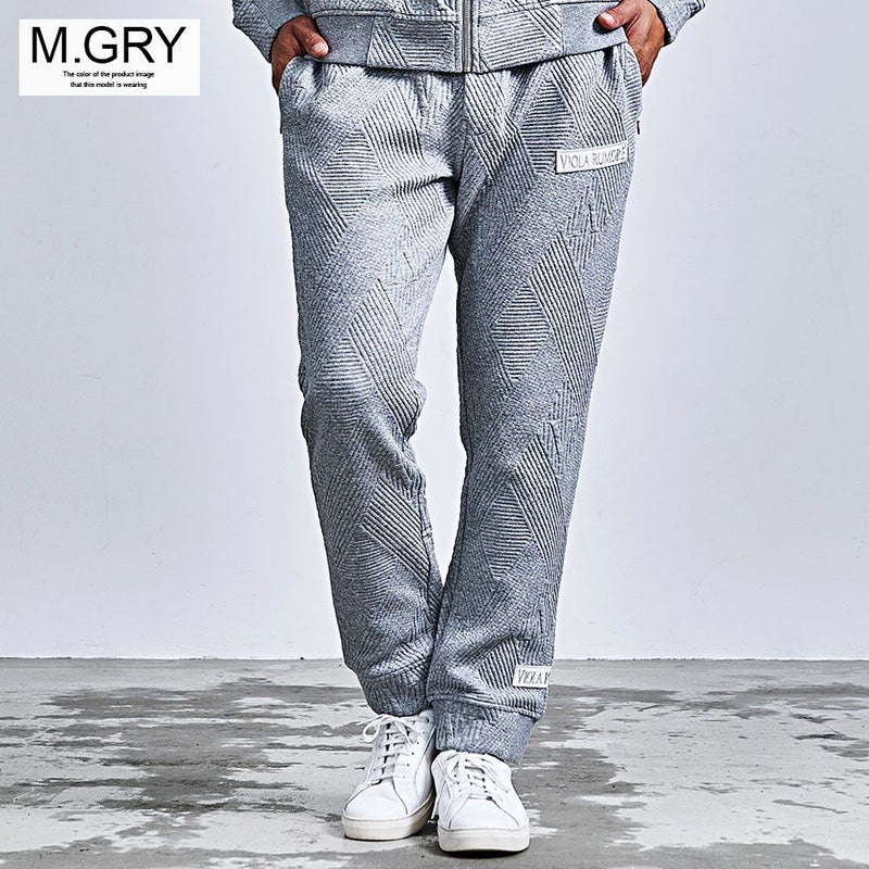 全体に施された立体的なジャガードデザインが、シンプルな中にも存在感を放ち、品格あふれるロングパンツ。