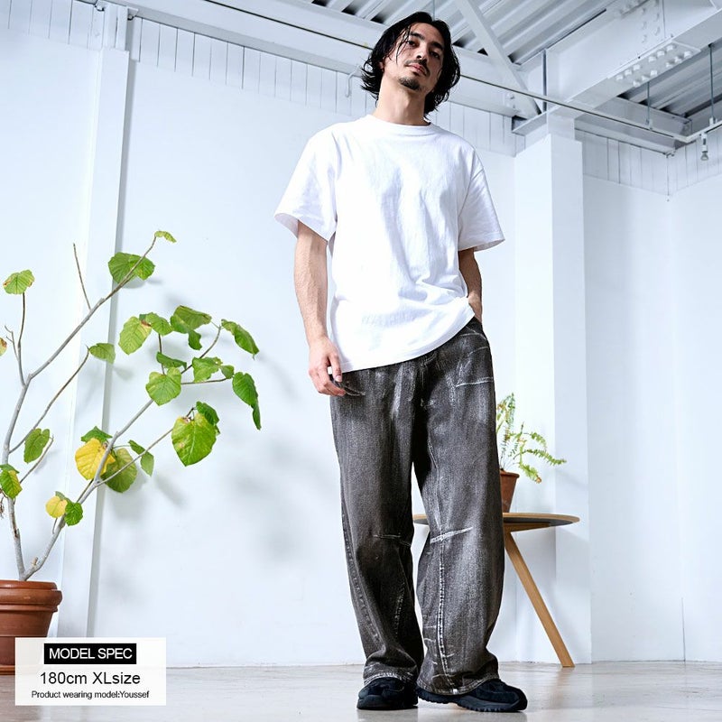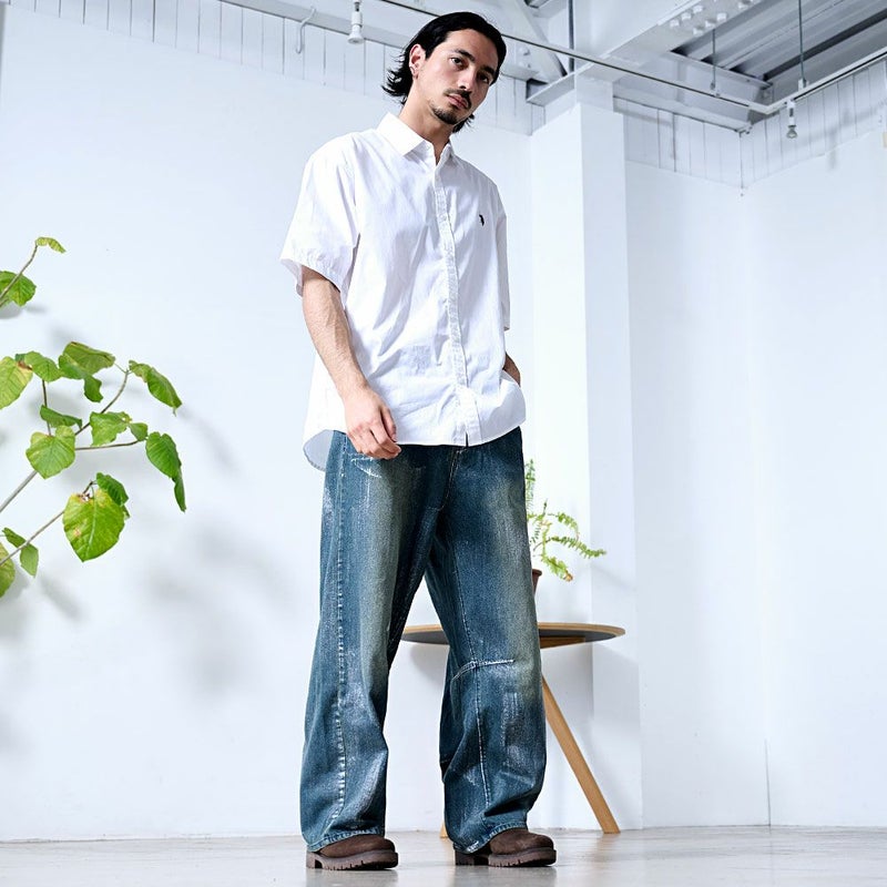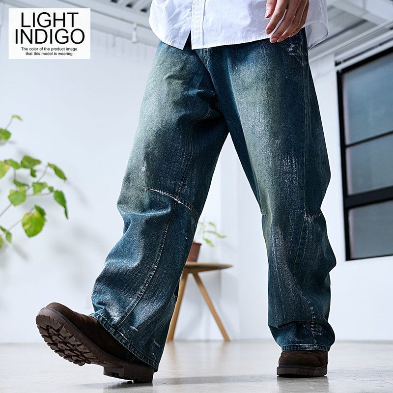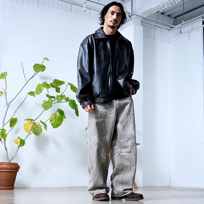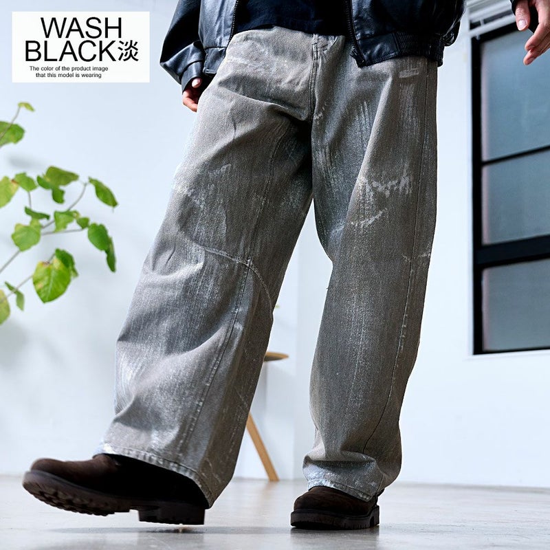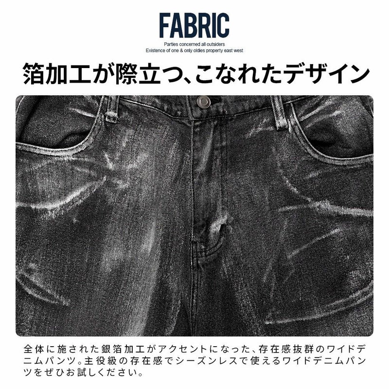 全体に施された銀箔加工がアクセントになった、存在感抜群のワイドデニムパンツ。