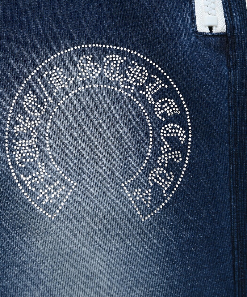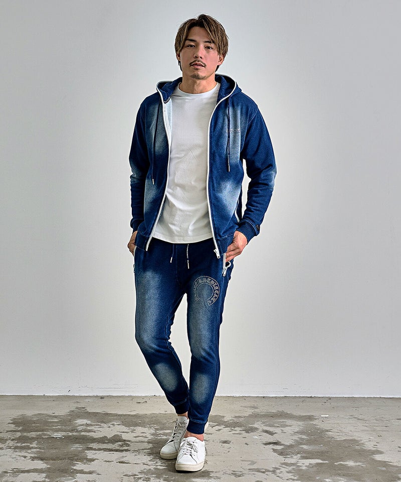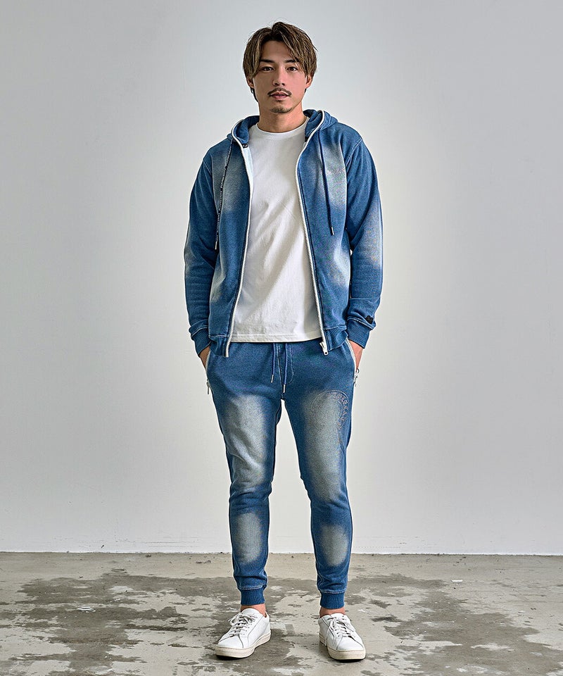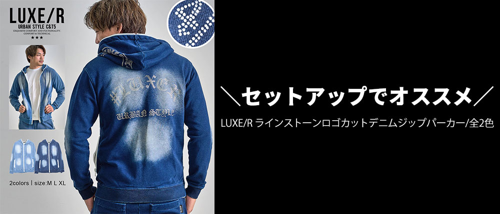 同素材の「ラインストーンロゴカットデニムジップパーカー」とセットアップ着用が可能。