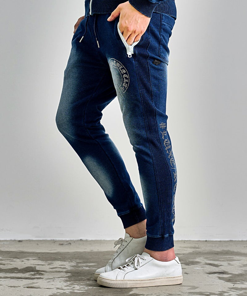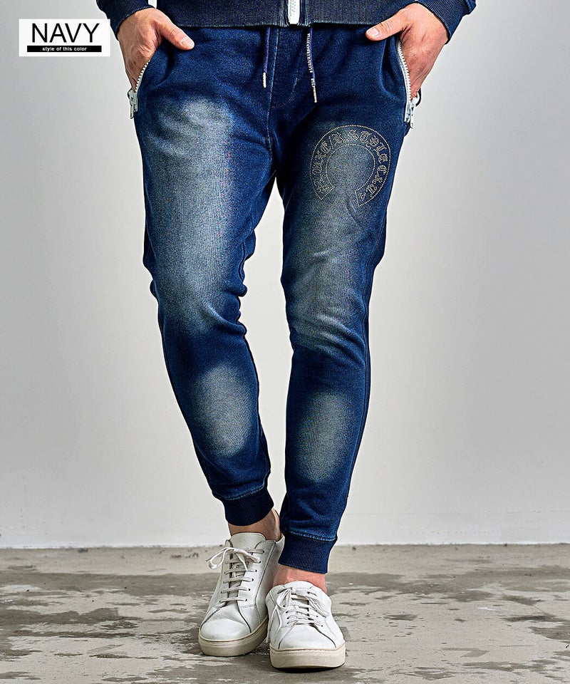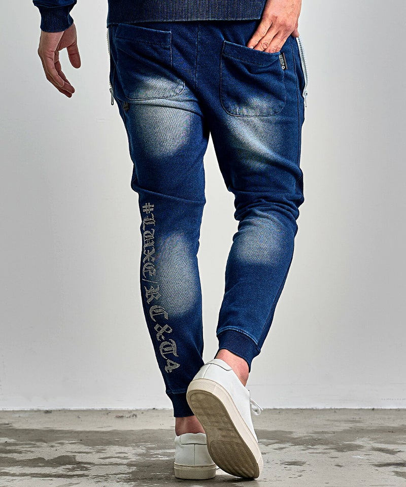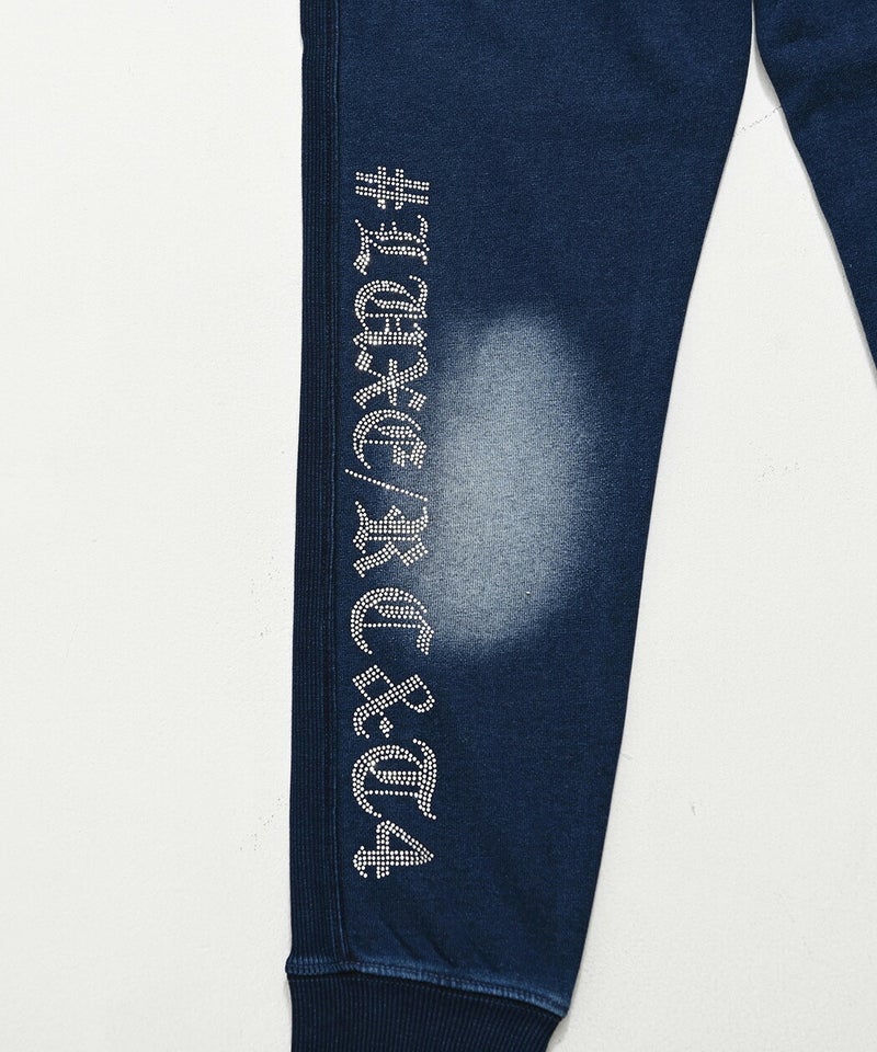 ※こちらの商品はパンツのみの販売となります。別売りのトレーナーと組み合わせることで、セットアップとしてもお使い頂けます。 LUXE/R(ラグジュ)ラインストーンロゴカットデニムパンツ/全2色