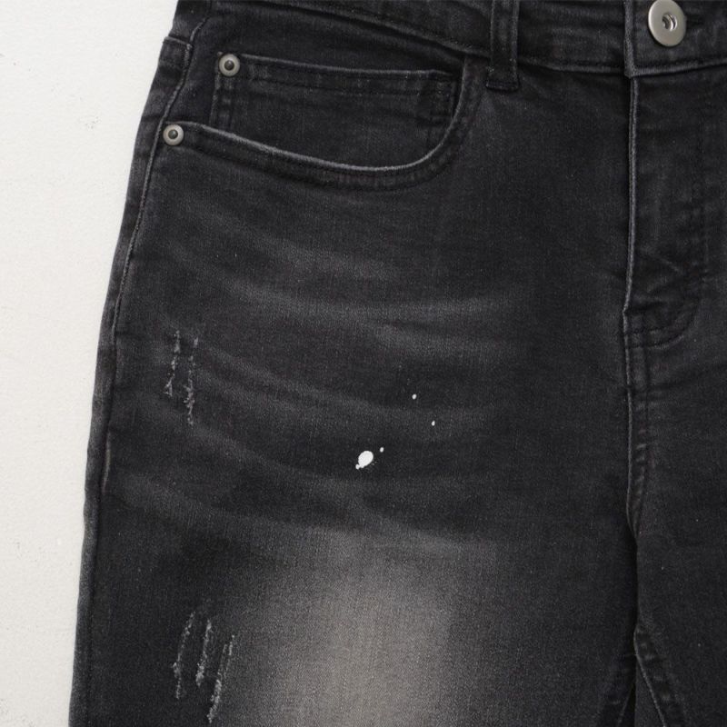 ダメージ加工やリペアステッチ、ペンキ飛ばし風のディテールを取り入れ、こなれ感のあるヴィンテージ表情に仕上げています。