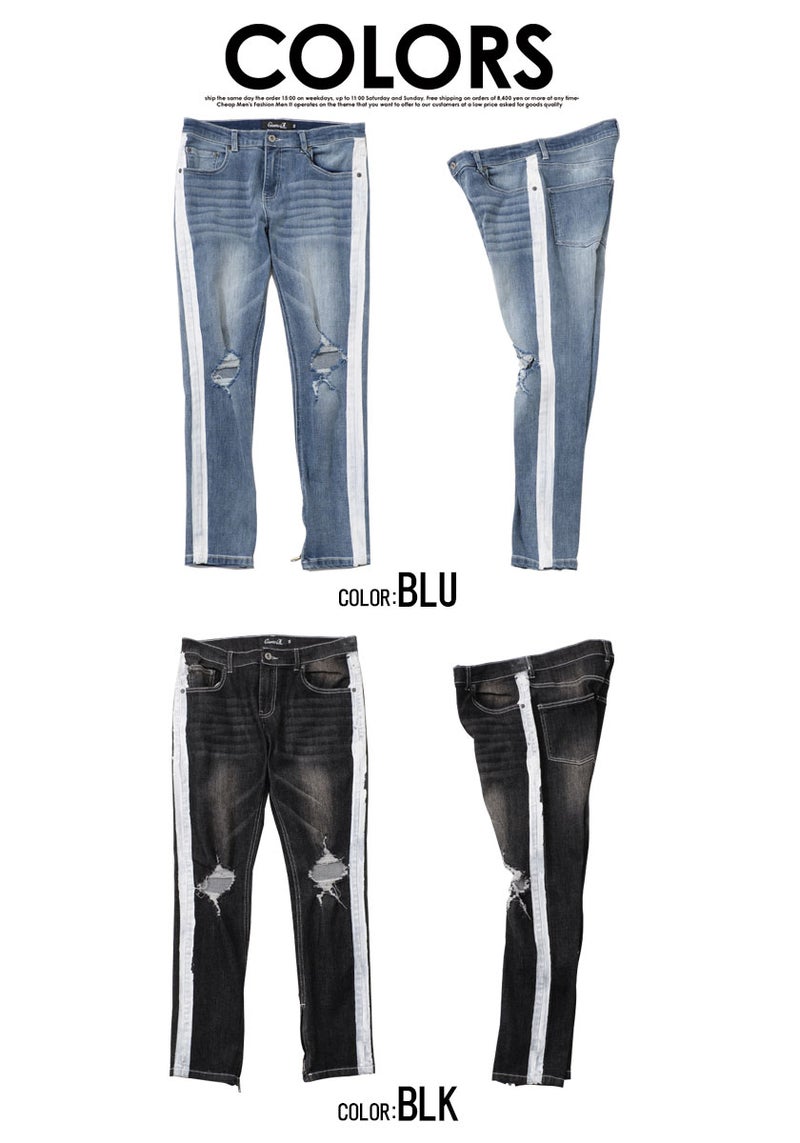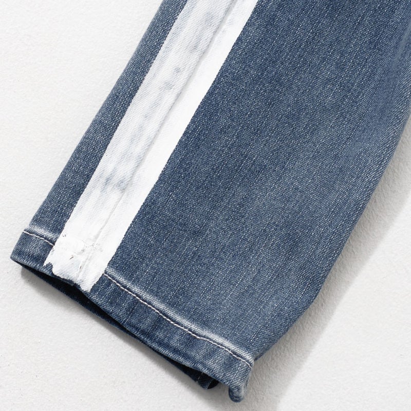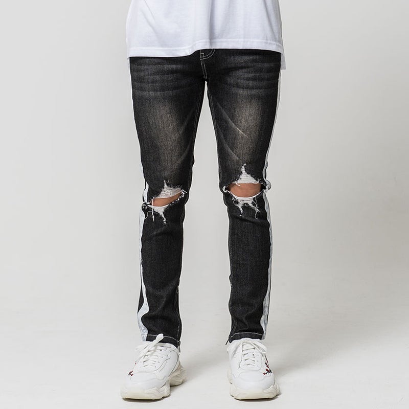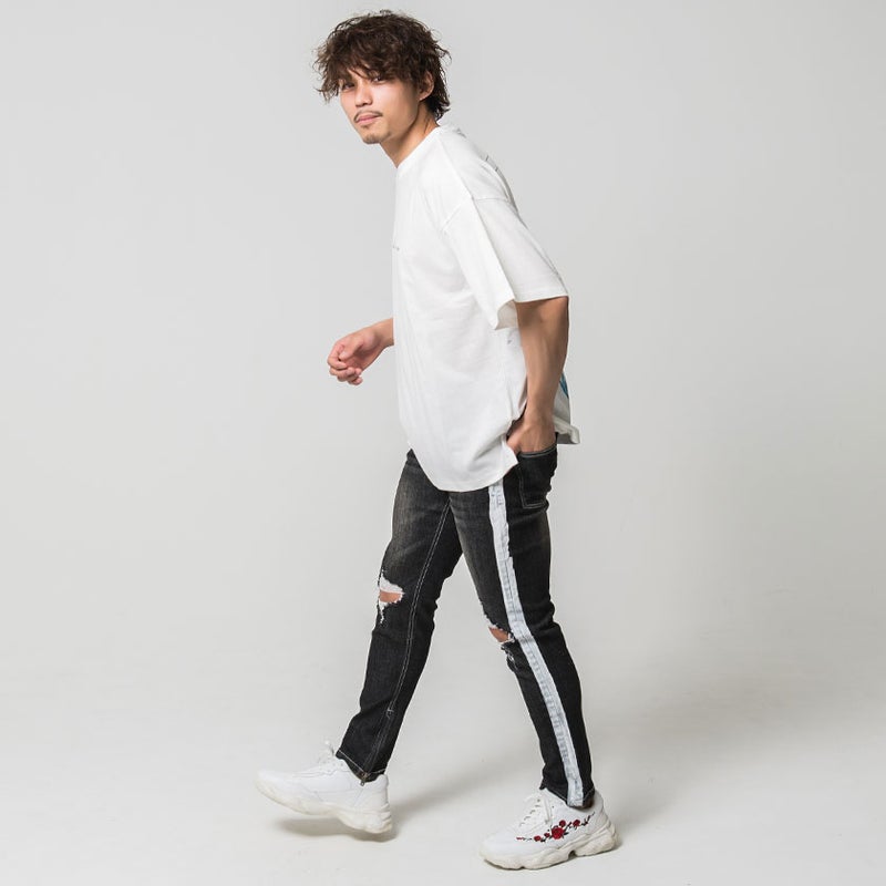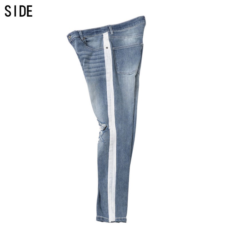 大胆に施された膝のクラッシュ加工とサイドラインがインパクト抜群のデニムパンツ。