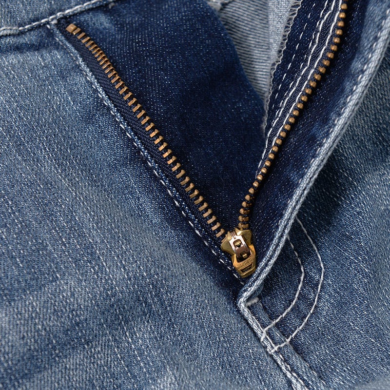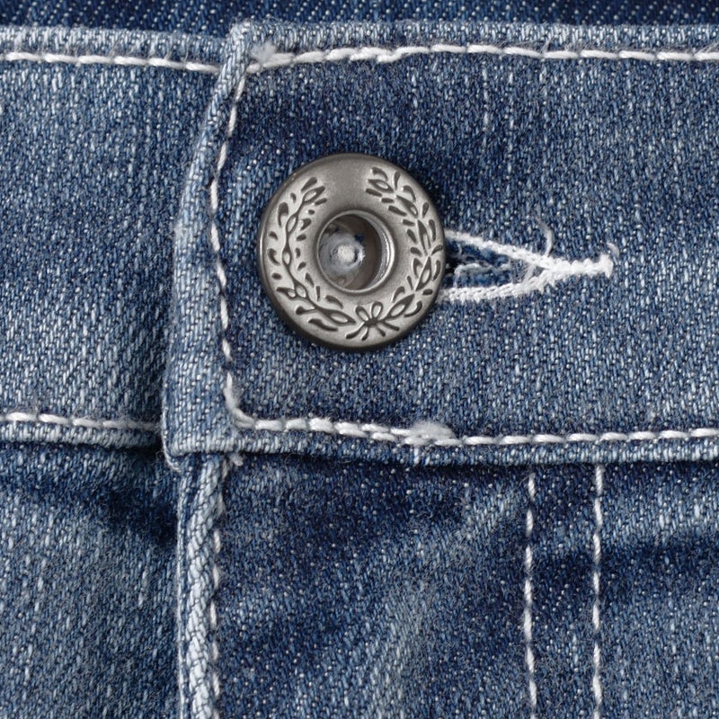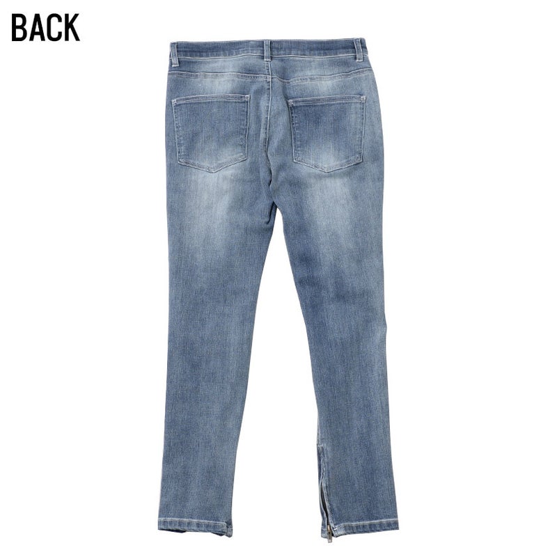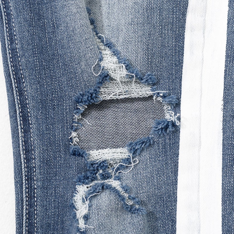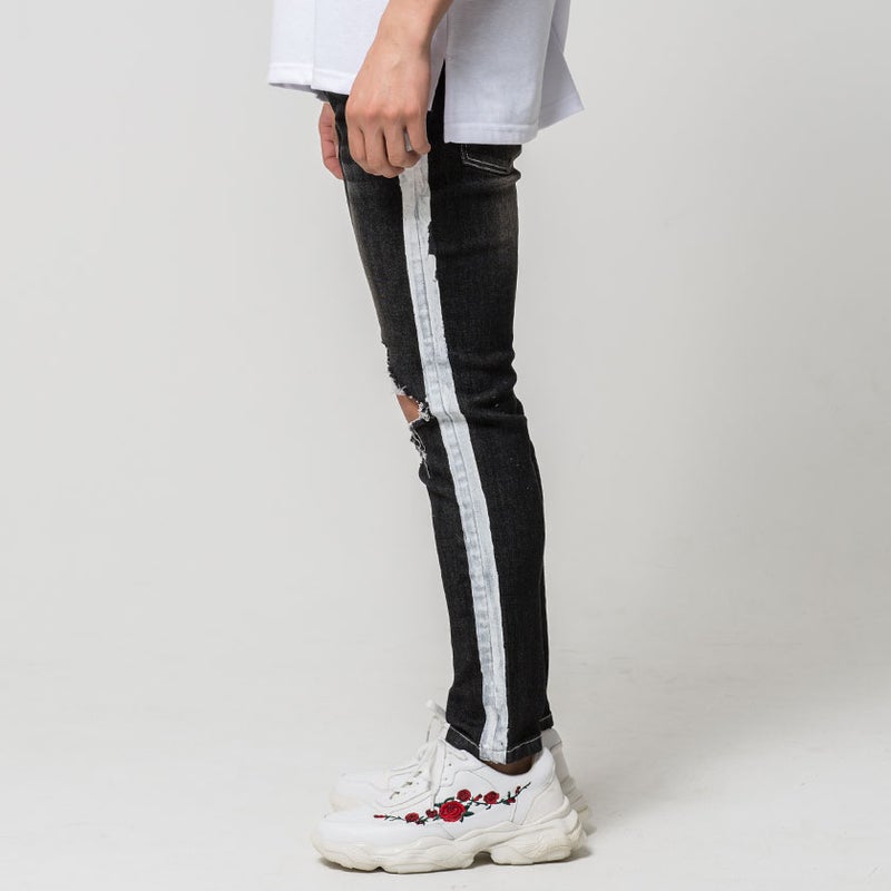 大胆に施された膝のクラッシュ加工とサイドラインがインパクト抜群のデニムパンツ。