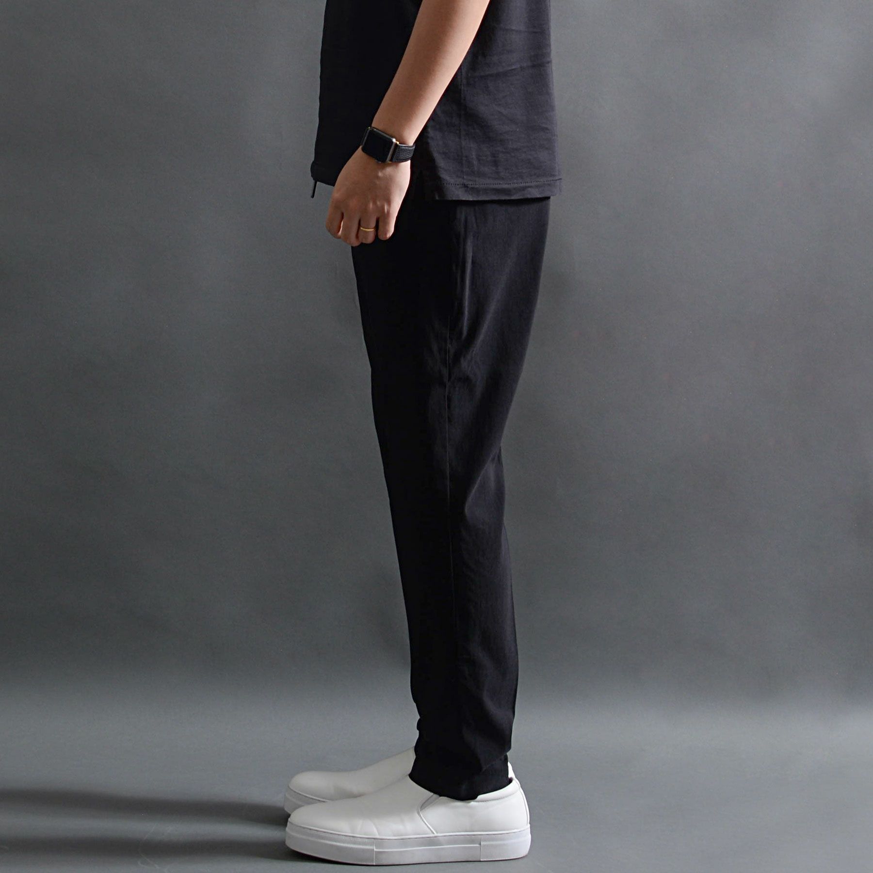 スラックスパンツでありながらャージ素材のような快適さがあり、タテヨコ自在に伸びる驚きのストレッチ性を実現した快適な穿き心地の9分丈アンクルパンツ。