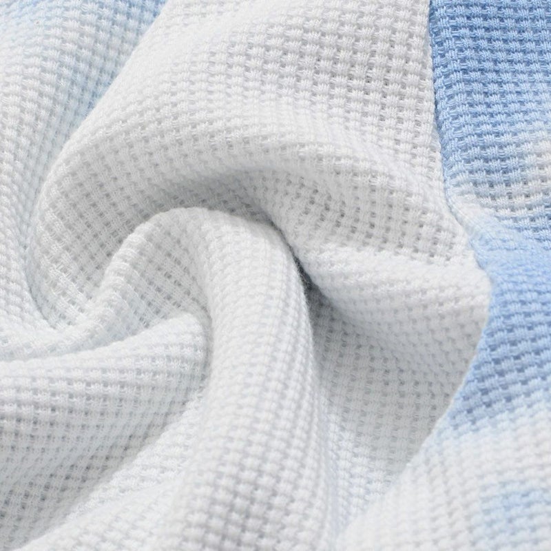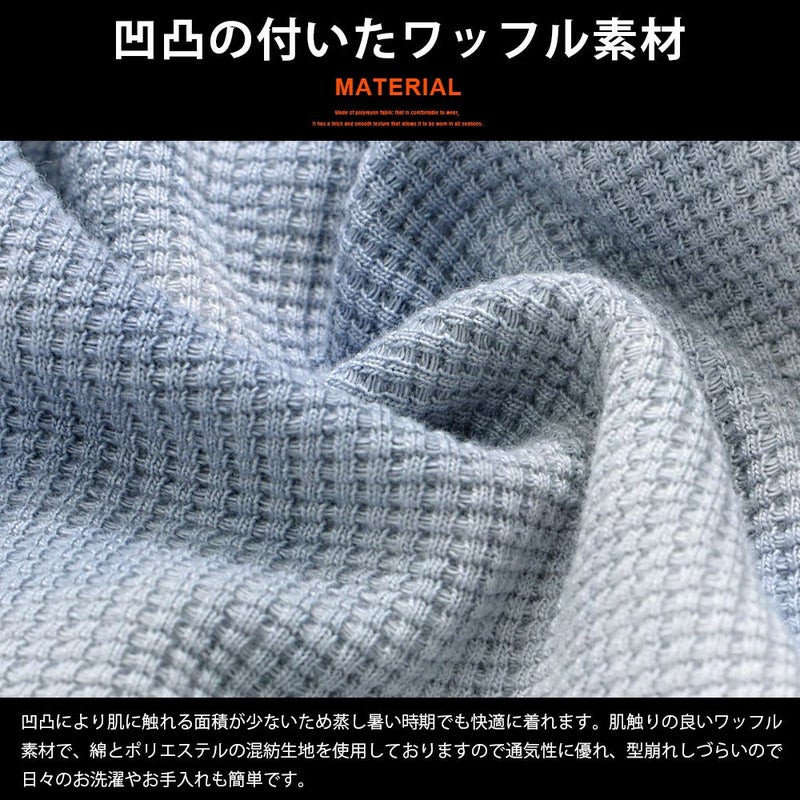 肌触りの良いワッフル素材で、綿とポリエステルの混紡生地を使用しておりますので通気性に優れ、型崩れしづらいので日々のお洗濯やお手入れも簡単です。