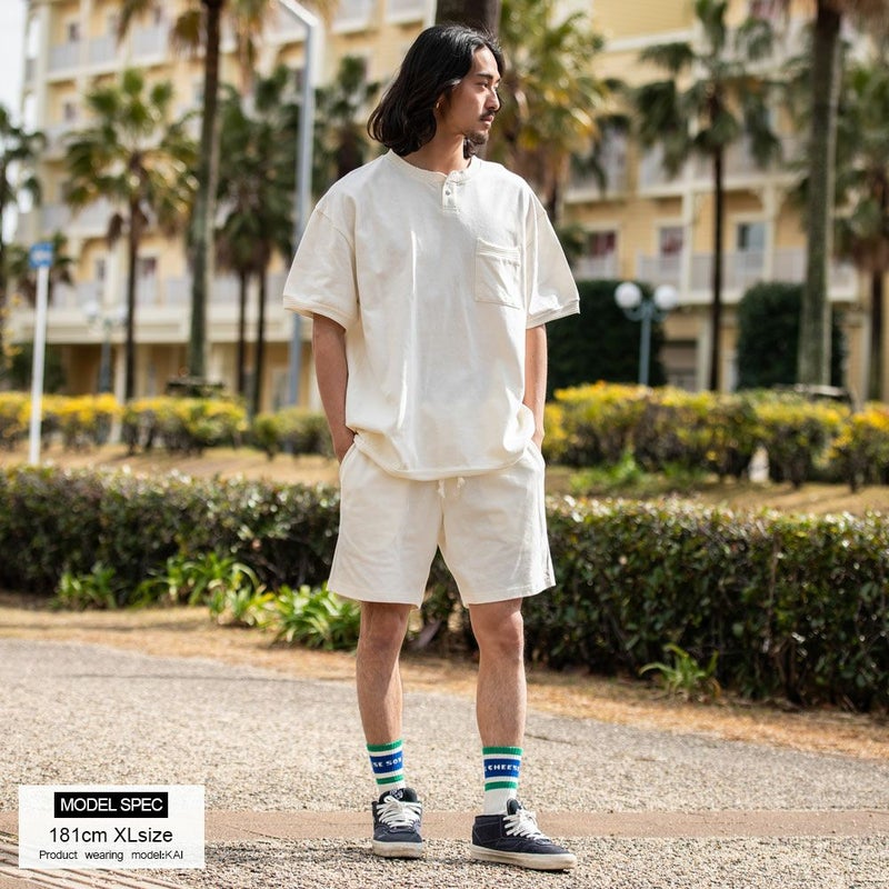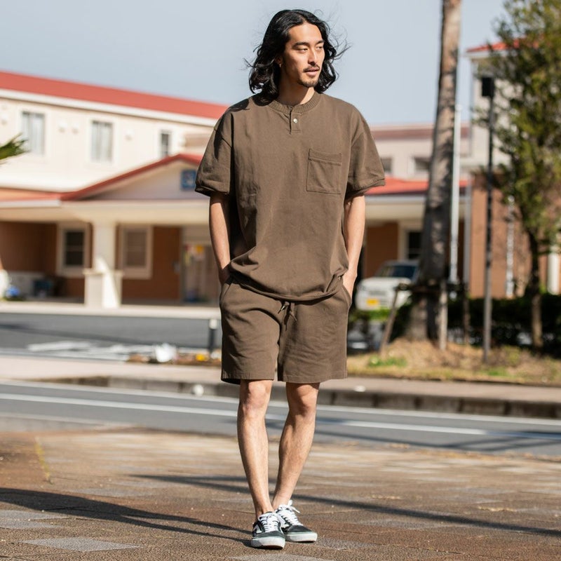 同素材のカットオフリブ半袖ボタンヘンリーとセットアップでの着用はもちろん、シンプルなTシャツやロンT、スウェット、パーカーと合わせたカジュアルスタイル、オーバーシャツやサマーニット、ニットポロシャツと合わせてキレイめに着こなすのもおすすめ。