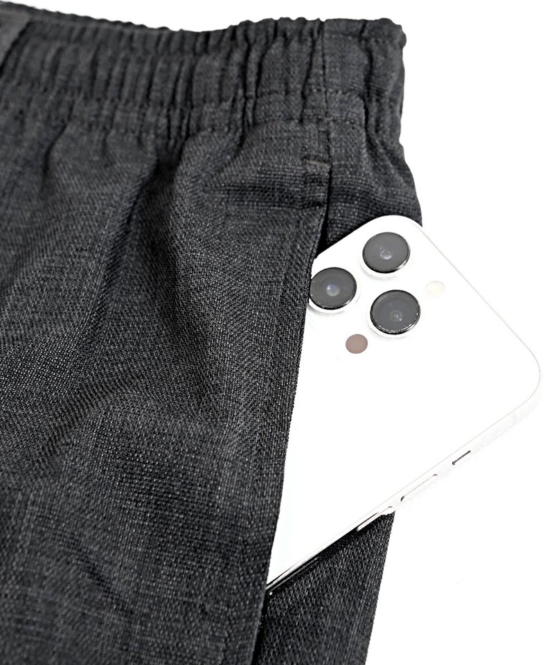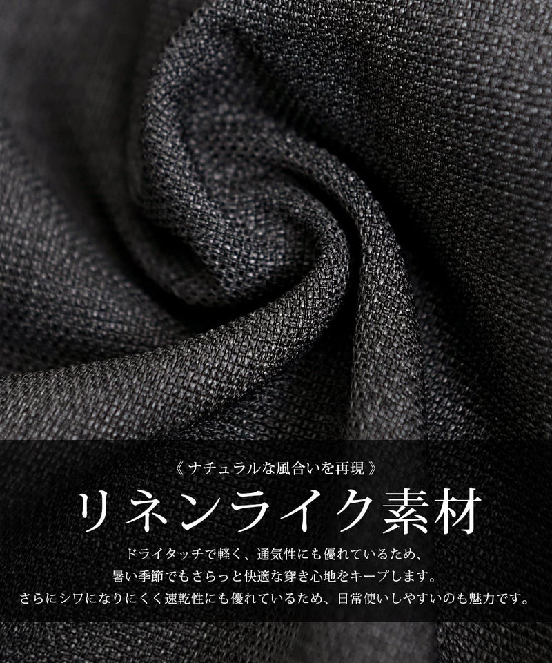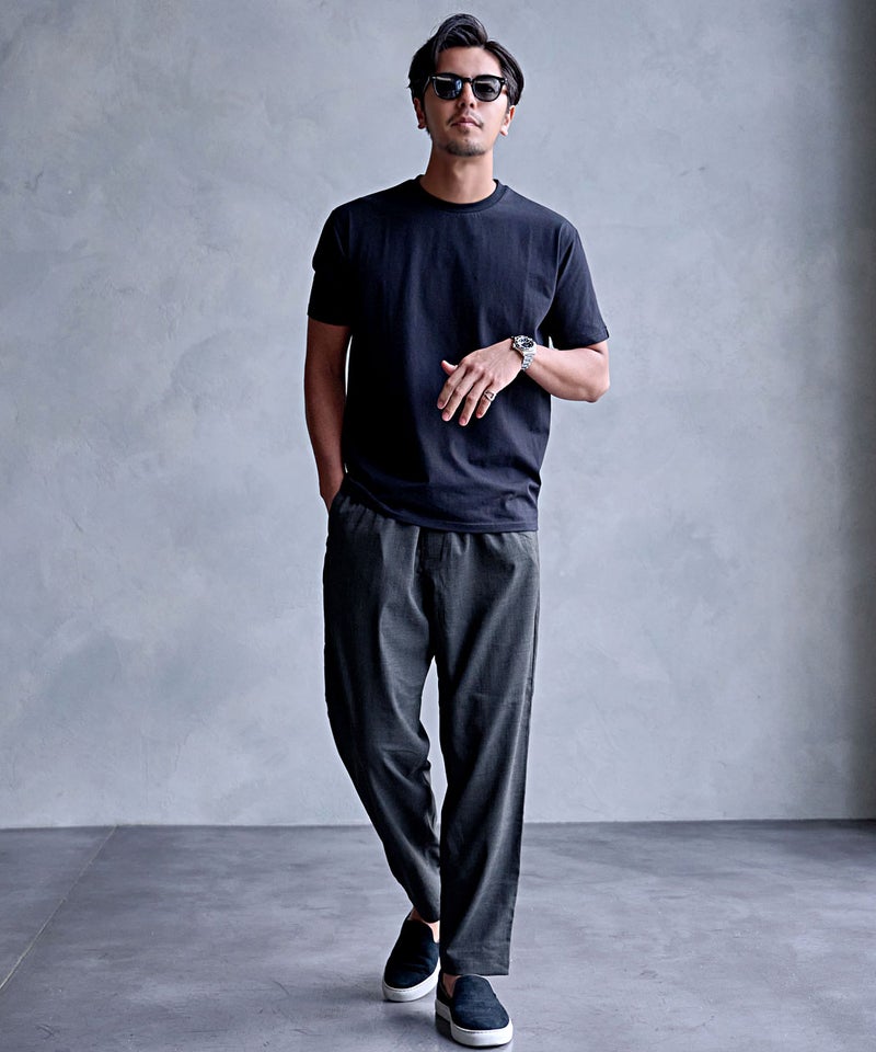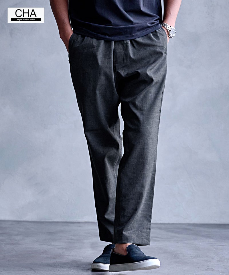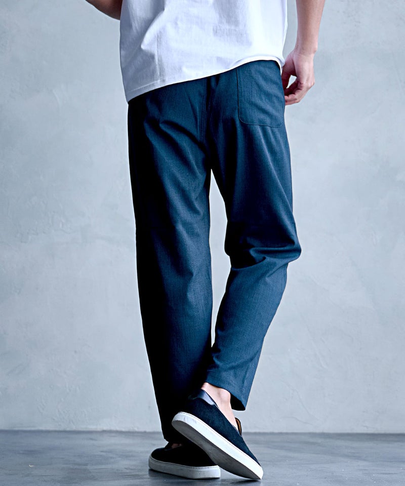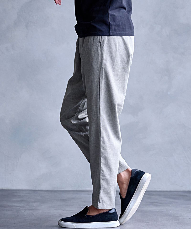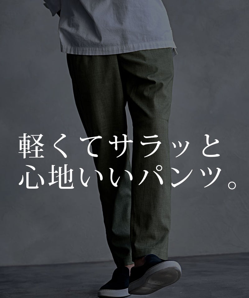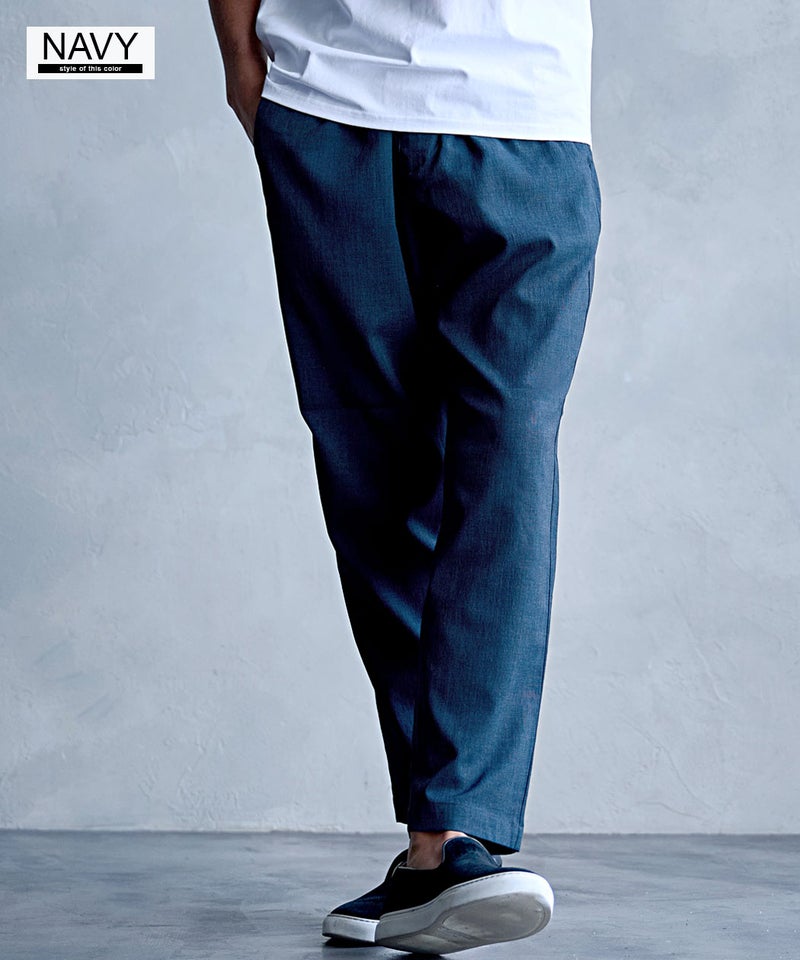 麻のようなナチュラルな風合いを再現したリネンライク素材を使用した、涼しげな印象のイージーパンツ。