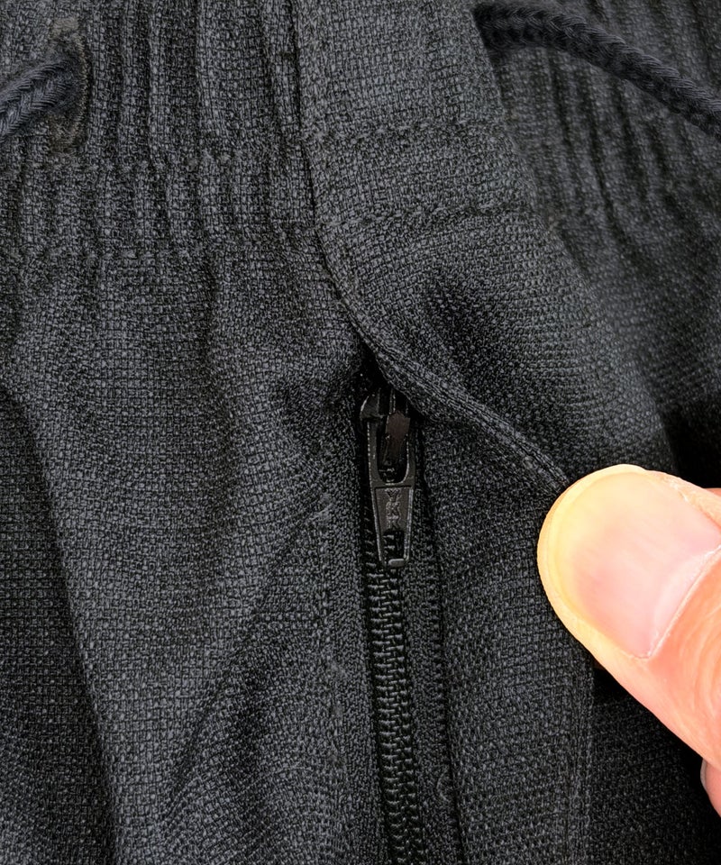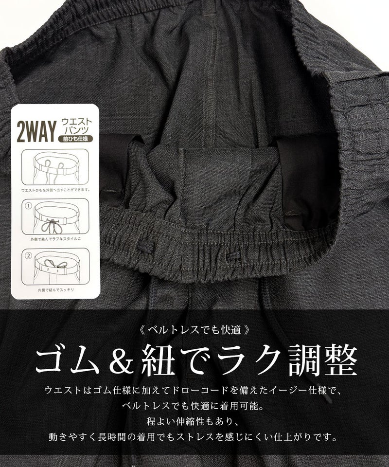 ウエストはゴム仕様に加えてドローコードを備えたイージー仕様で、ベルトレスでも快適に着用可能。