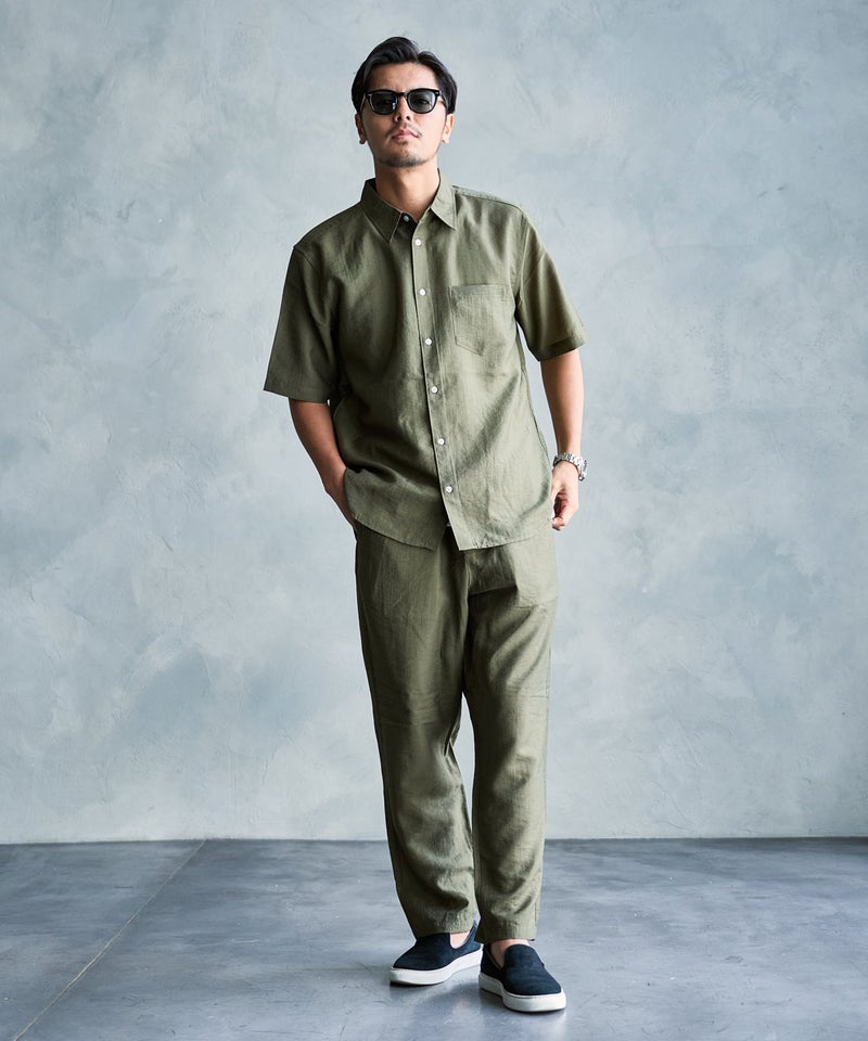 レーヨンをベースにナイロンと麻を混紡した生地は、さらっとした肌触りと軽やかな着心地が魅力。