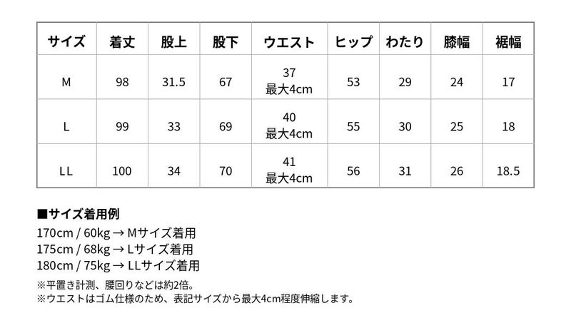 48(LL):着丈100股上34股下70ウエスト41(最大+4cm程度)ヒップ56わたり(もも幅)31膝幅26裾幅18.5