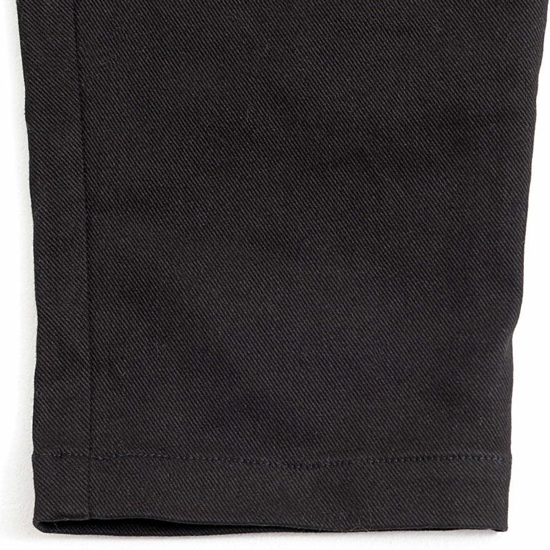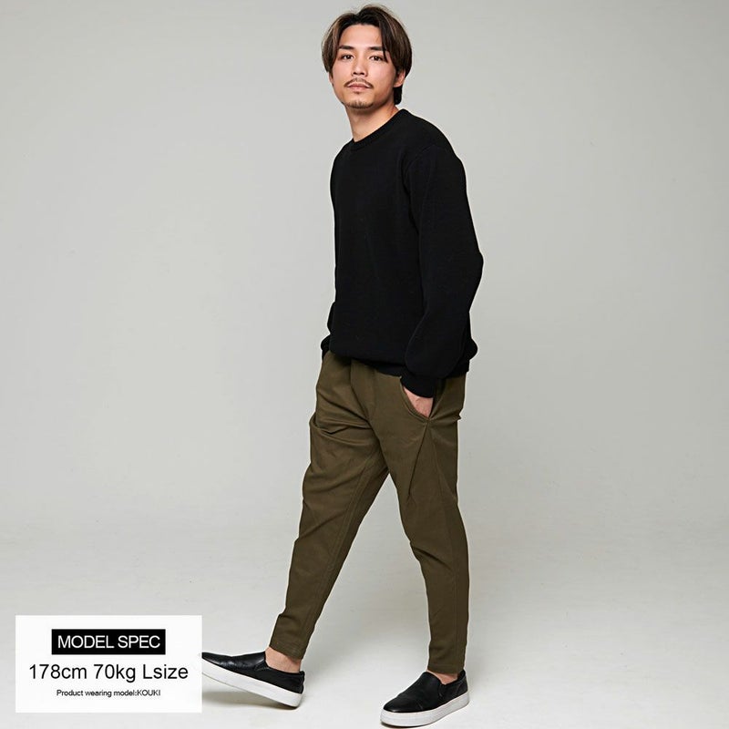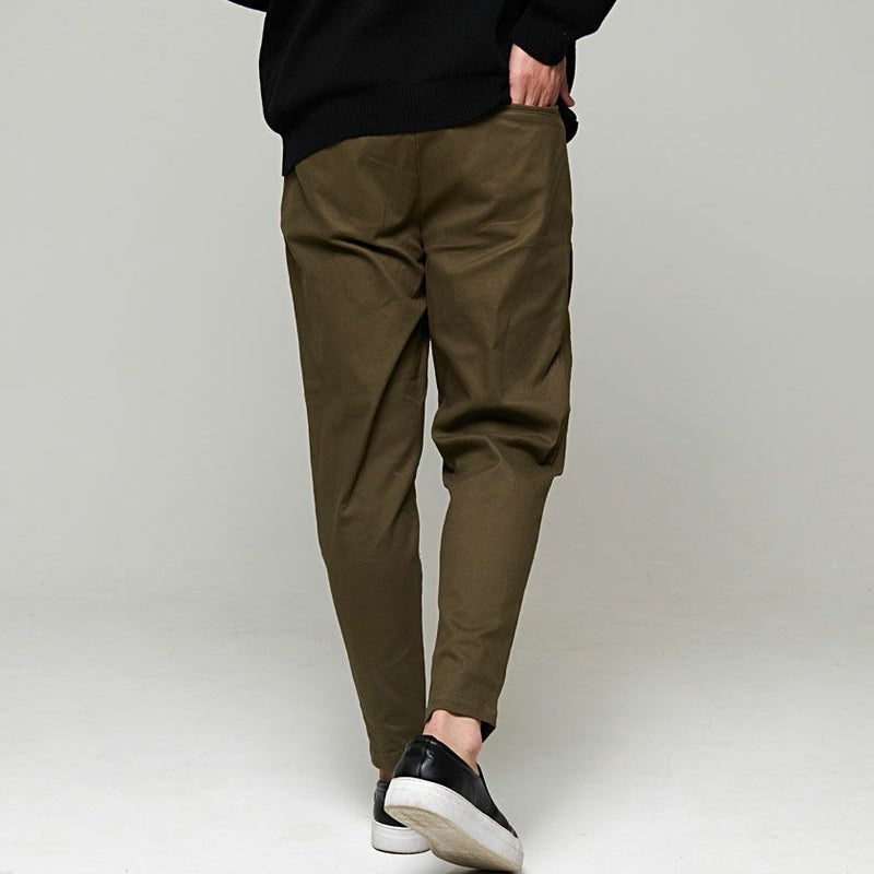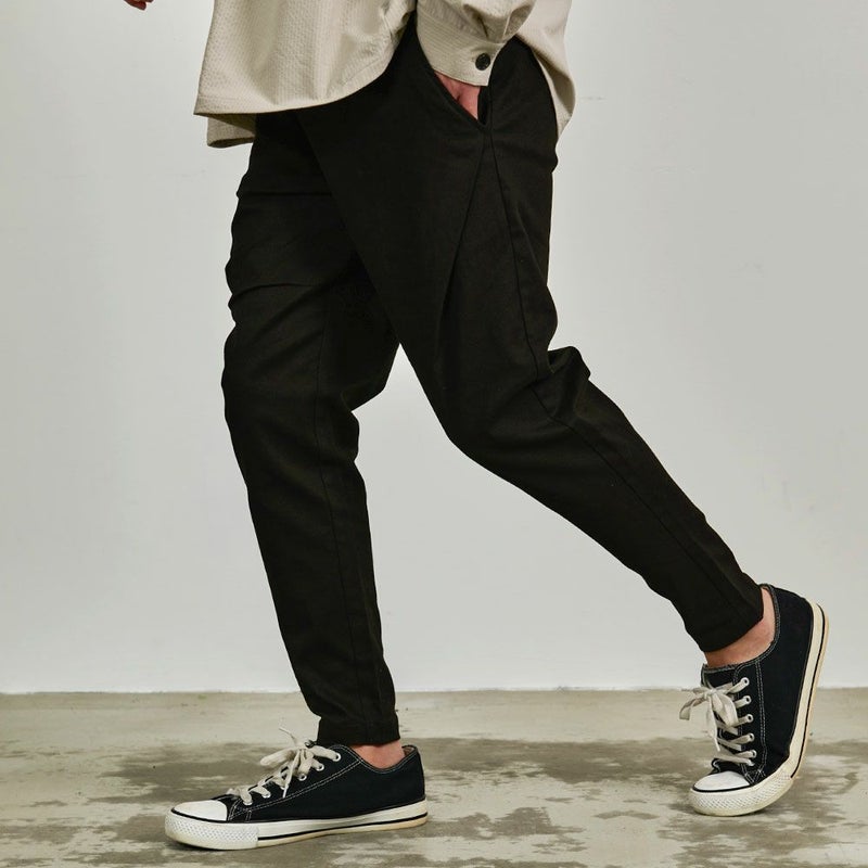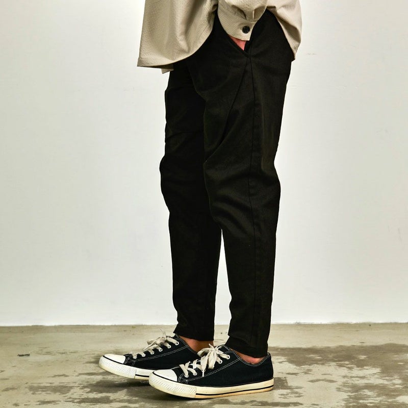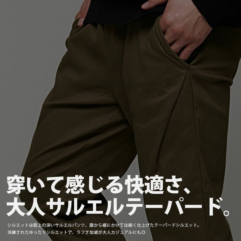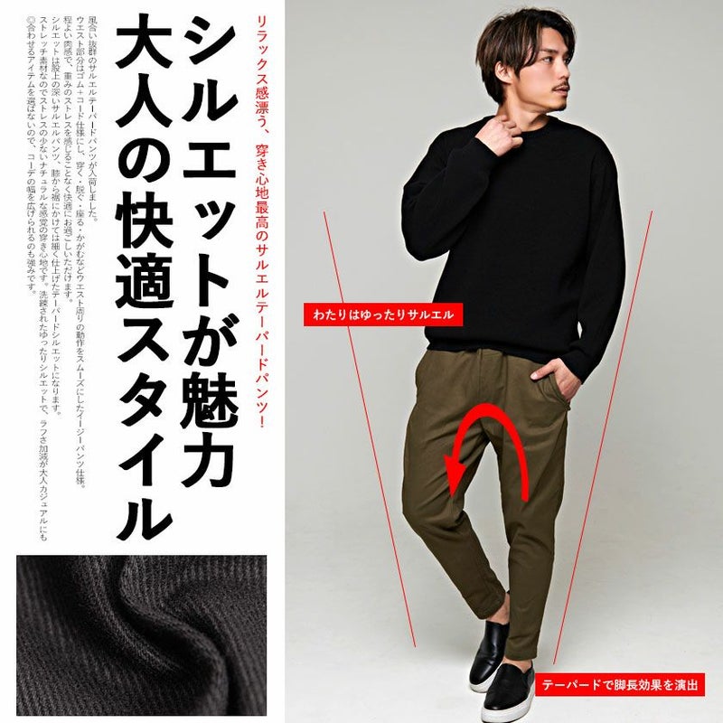シルエットは股上の深いサルエルパンツ、膝から裾にかけては細く仕上げたテーパードシルエットになります。