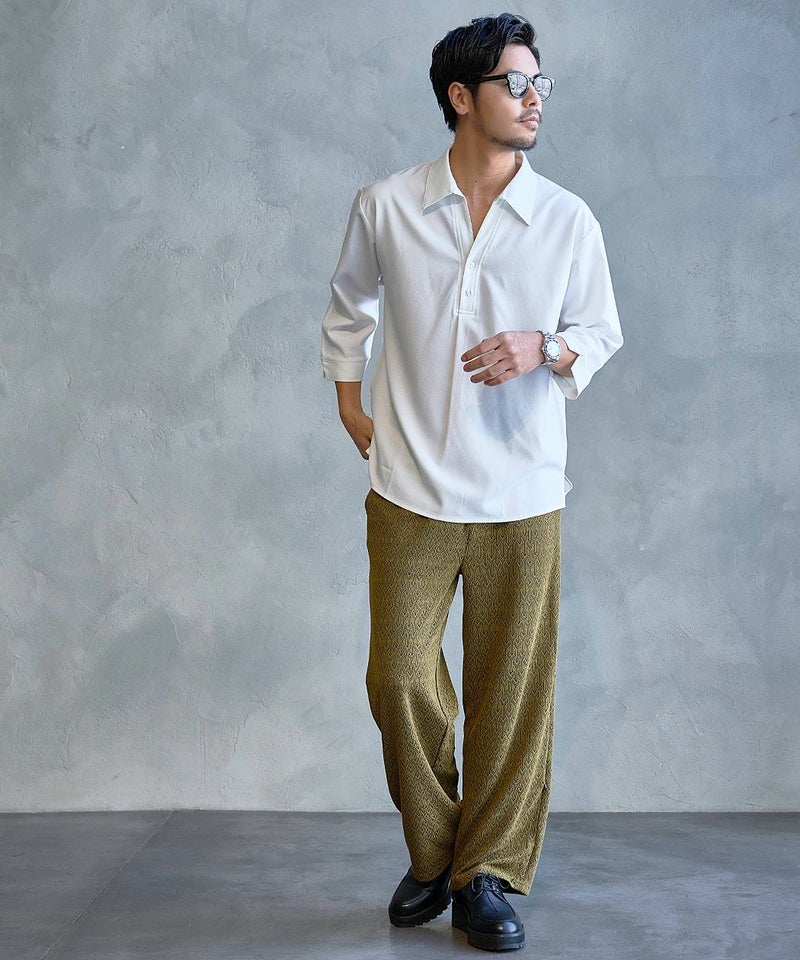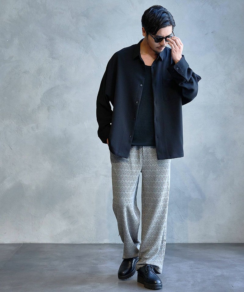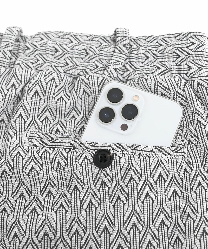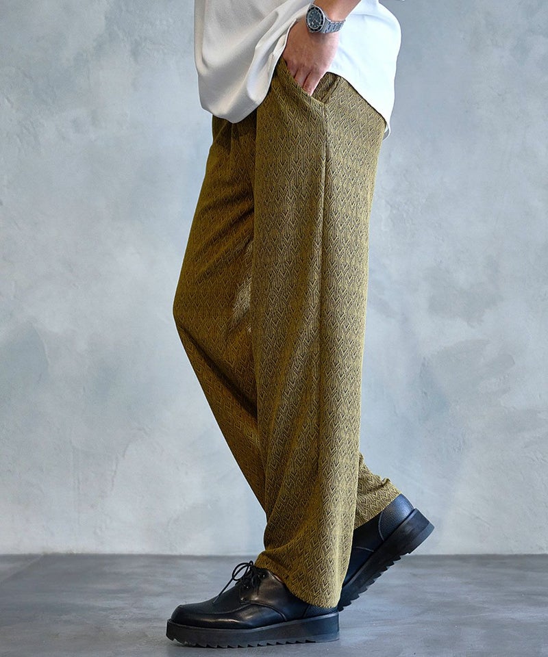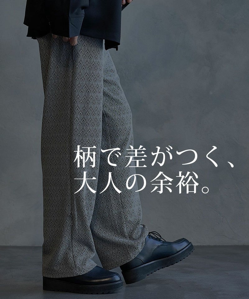 シンプルながら総柄デザインが目を引くイージーパンツ。