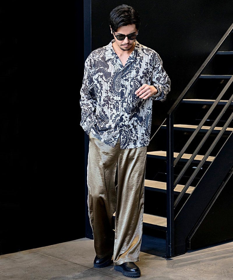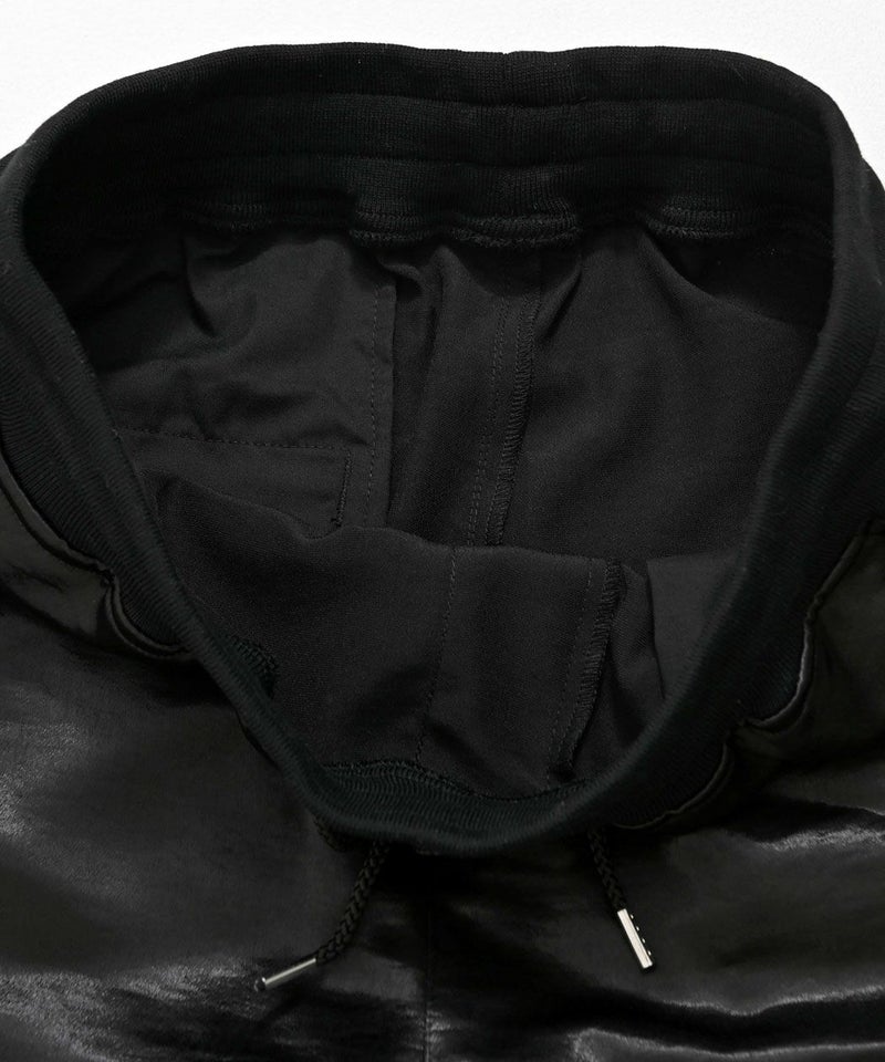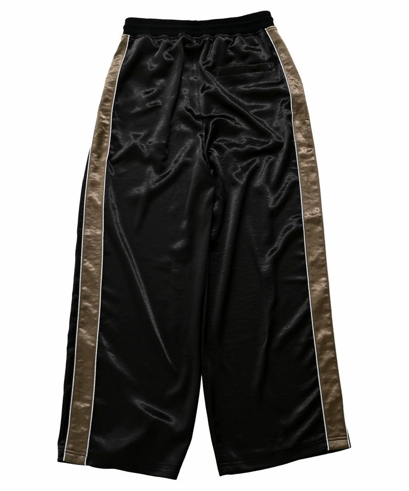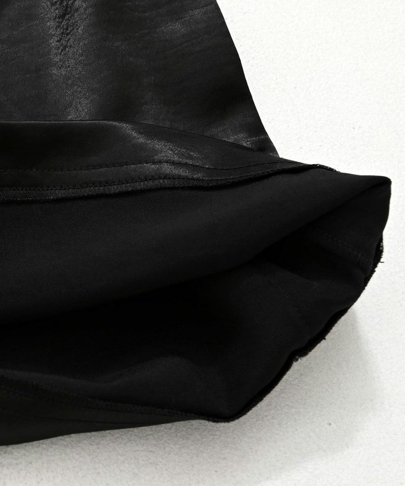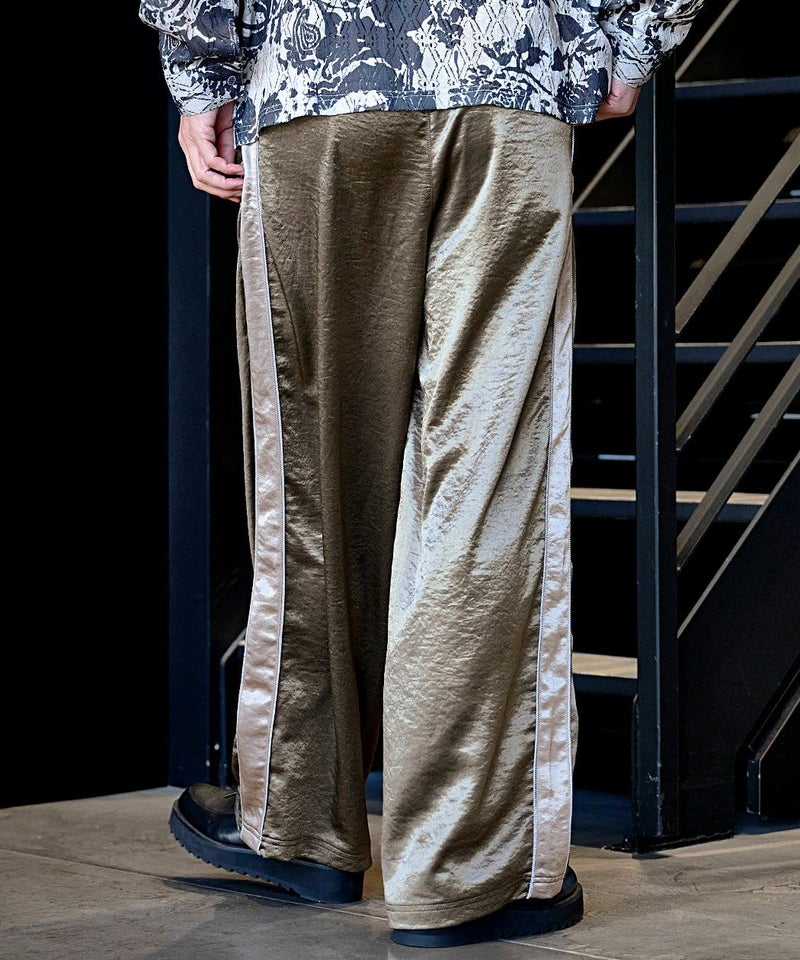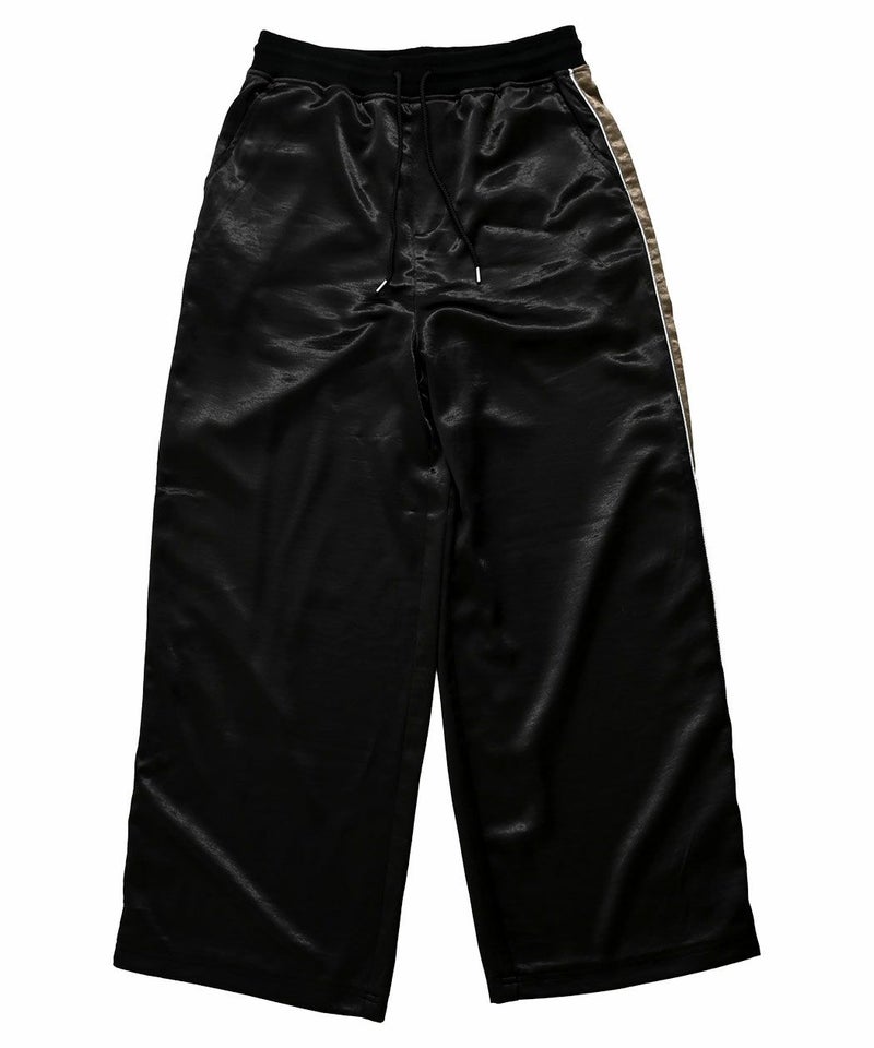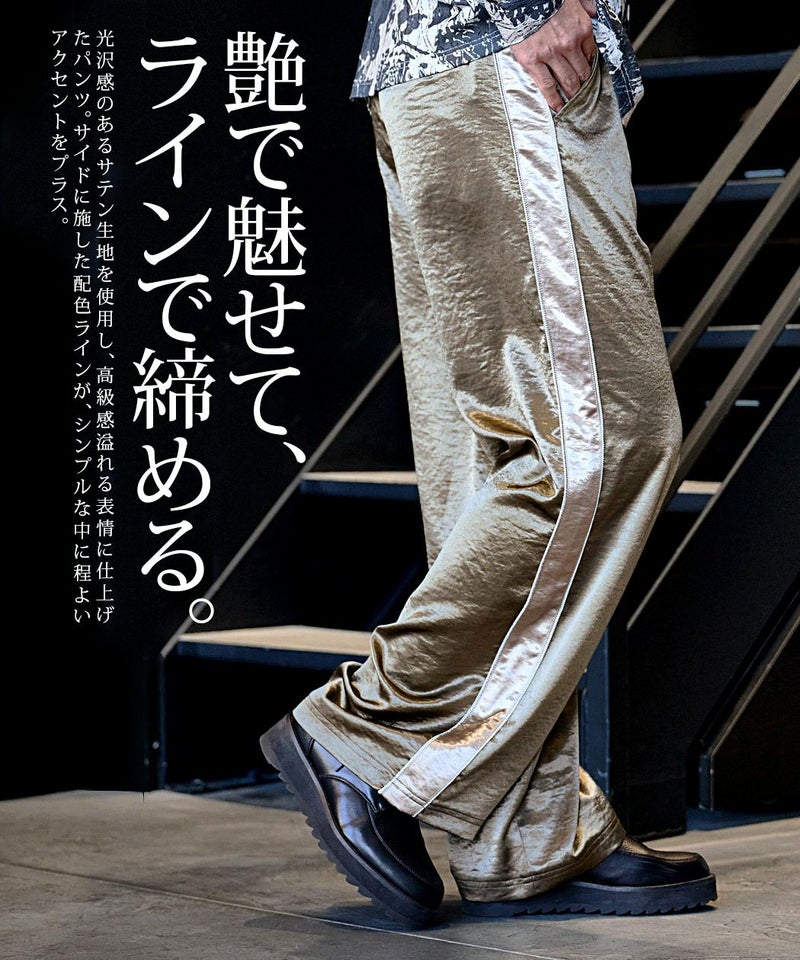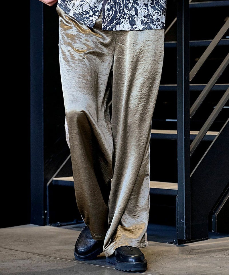 光沢感のあるサテン生地を使用し、高級感溢れる表情に仕上げたワイドパンツ。