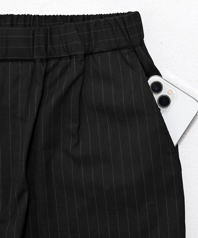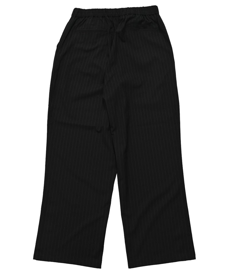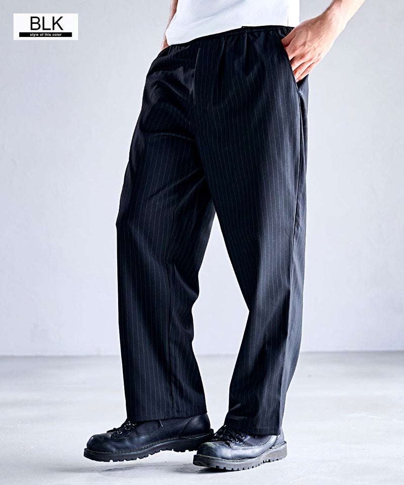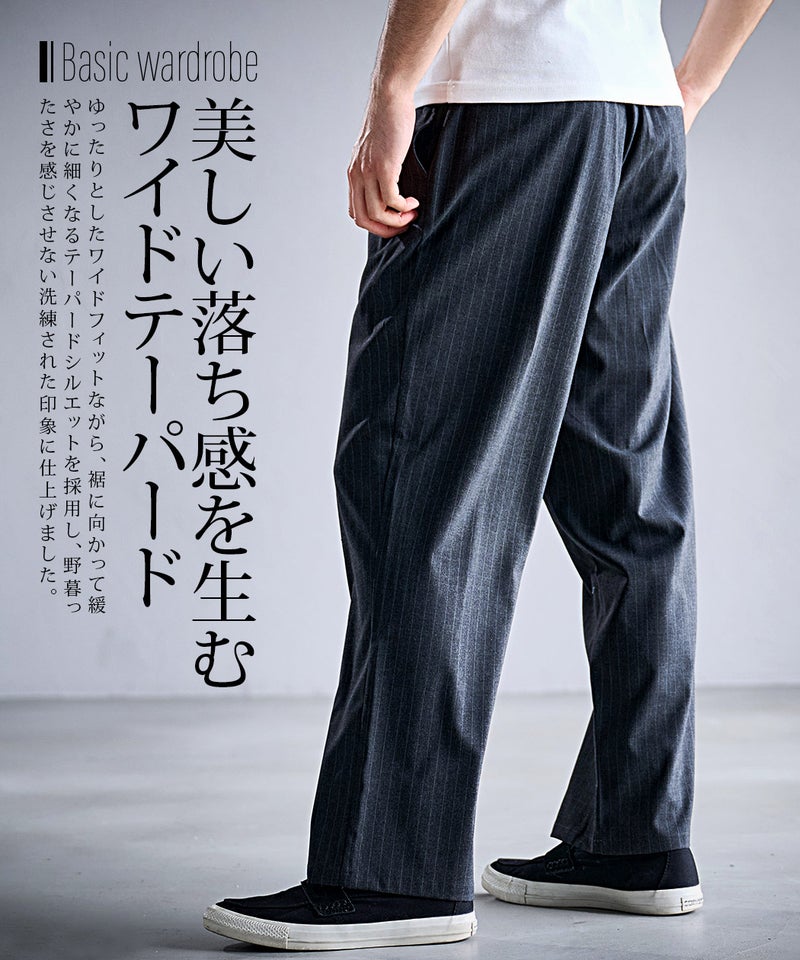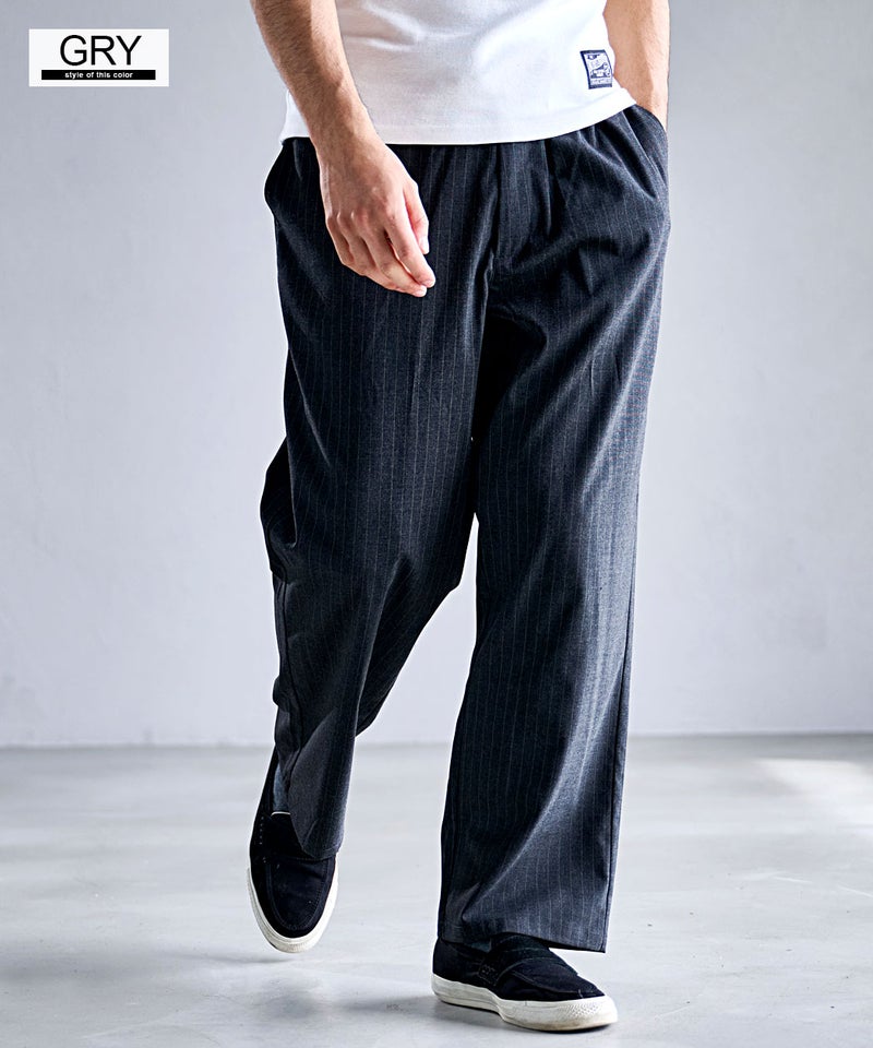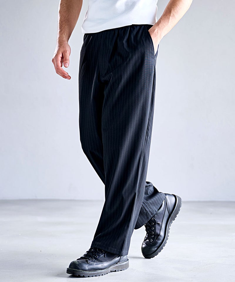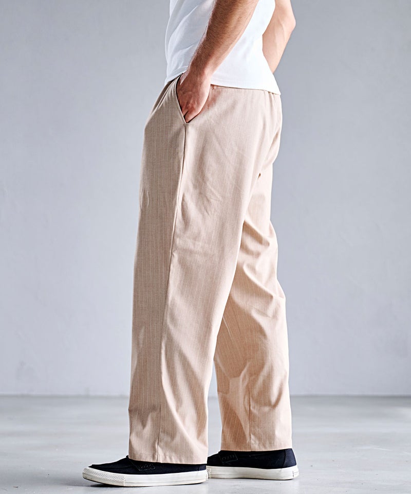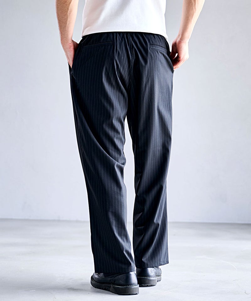 ストレッチの効いた素材を使用したストライプ柄のワイドパンツ。