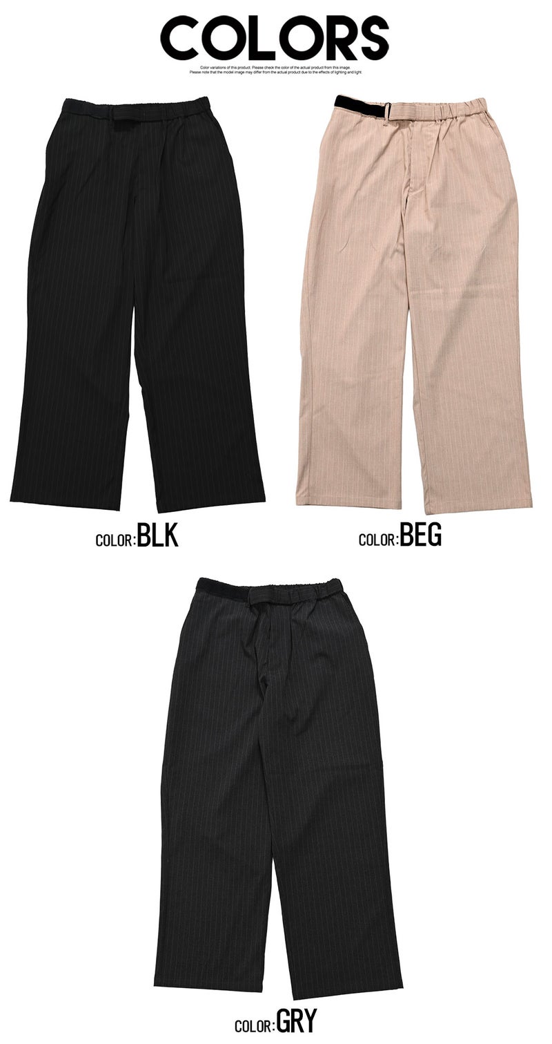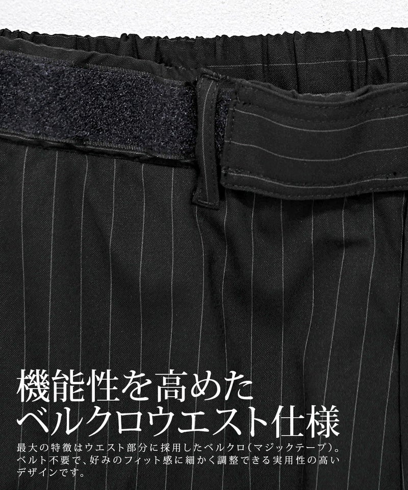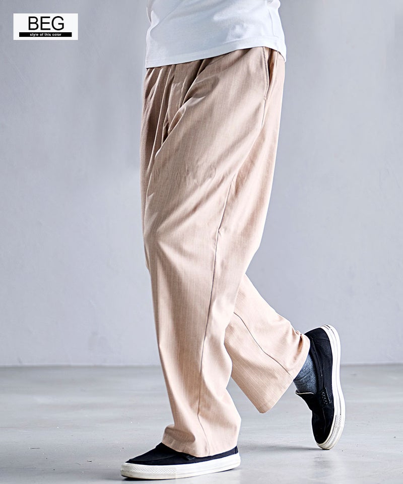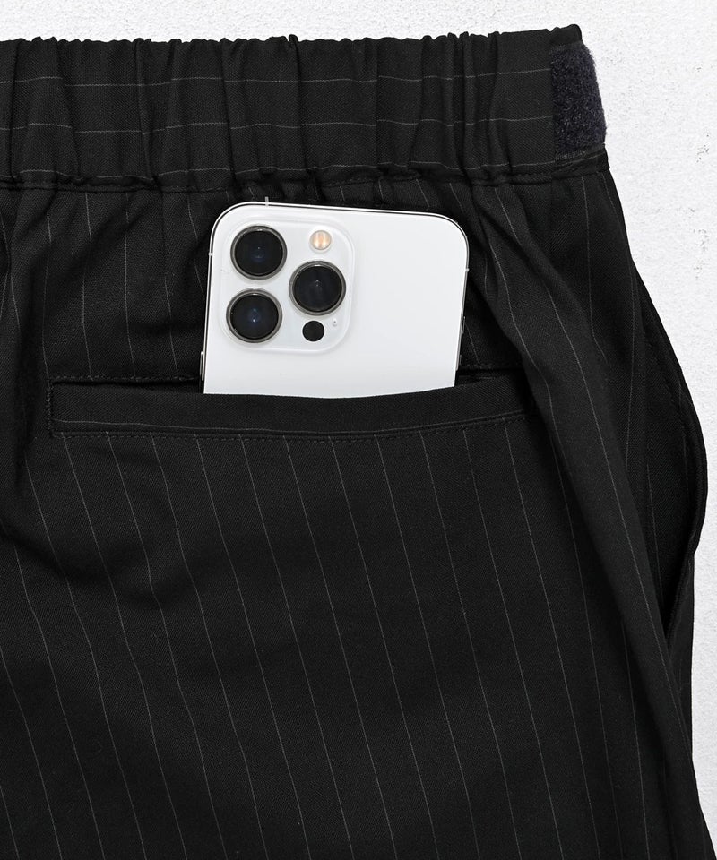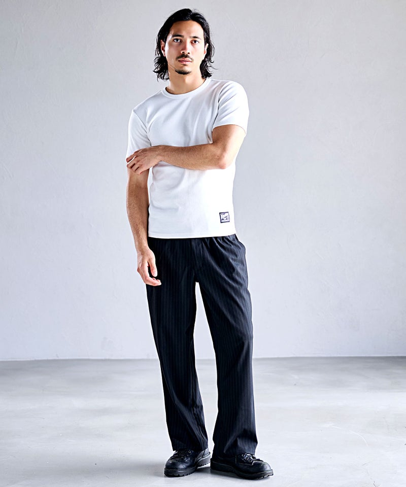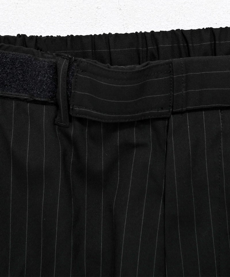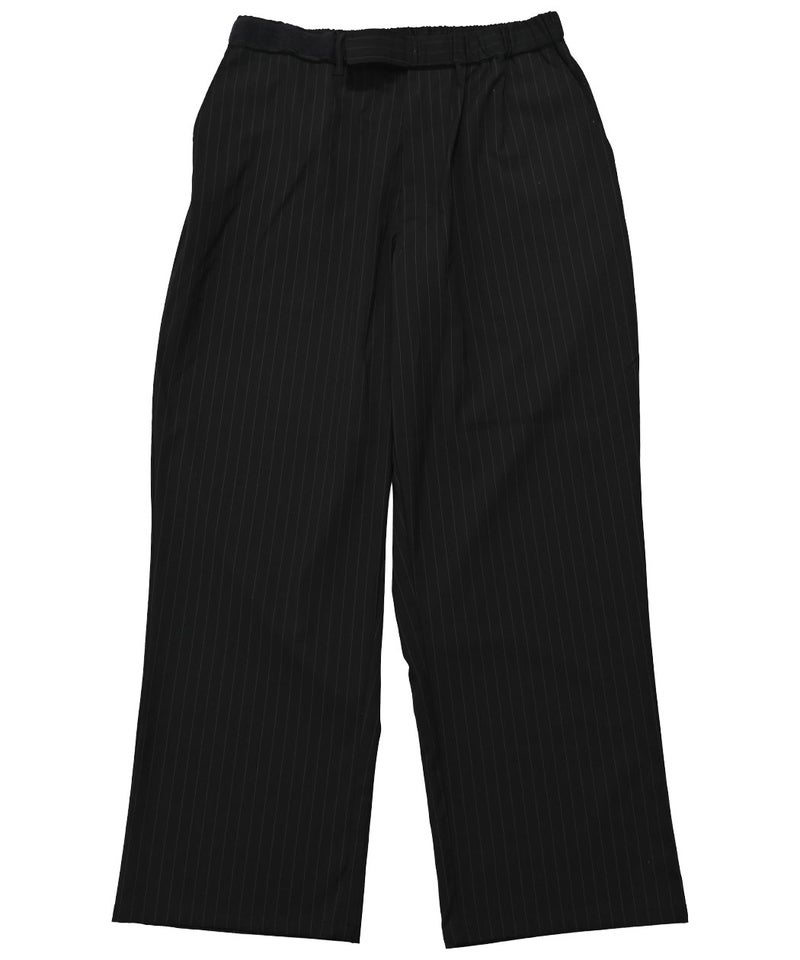 ストレッチの効いた素材を使用したストライプ柄のワイドパンツ。